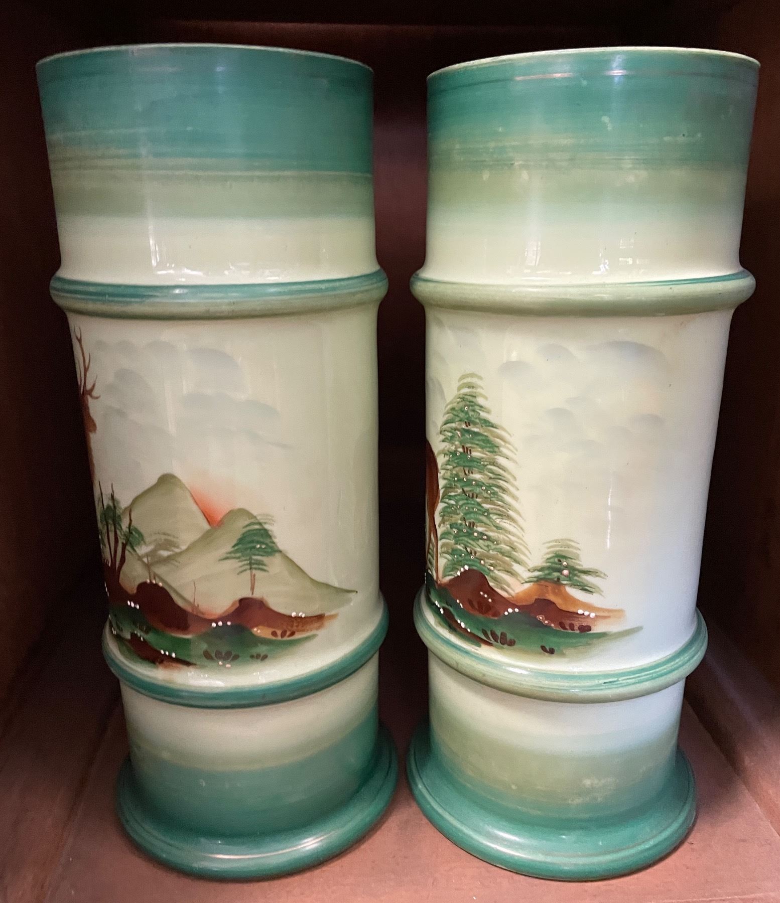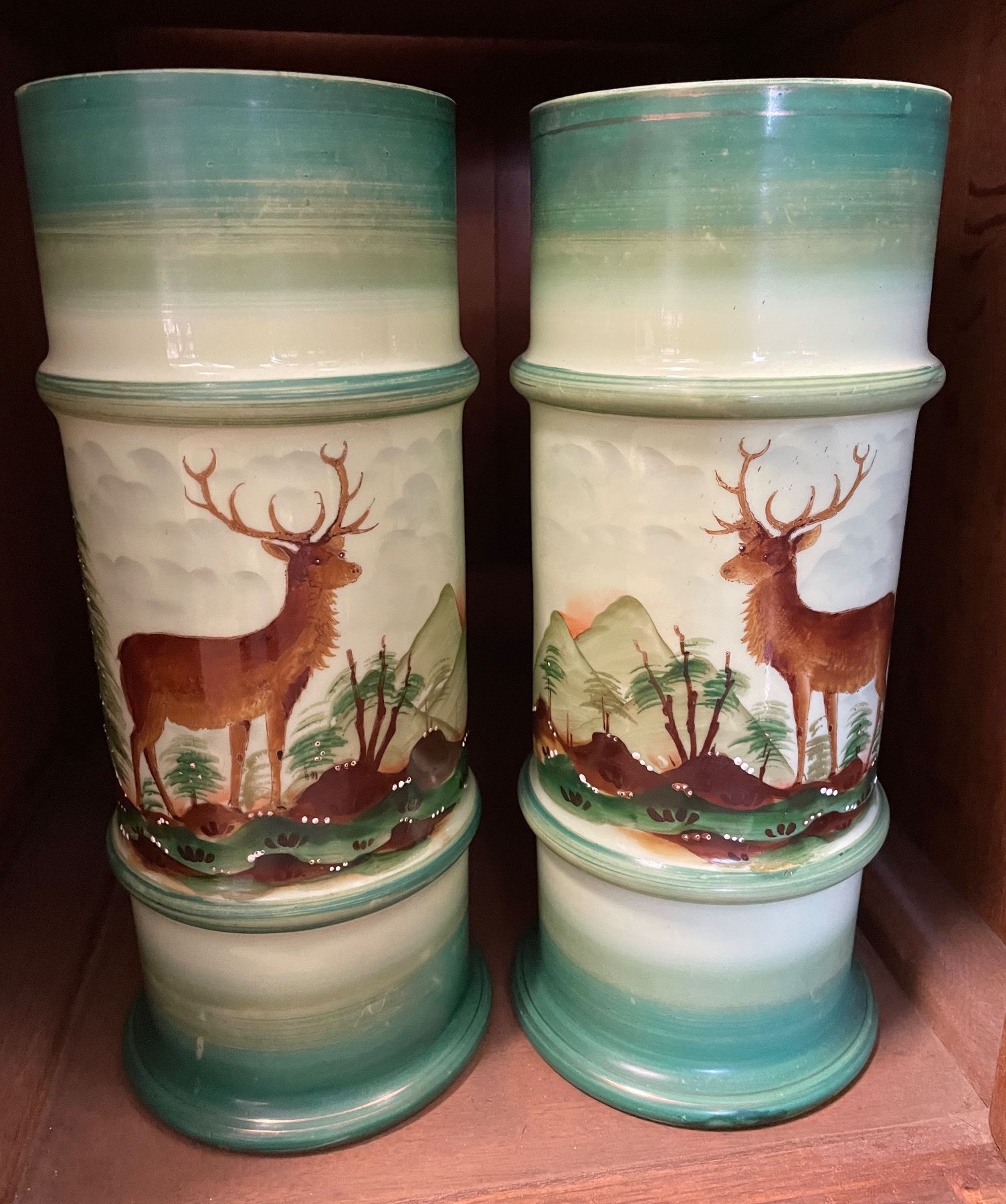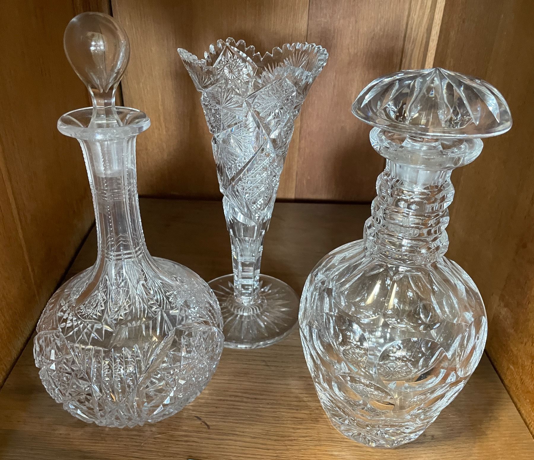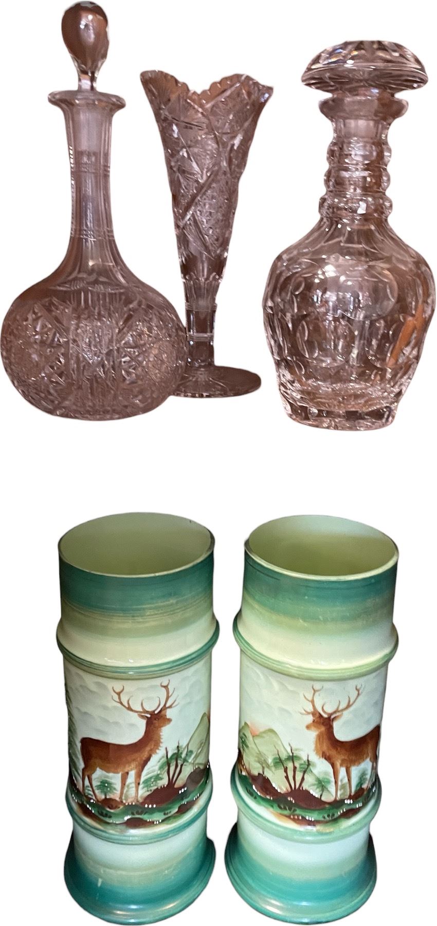 Cut Glass Decanters, Vase & Deer Motif Tumblers