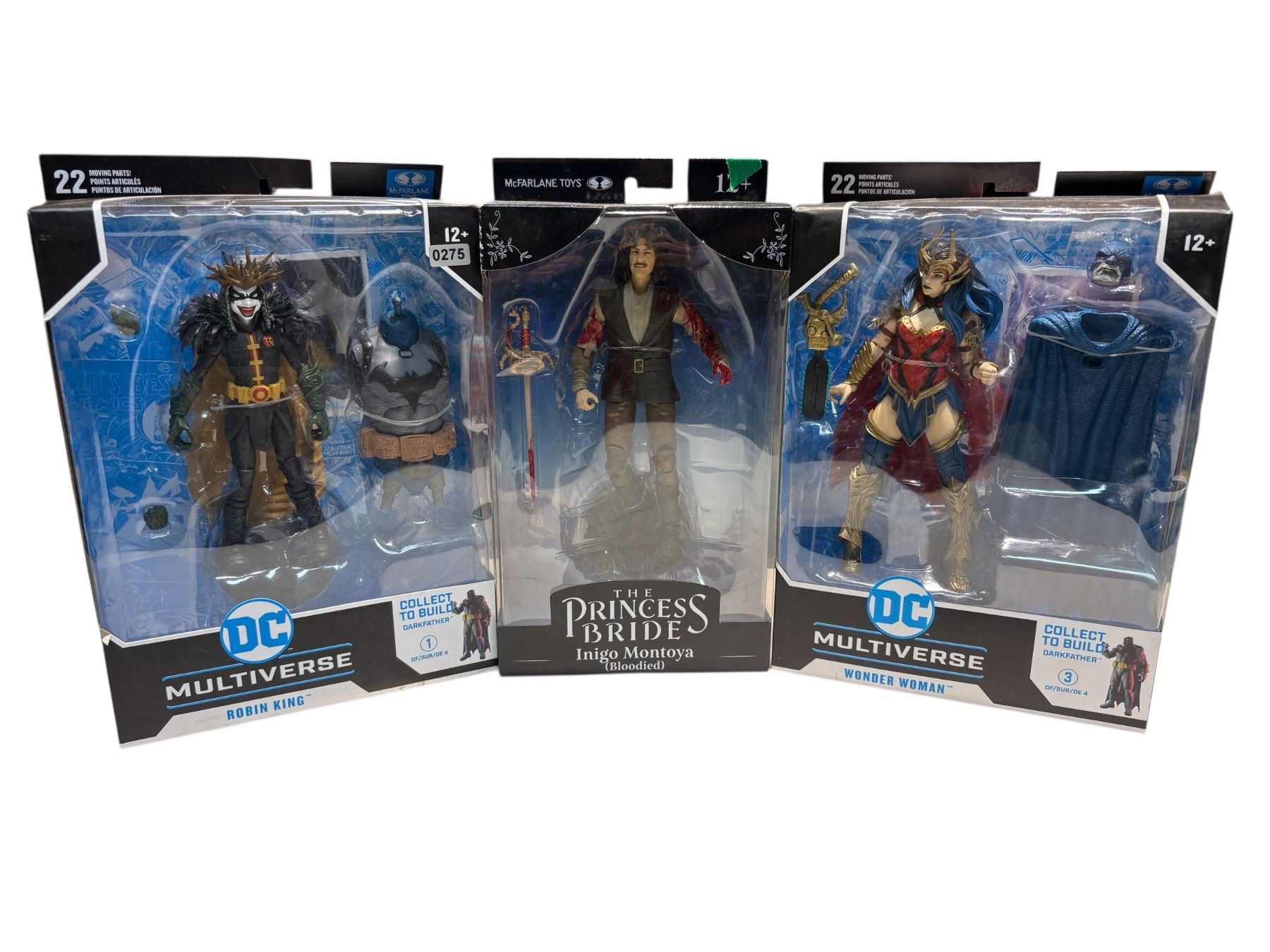 Collection includes DC Multiverse Robin King and Wonder Woman action figures, along with The Princess Bride Inigo Montoya (Bloodied version) figure. All figures are boxed and part of officially licensed collector series.