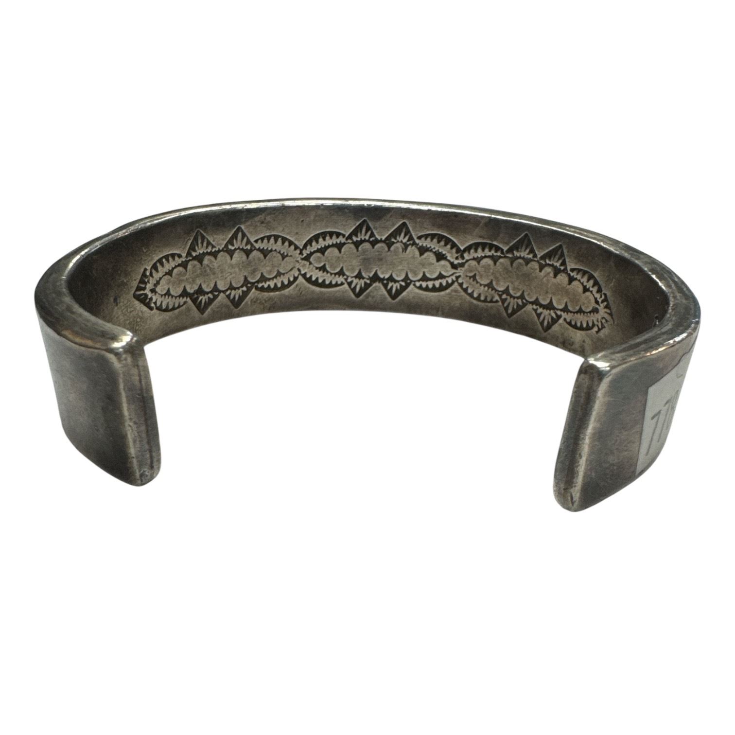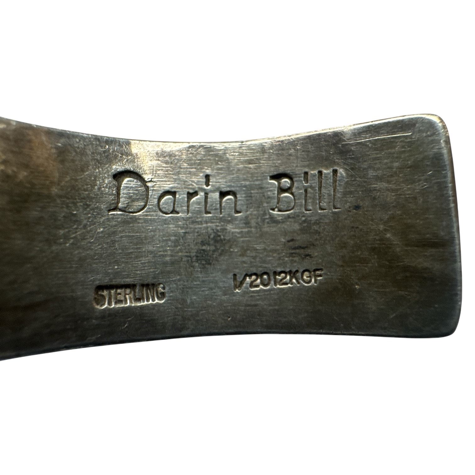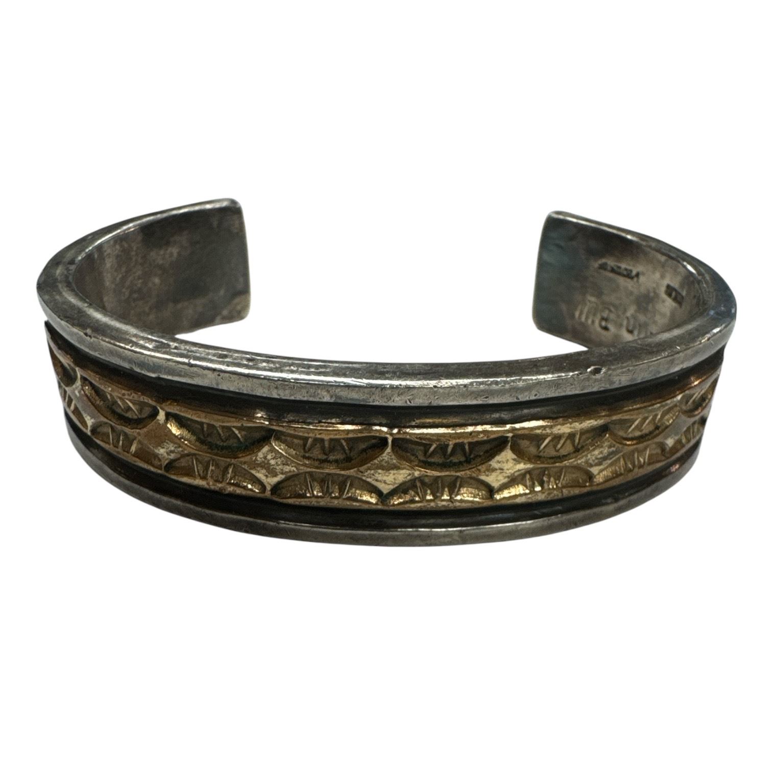 Sterling silver Navajo bracelet by artisan Darin Bill, featuring 1/20 12KGF (12 Karat Gold Filled) design elements. Weighs 99 grams. Traditional Navajo craftsmanship with intricate details. Item is as pictured.