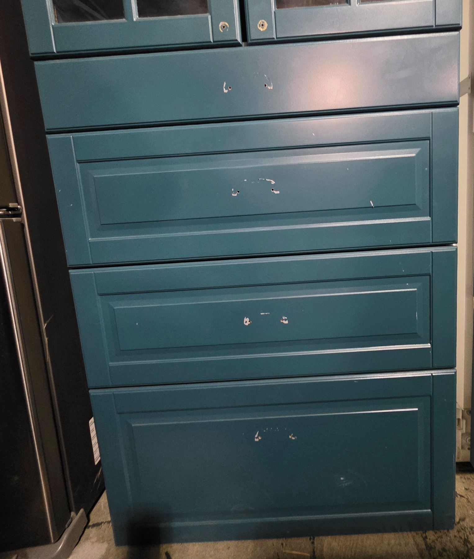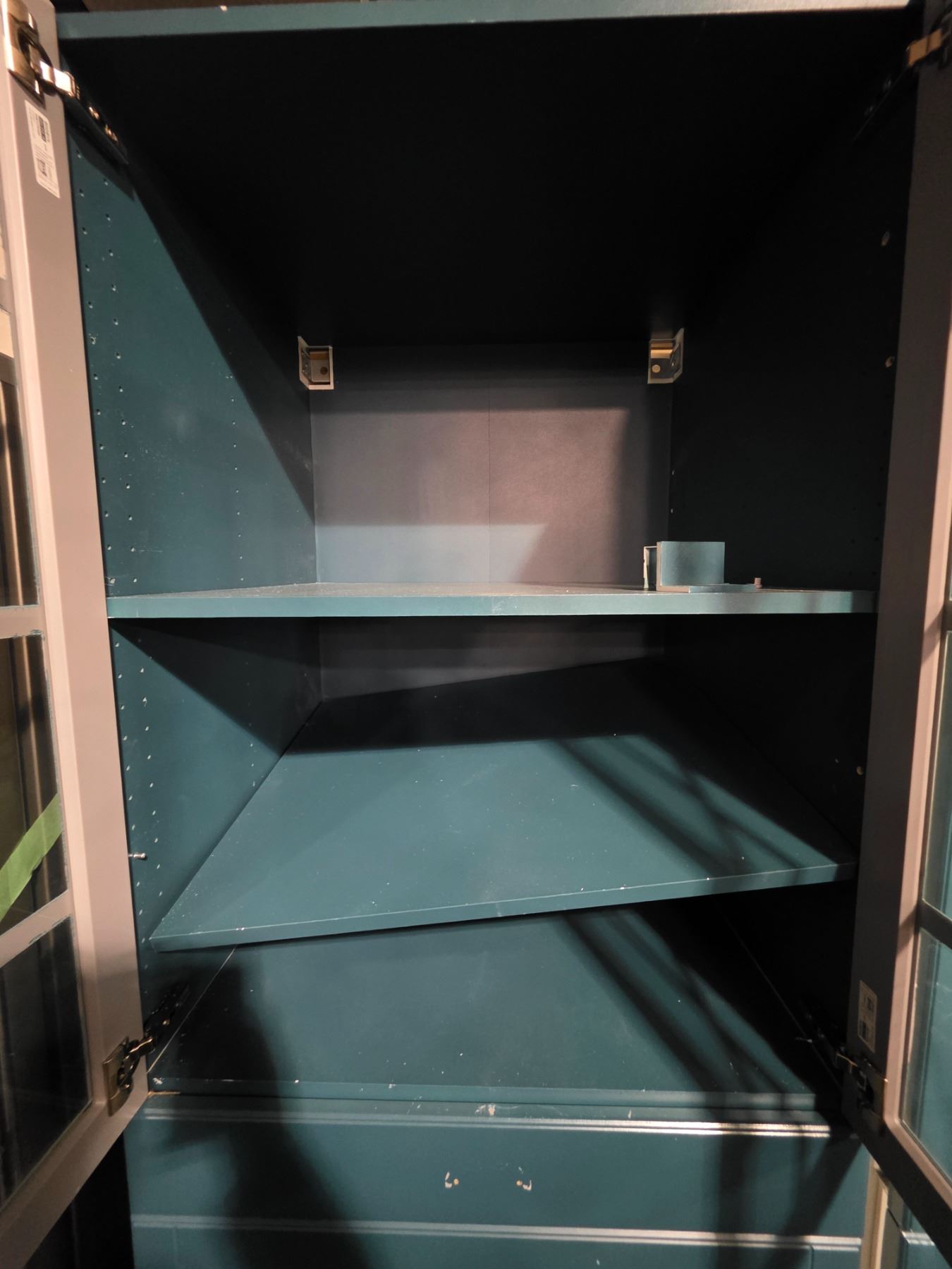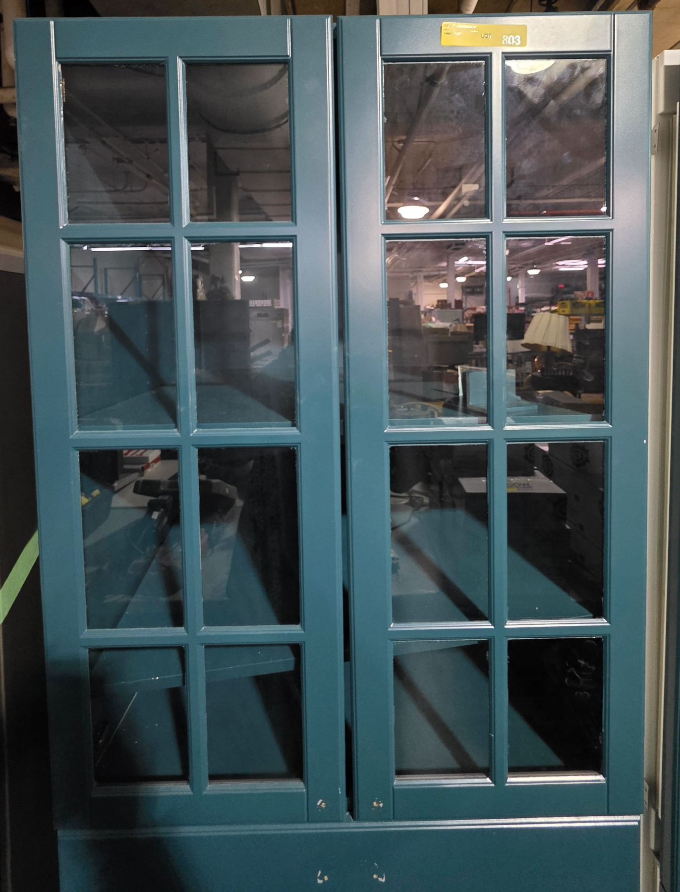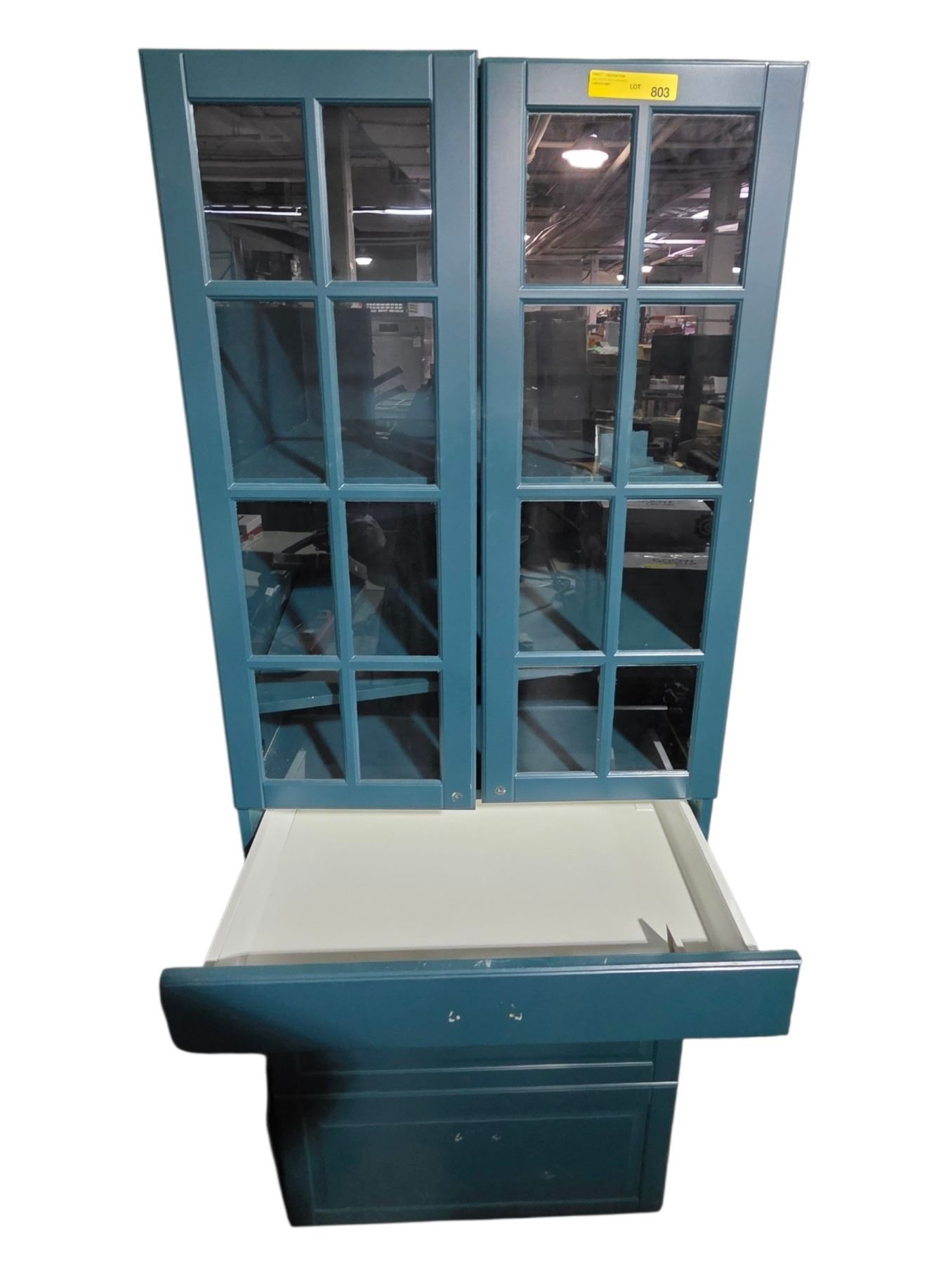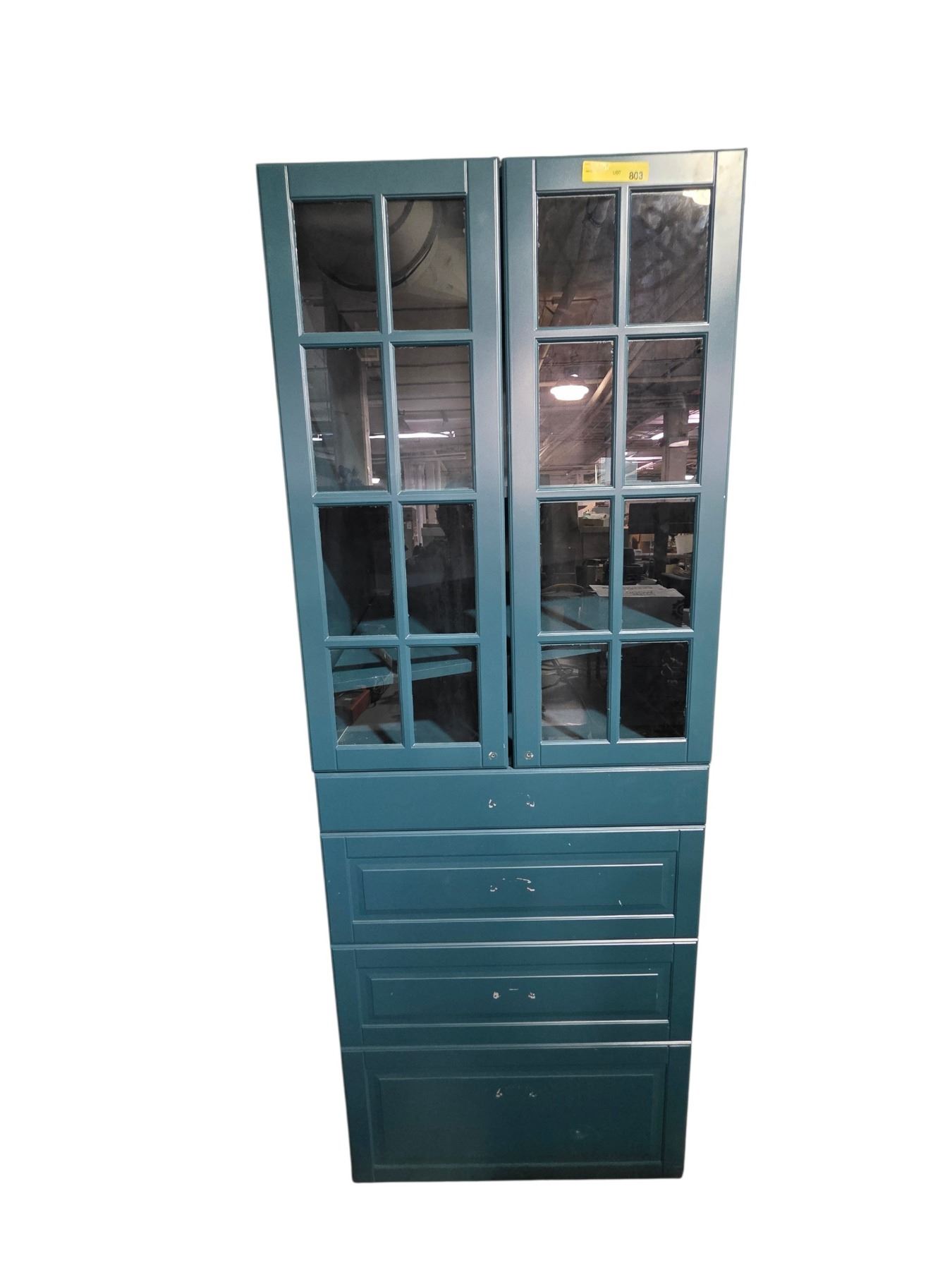 Dark Blue Glass Display Kitchen Cabinet - approx. 30" x 80" H (Handles are missing)