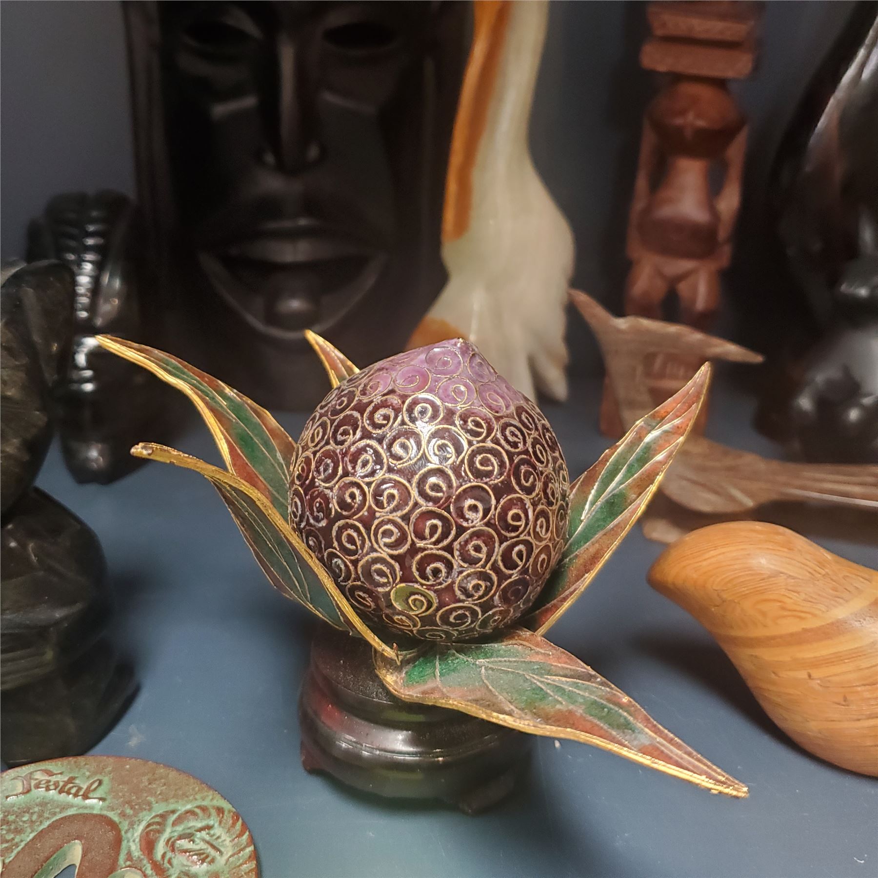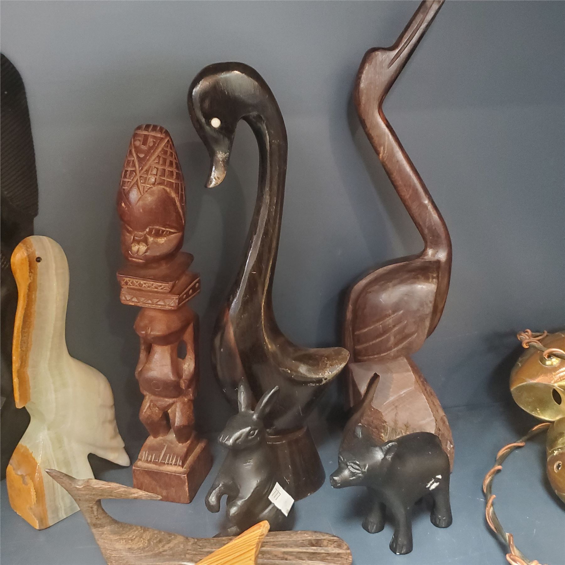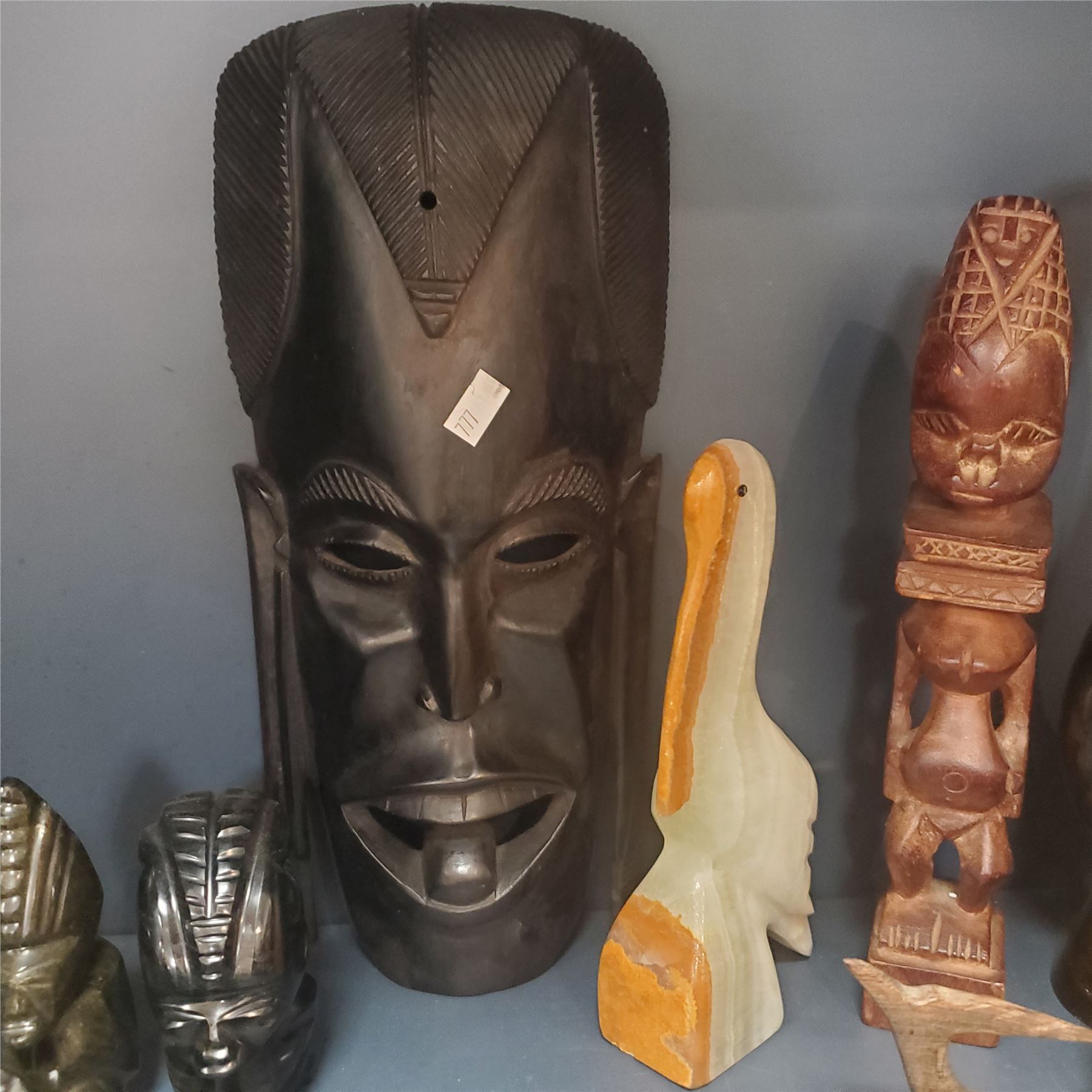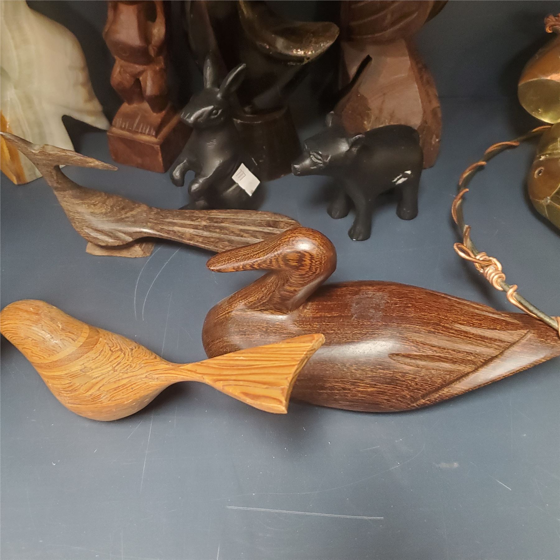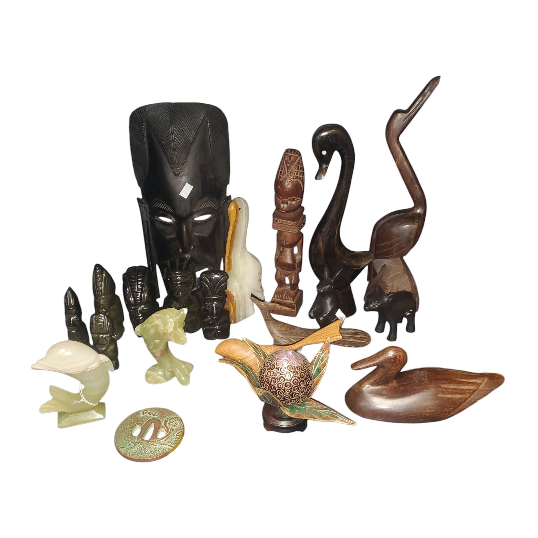 Lot includes decorative collectables featuring cloisonne pieces, wood sculpture, masks with South American influence, bird and dolphin designs, and additional varied items. Items are as pictured and display cultural and artistic craftsmanship.