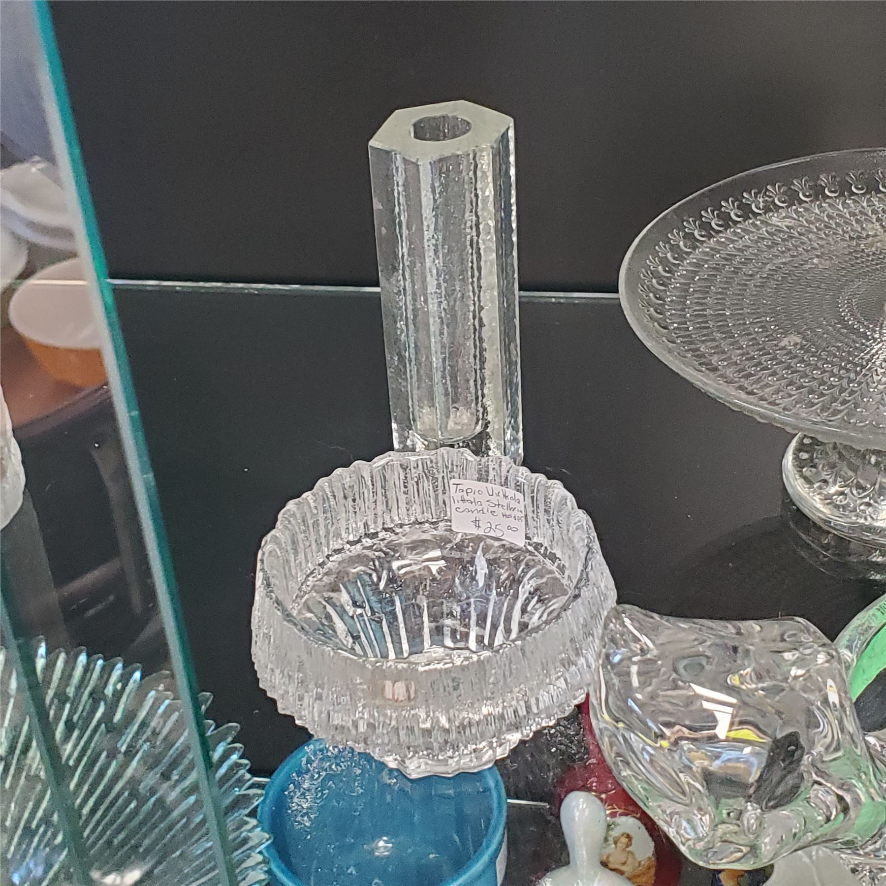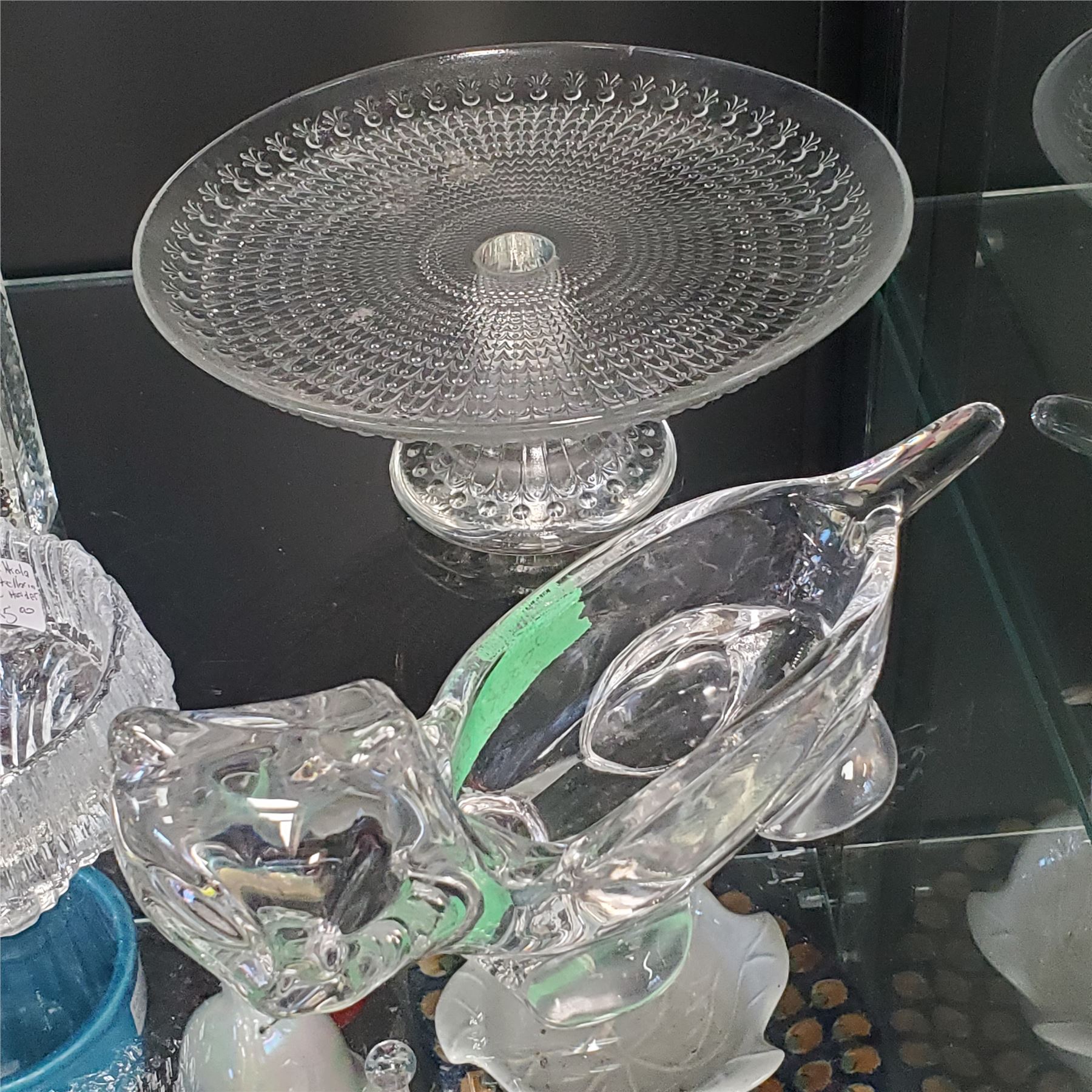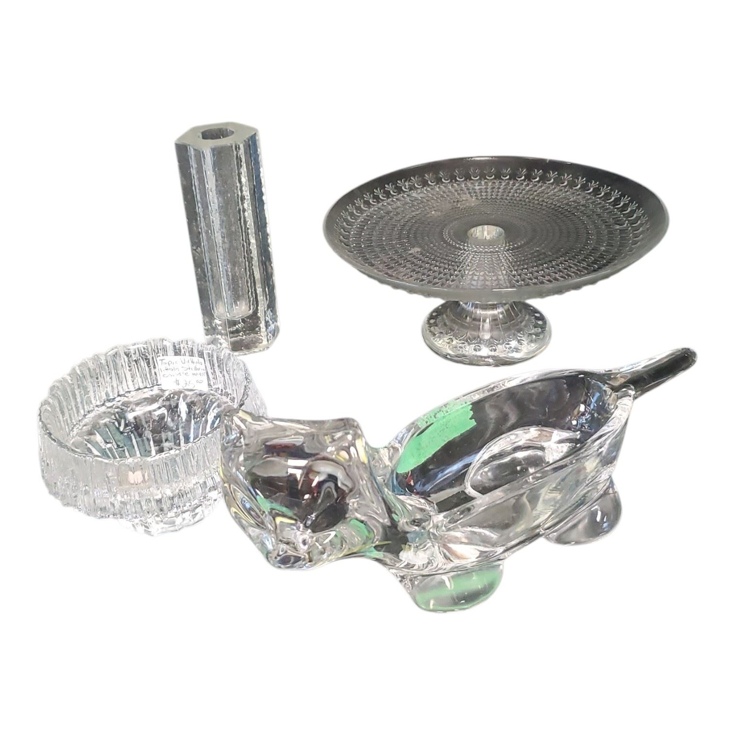 Lot of decorative clear glass pieces including a Sasaki glass cat figurine, a design by Tapio Wirkkala, a Mikasa clear glass item, and an unsigned vase. The pieces showcase varied artistic glass designs. The piece is unsigned. Items are as pictured.