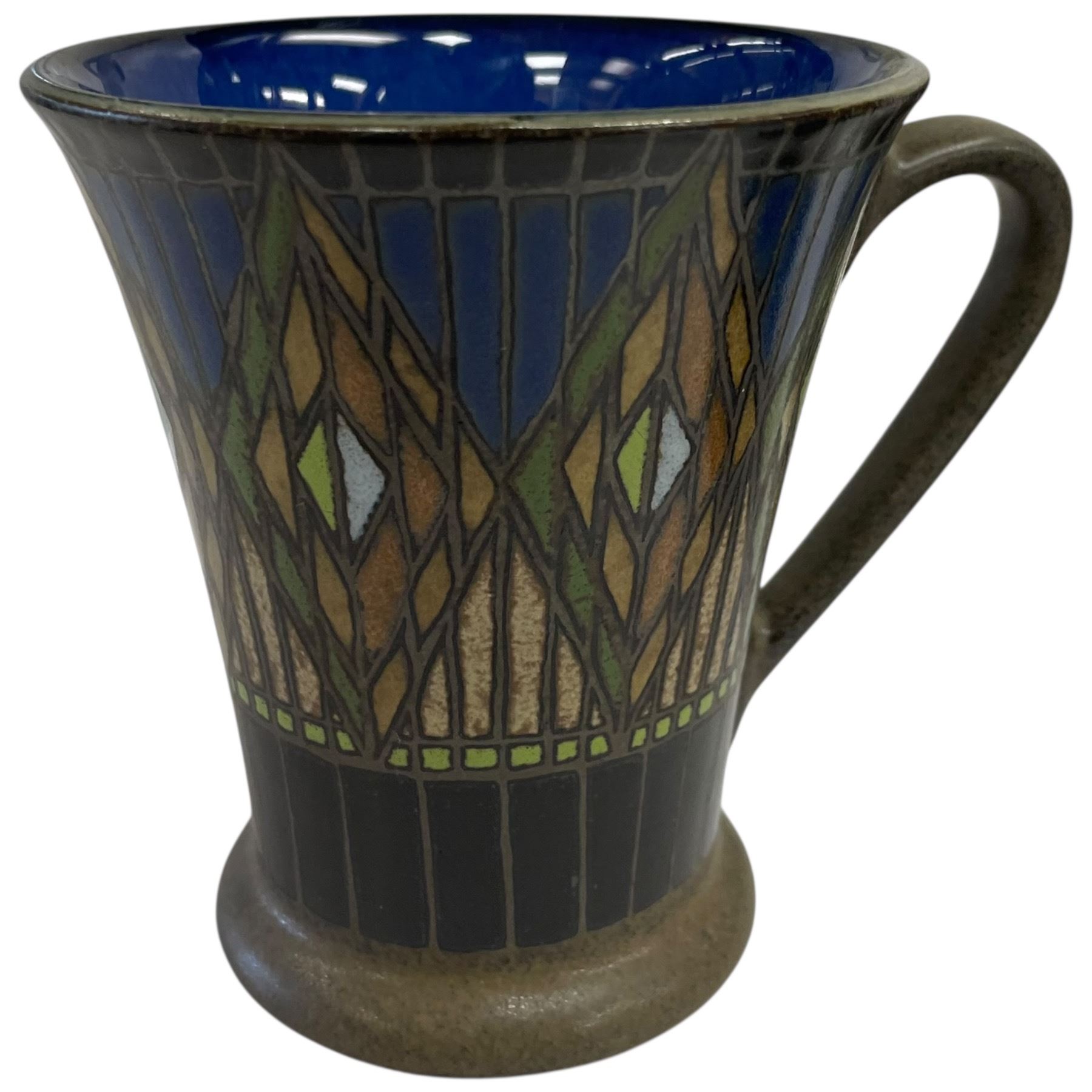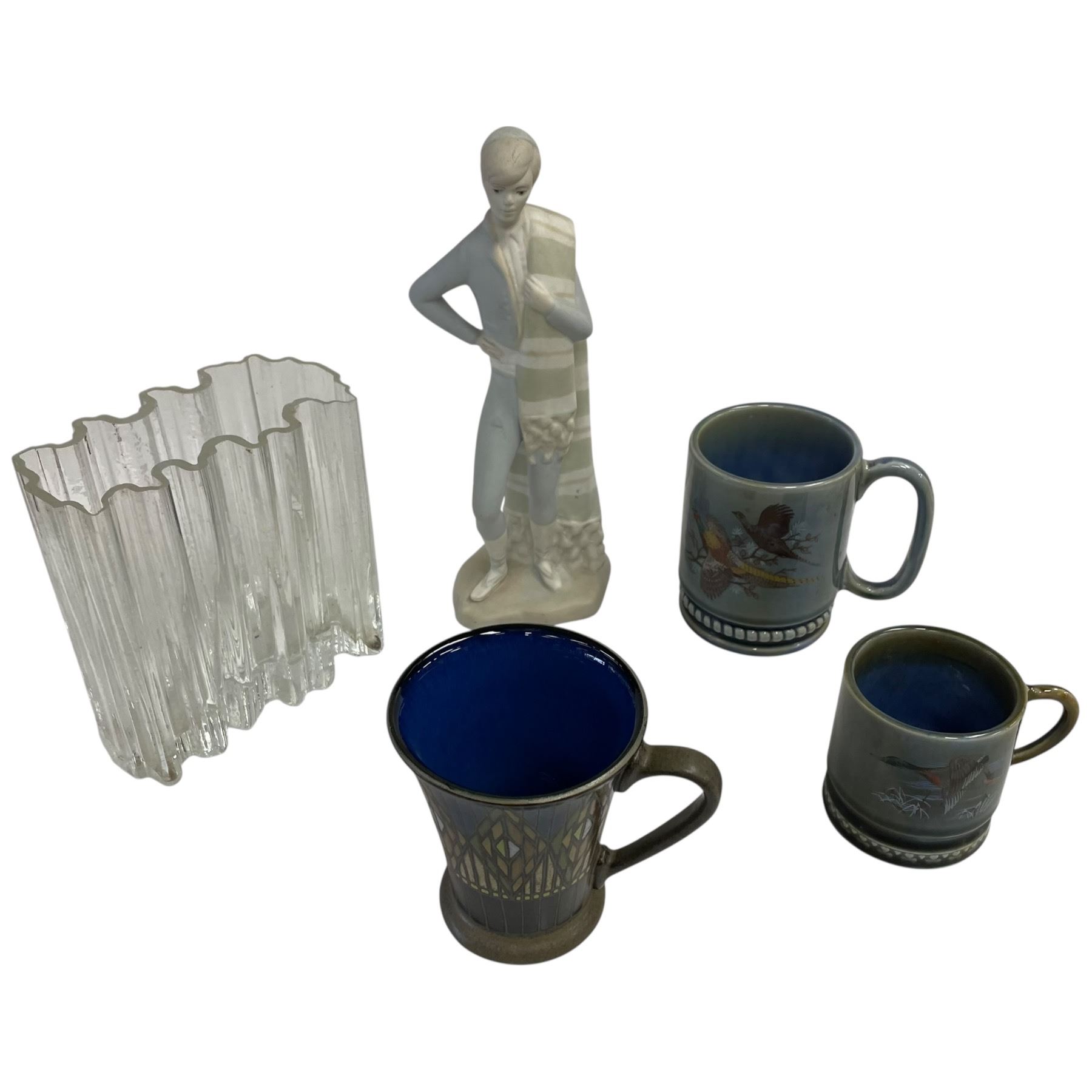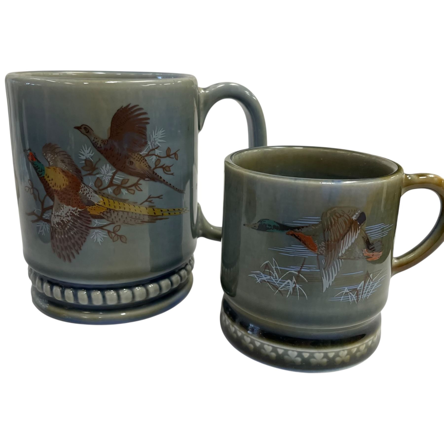 Decorative collection featuring Wade pheasant-themed mugs, a vase in the Tapio Wirkkala style, a Denby ceramic mug and a Porceval figurine measuring 10-Inch tall. Items showcase diverse designs and materials as pictured.