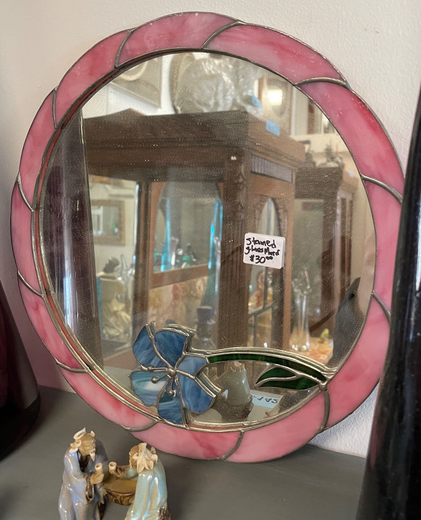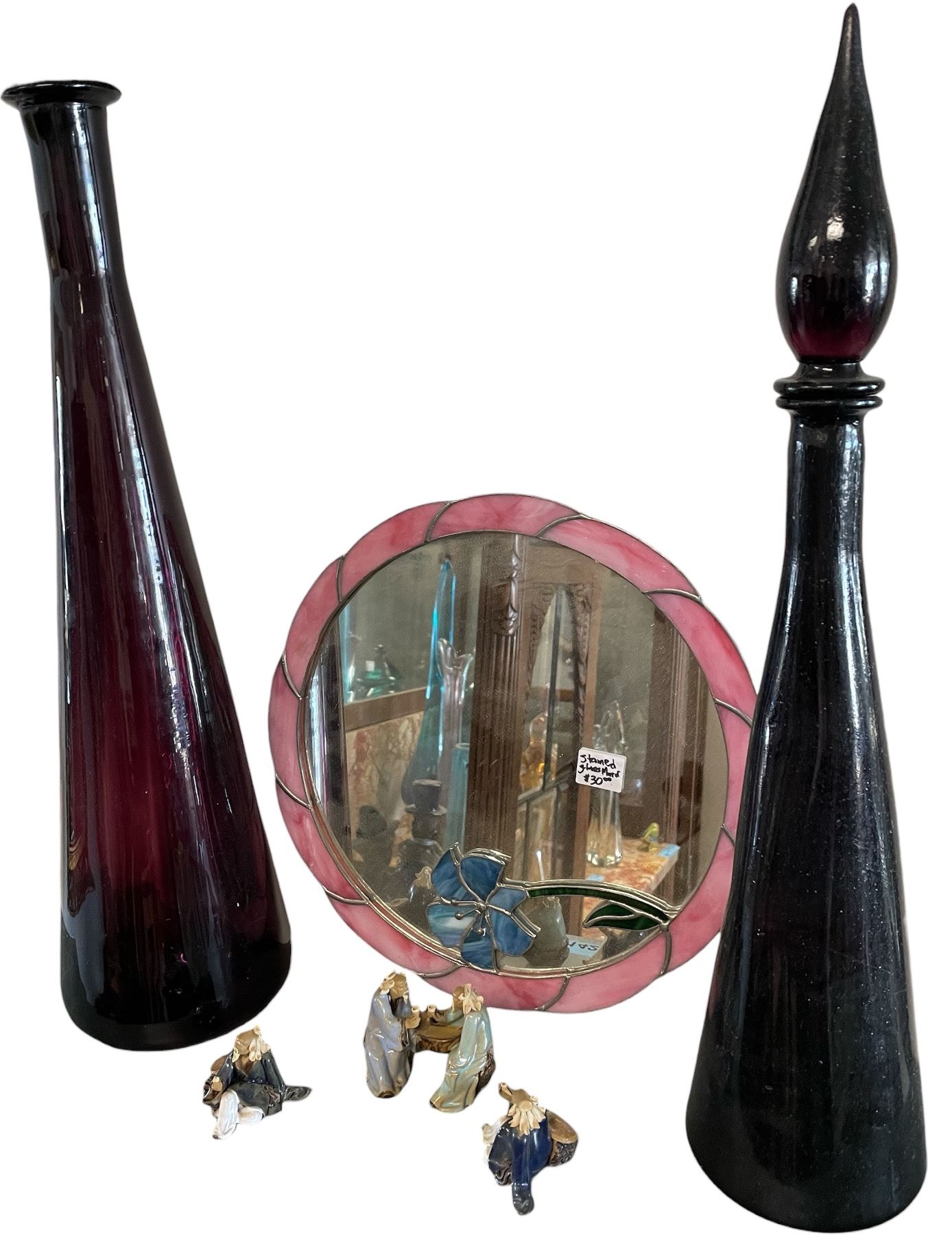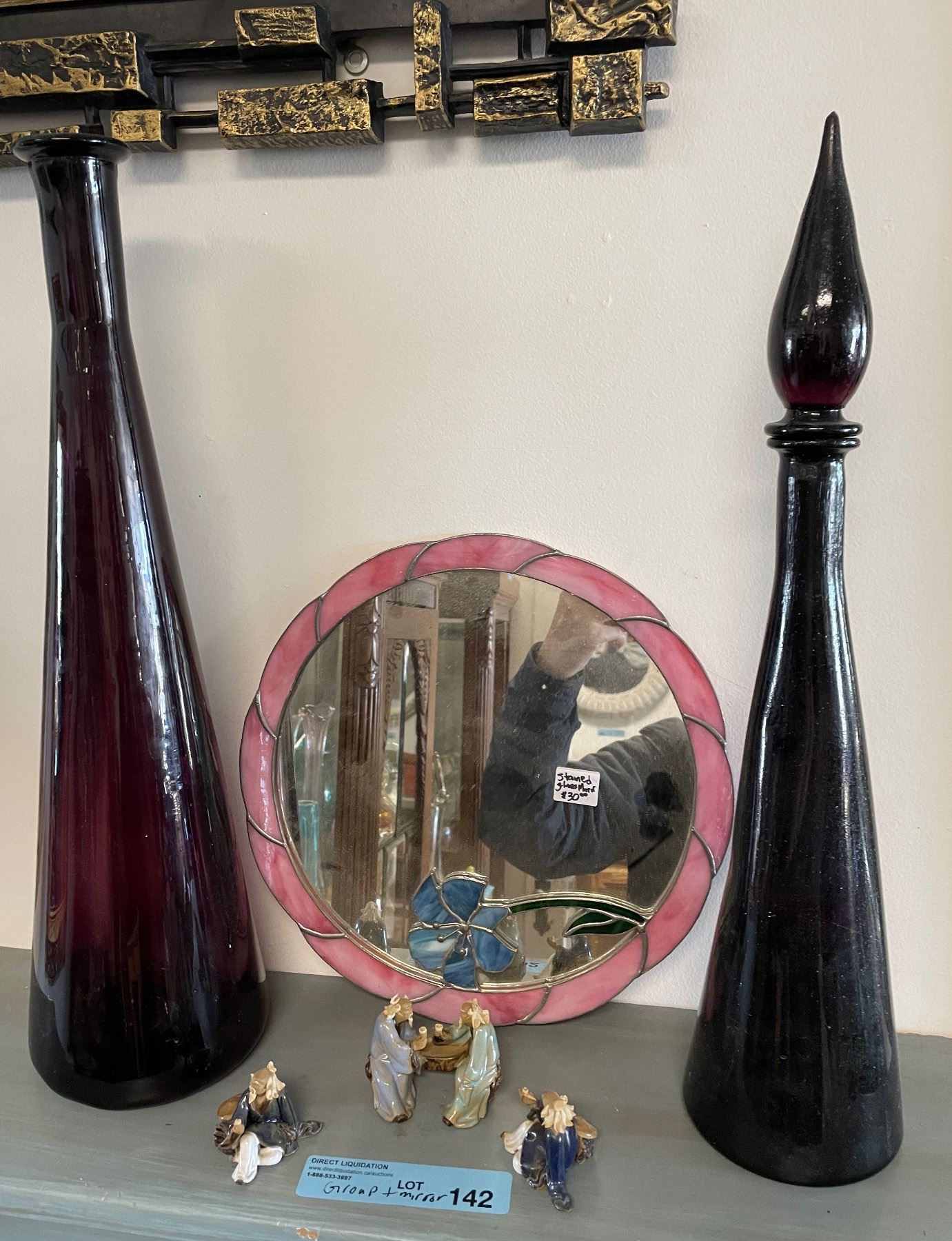 Decorative Glass Vases, Stained Glass Mirror & Figurine Group