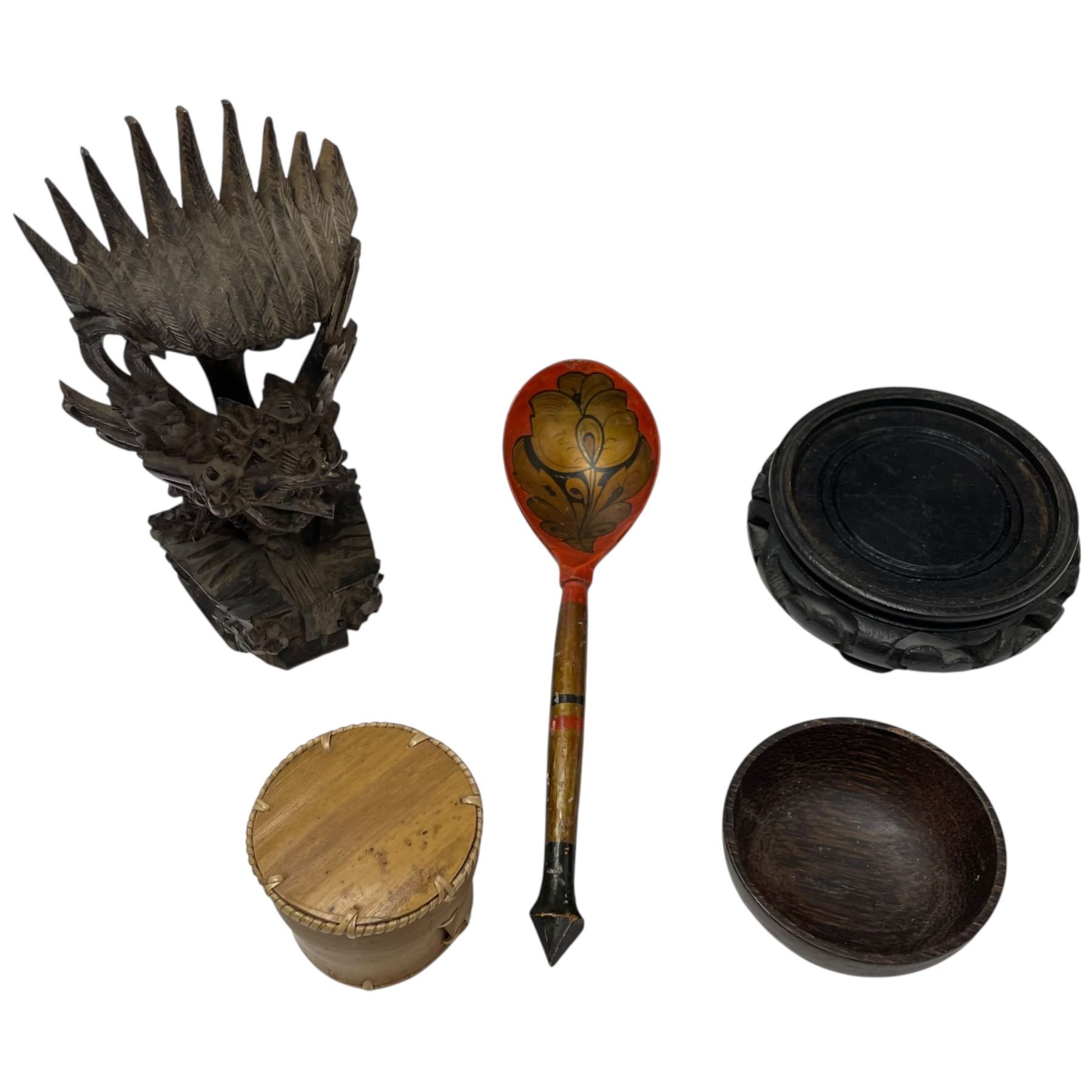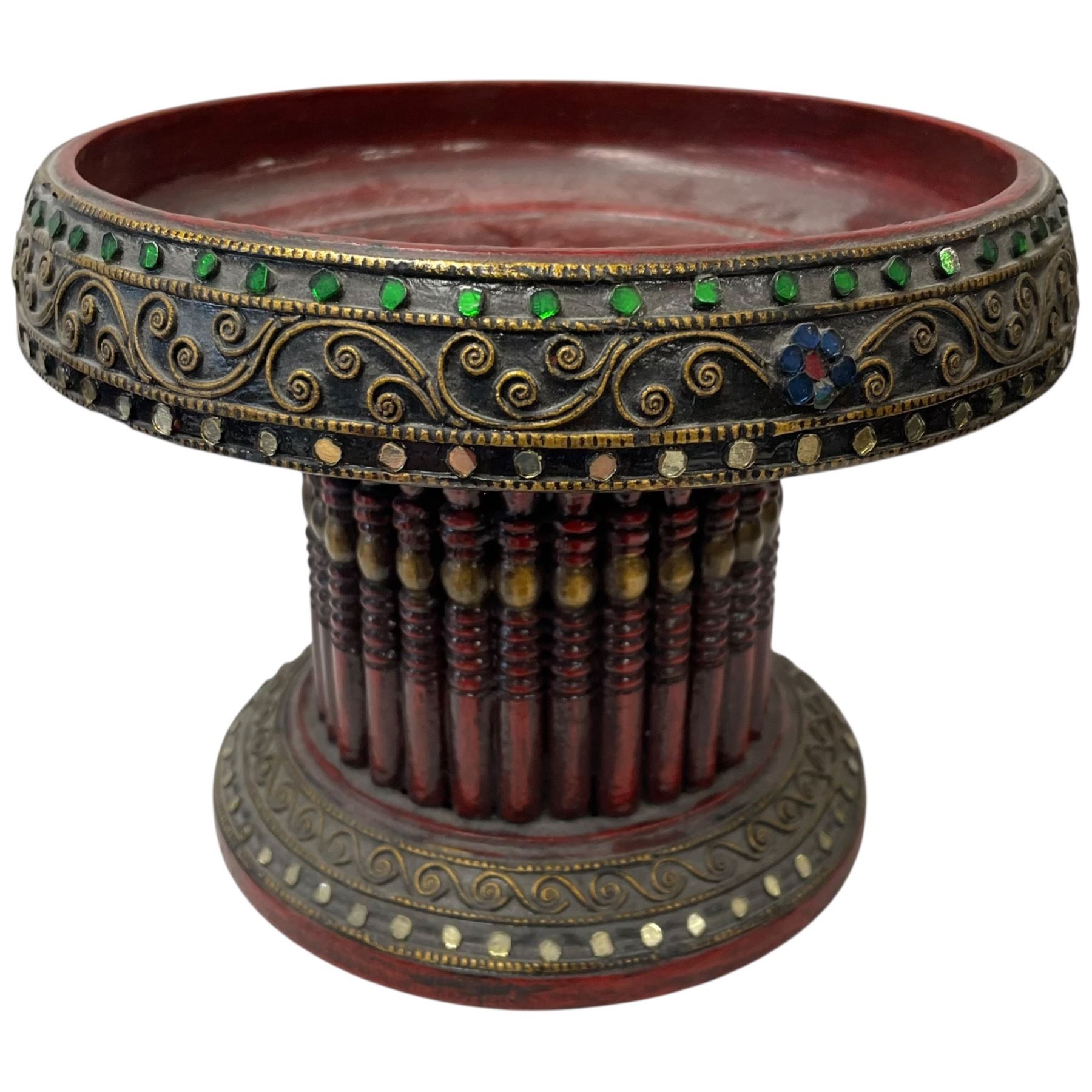 Lot includes a Balinese sculpture, various pottery pieces, a Thai pedestal bowl measuring 6.5-Inch tall, and additional items for decorative home use. Pieces feature a mix of cultural artistry and craftsmanship. Item is as pictured.