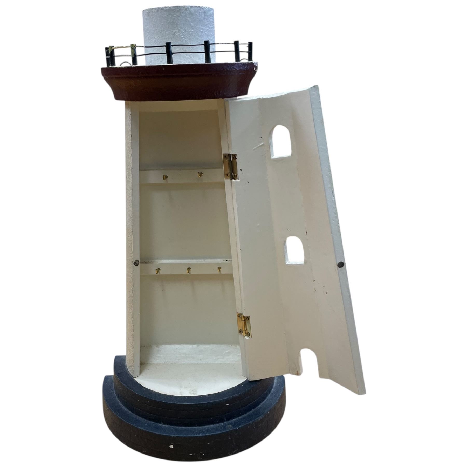 Collection of decorative home decor items featuring a wood lighthouse with internal shelves 18" tall, a red wood flower, and a small brass windmill. Items are crafted in unique materials and designs. Item is as pictured.