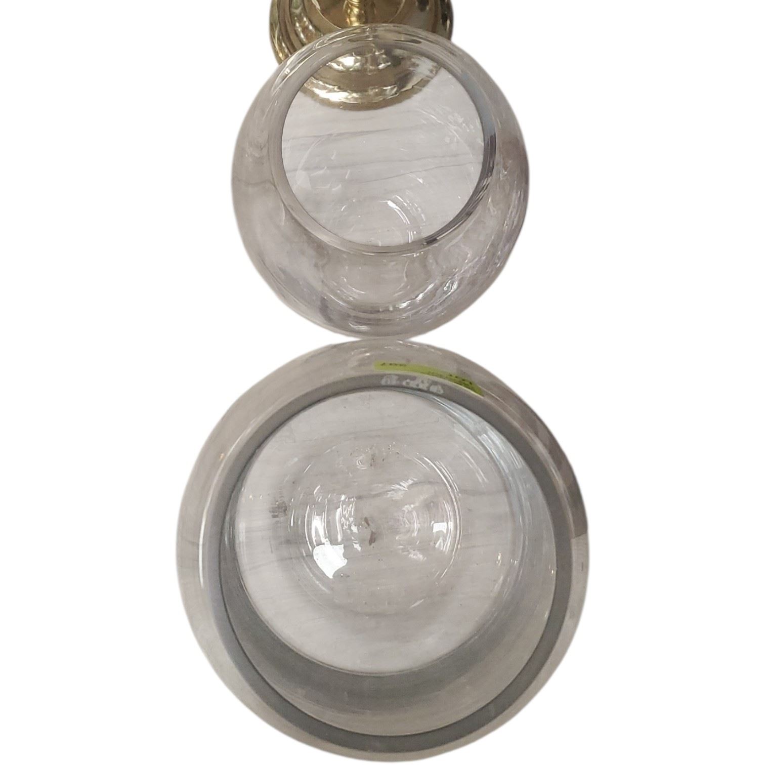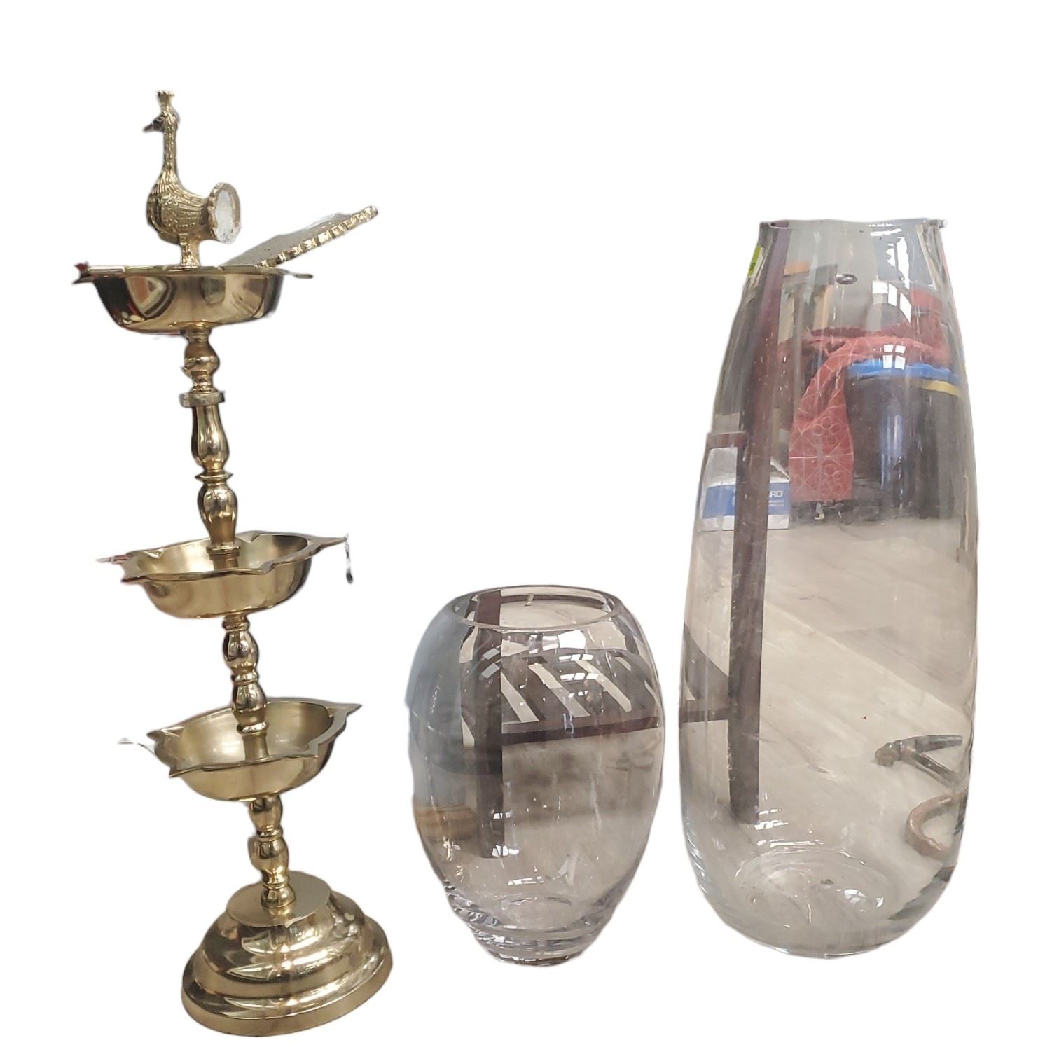 Lot of decorative items includes large glass floor vases with the tallest measuring 26-Inch and a three-tiered cast metal ashtray noted as damaged. Glass vases are suitable for floor display or use as indicated. Item is as pictured.