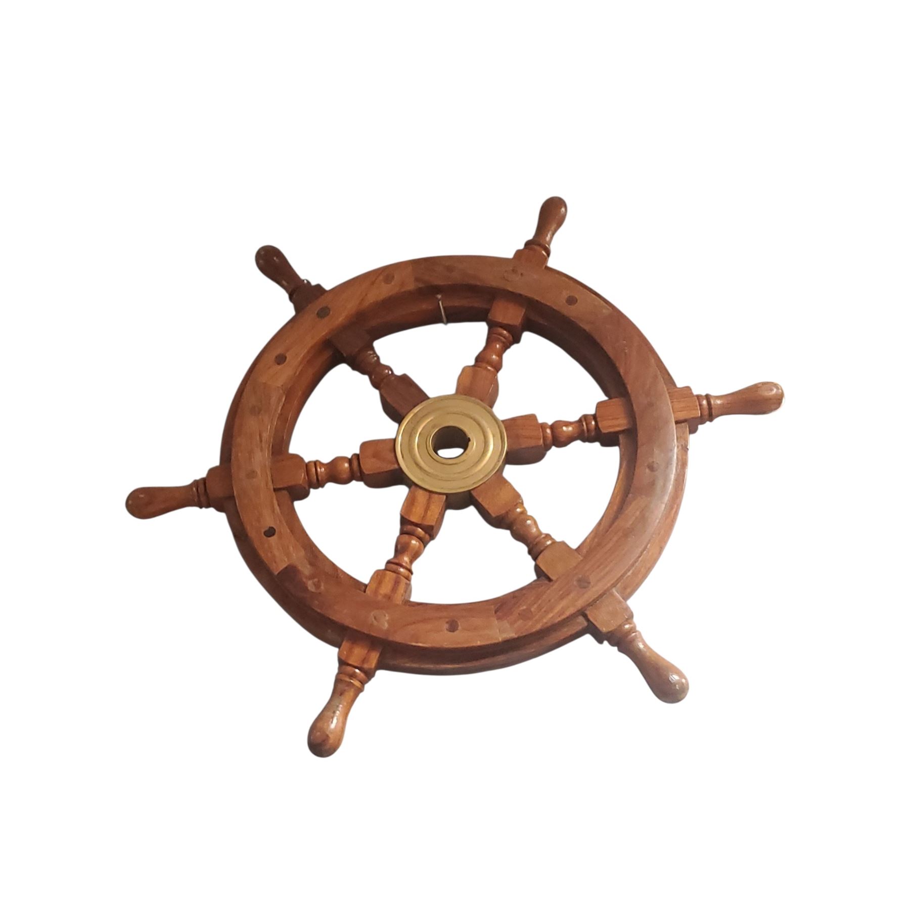 Decorative ship's wheel measuring 18-Inch diameter, crafted from wood with a solid brass center. Features six handles and a traditional nautical design suitable for indoor display or themed decor purposes. Item is as pictured.