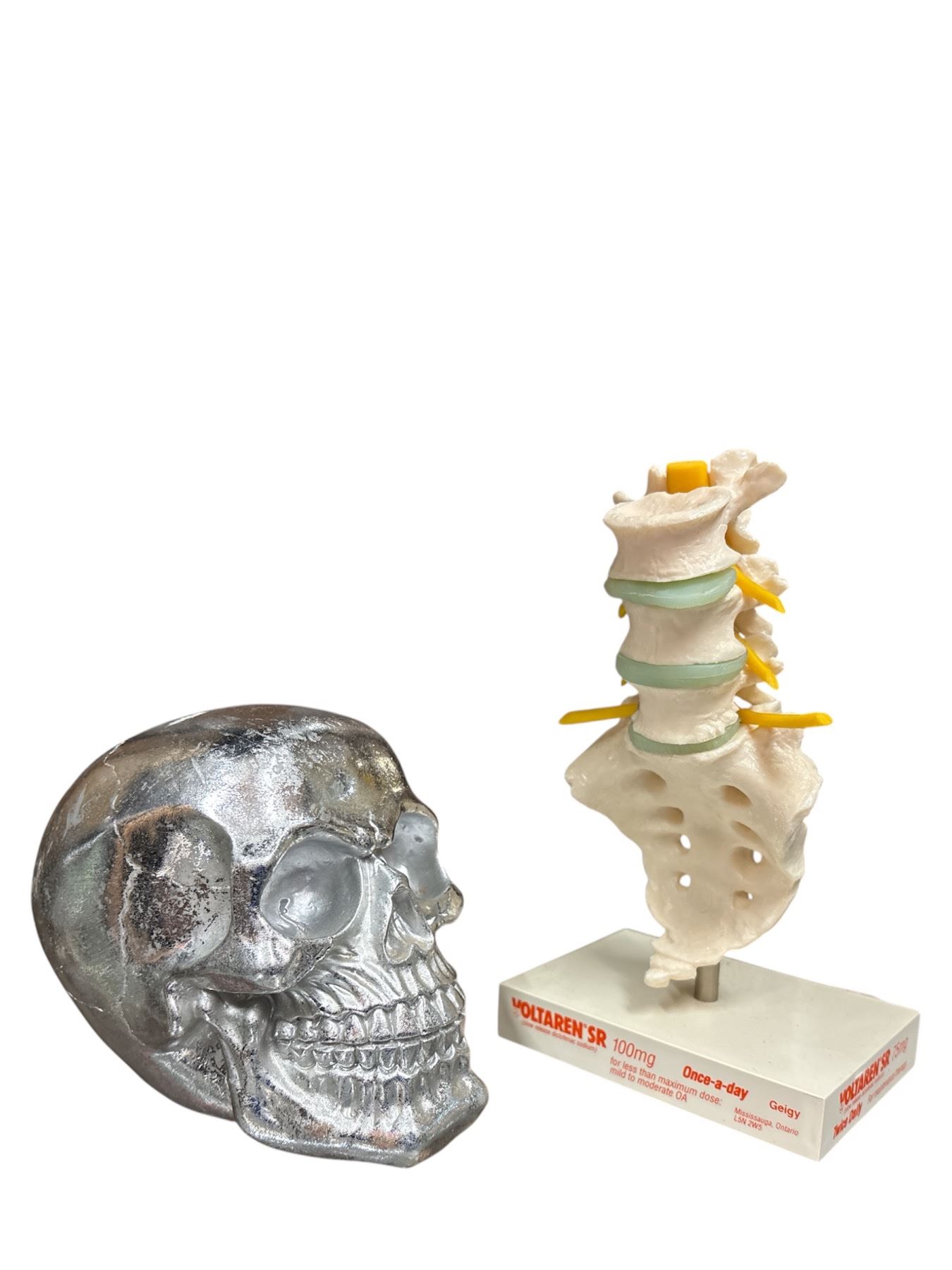 This lot includes a decorative skull and a Volataren anatomical model. The skull is designed for decoration, and the anatomical model showcases detailed anatomical features for educational or display purposes. Both items are as pictured.