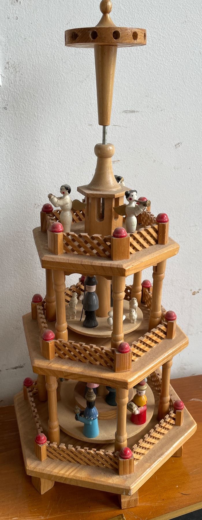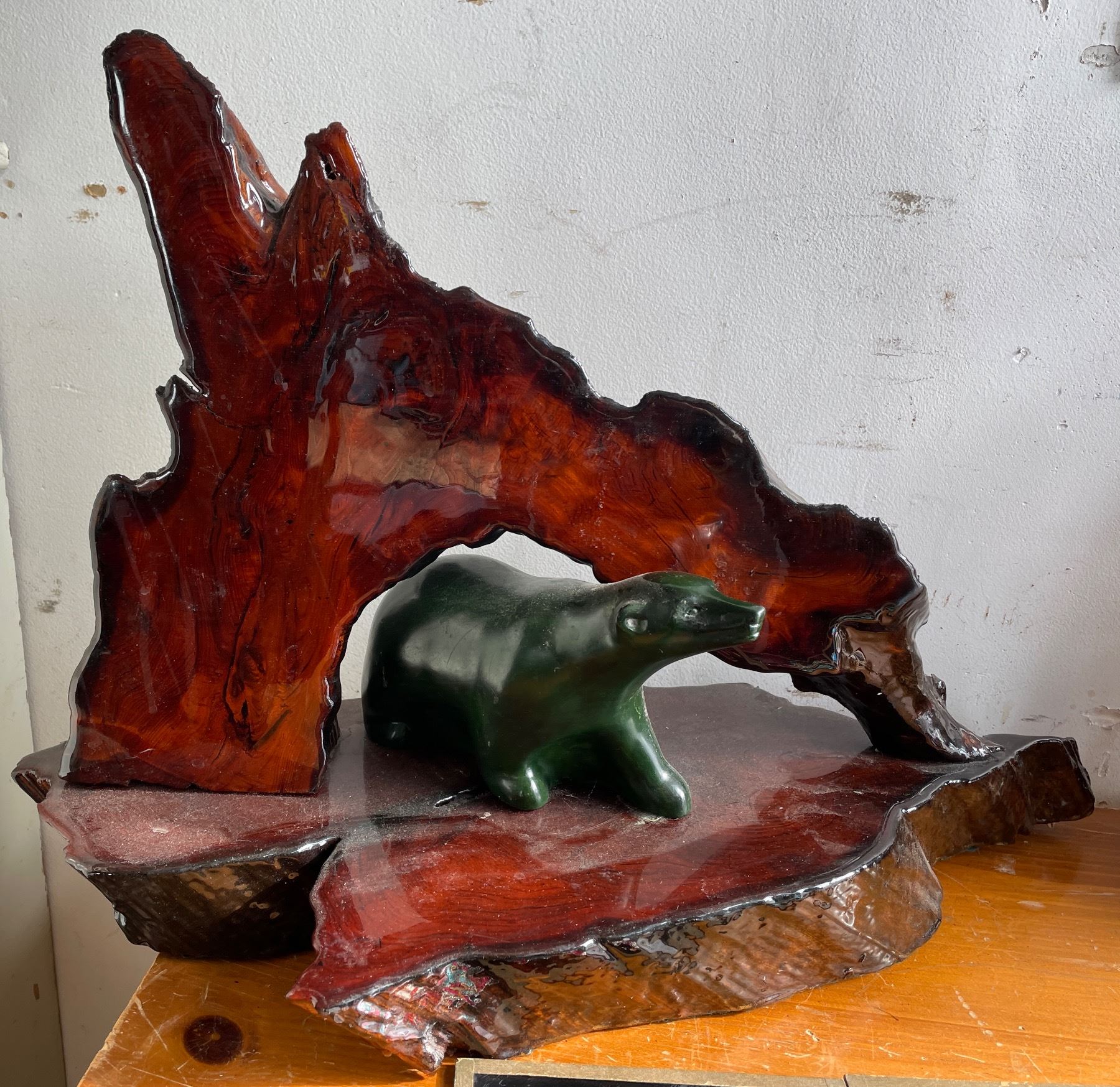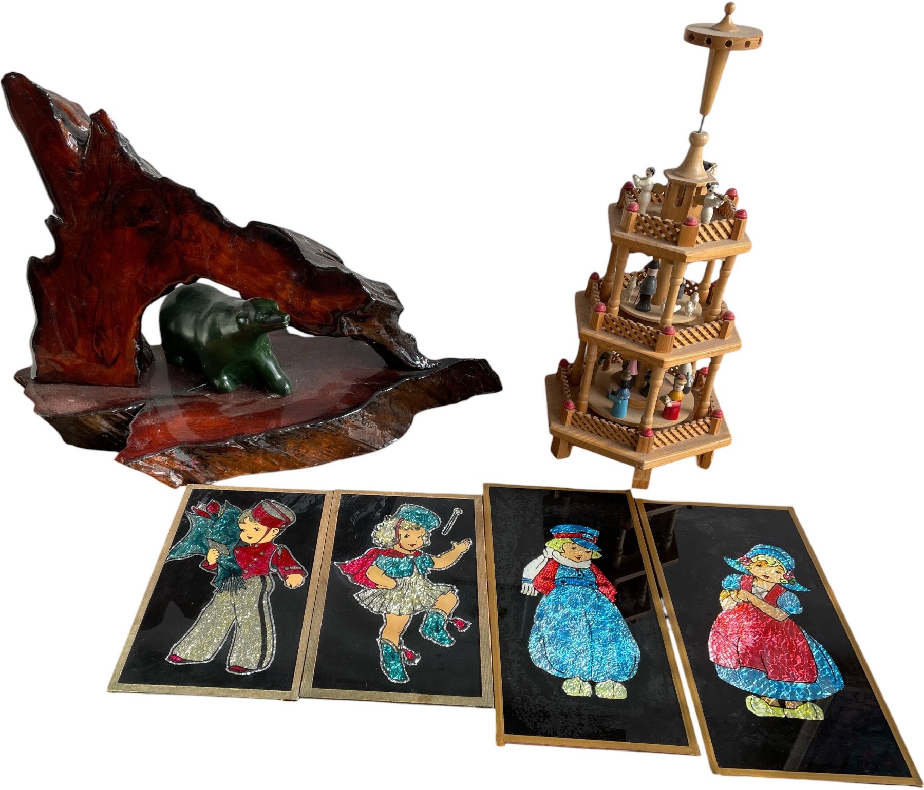 Decorative Wood Burl Bear Display, German-Style Music Tower & Reverse Glass Art