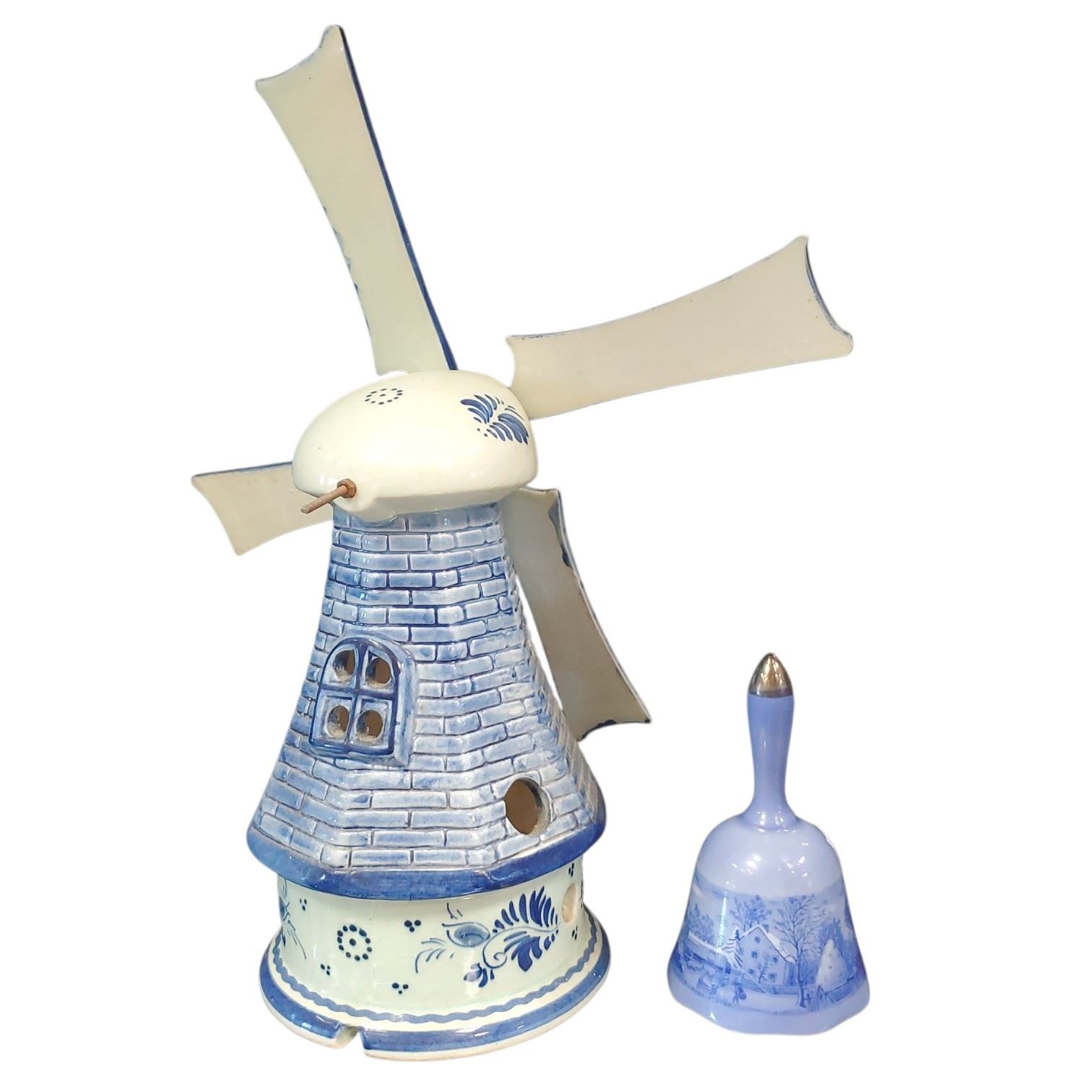 Lot includes a Delft Holland ceramic windmill measuring 14.5-Inch tall and a small ceramic bell. Both items feature traditional blue and white Dutch design motifs typical of Delftware pottery. The windmill is a decorative piece, while the bell is functional with a detailed design. Item is as pictured.