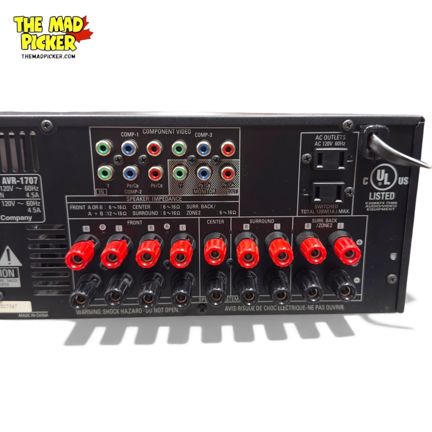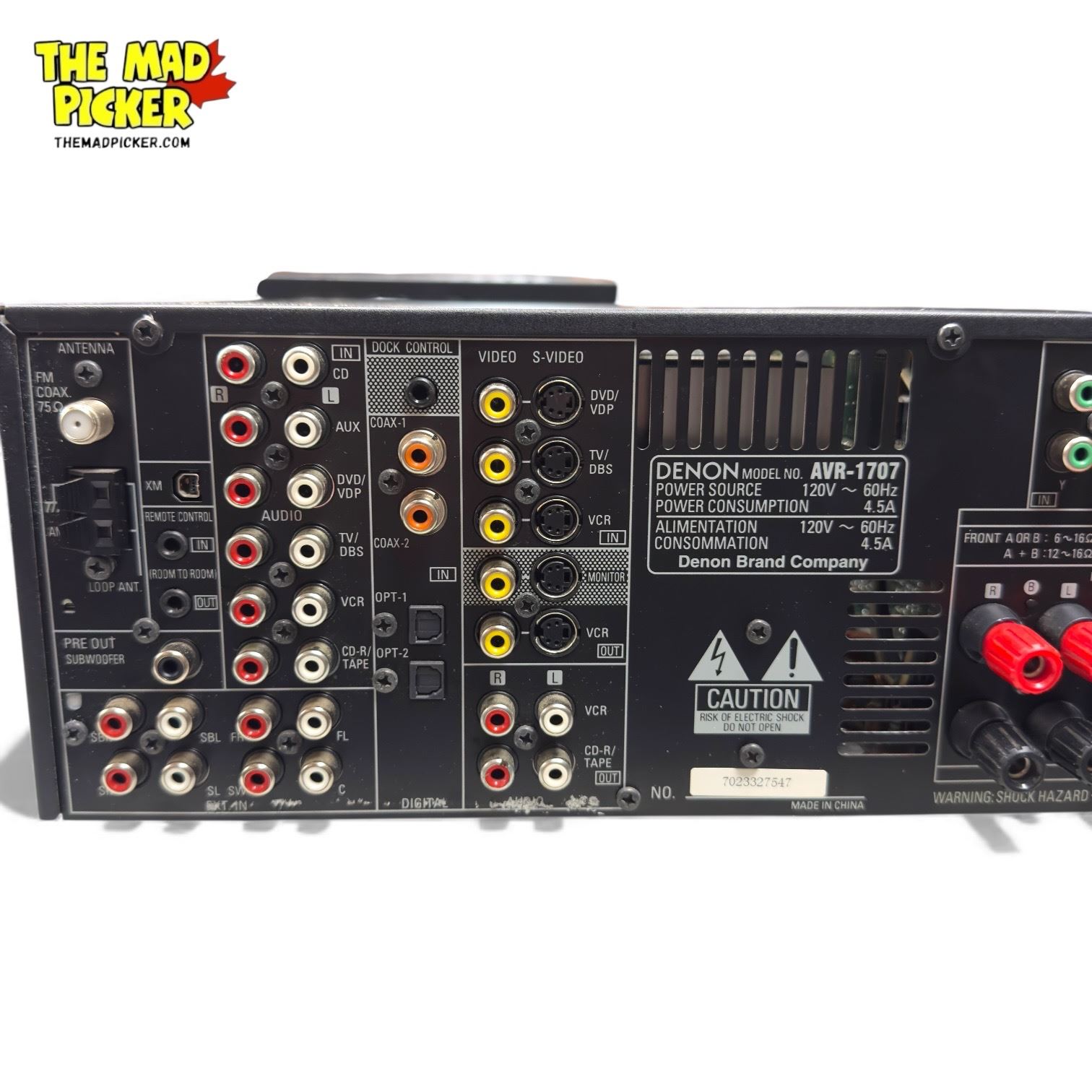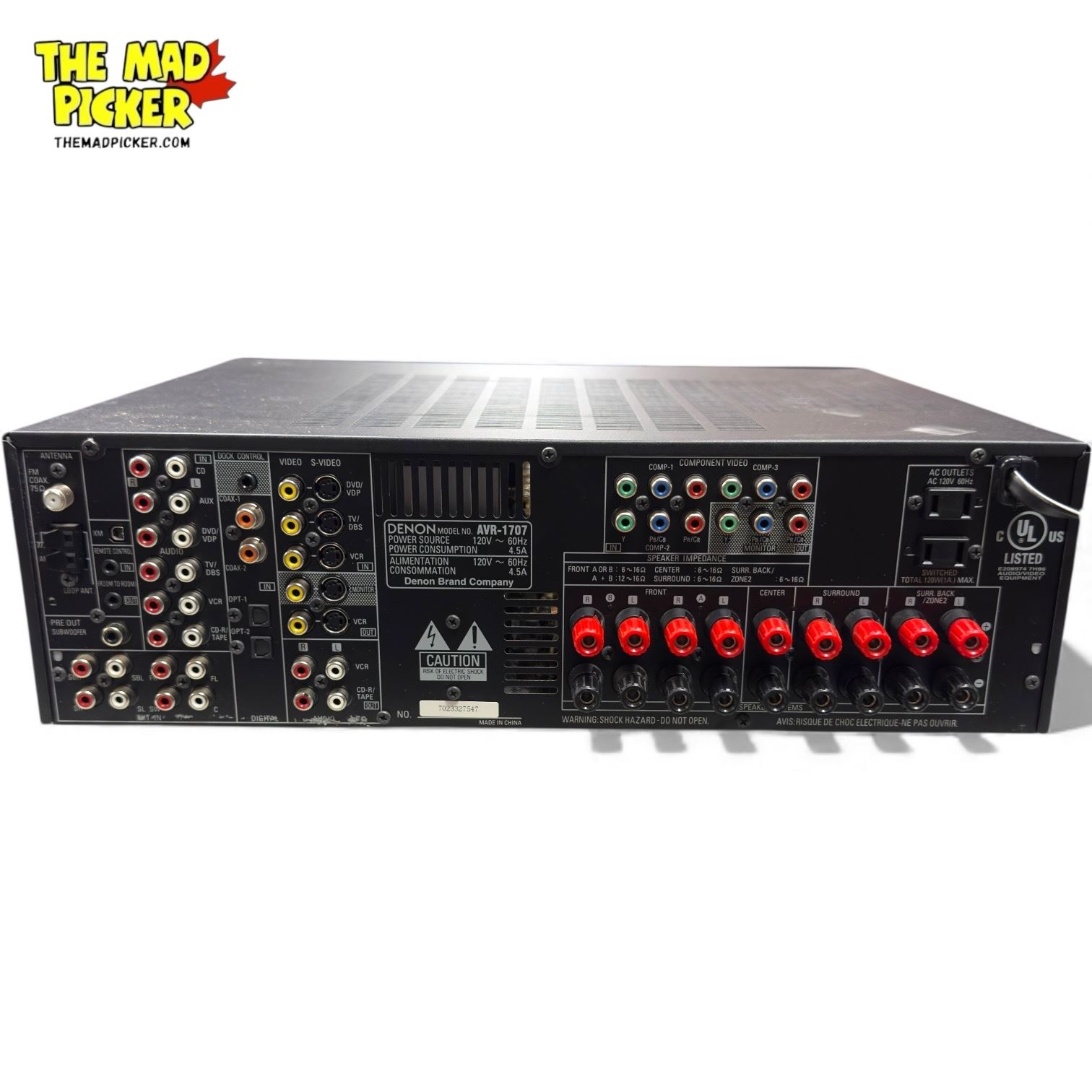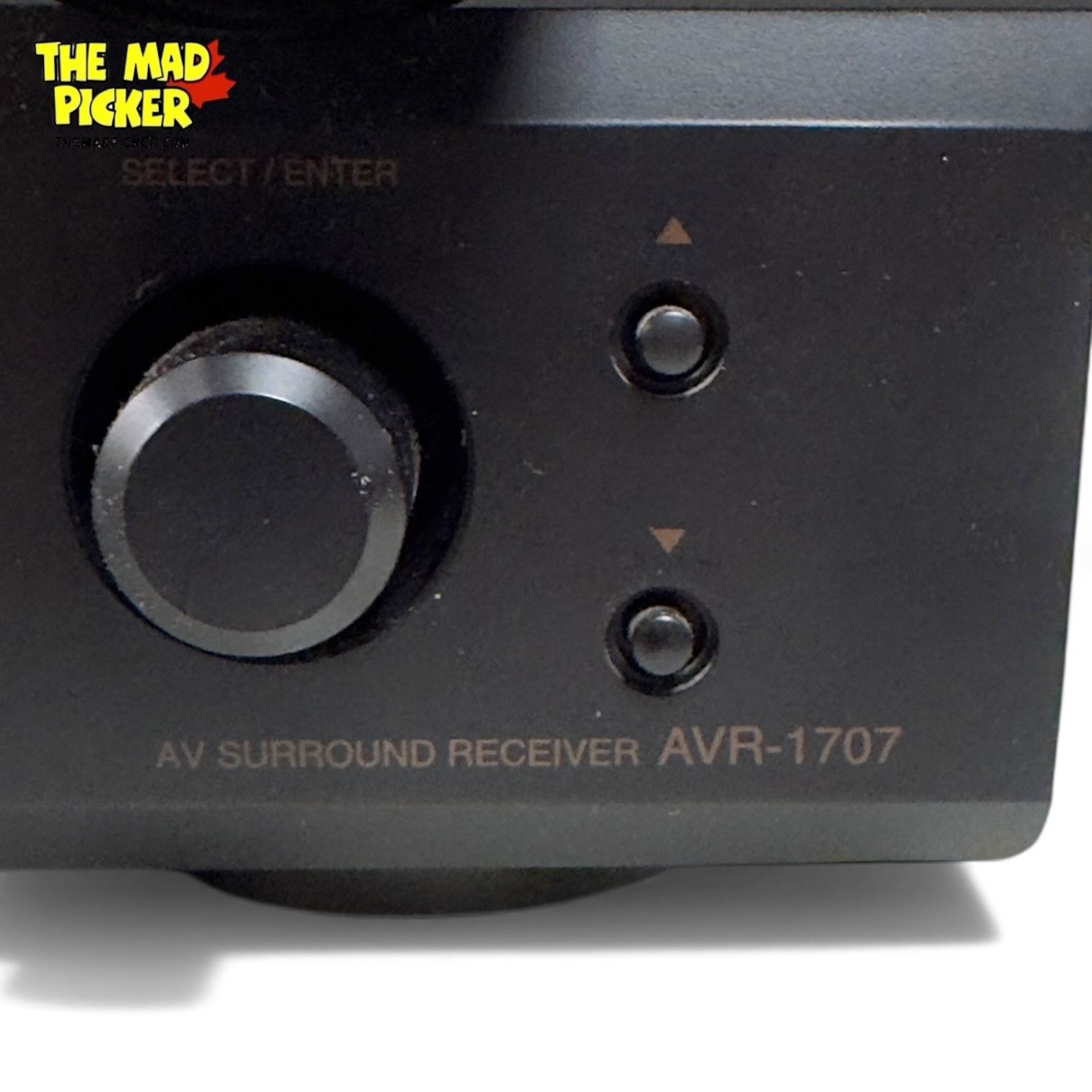 The Denon AVR-1707 is a 7.1-channel AV surround receiver rated at 75W per channel into 8Ω (20Hz–20kHz, THD 0.08%), positioned as a mid-range home theater receiver around 2006. Amplifier section: equal power discrete amplifier design, speaker impedance 6–16Ω. Surround processing: Dolby Digital EX, DTS-ES, Dolby Pro Logic IIx, Dolby Headphone, DTS Neo:6 with full 7.1 channel decoding. Audio performance: frequency response 10Hz–100kHz (±1dB), THD 0.08%, signal-to-noise ratio 100dB (line), 192kHz/24-bit DACs for all channels. Inputs/Outputs: 2 optical and 2 coaxial digital inputs, 7.1 channel analog input, composite and S-Video switching (no HDMI), pre-outs for all channels, AM/FM tuner. Dimensions