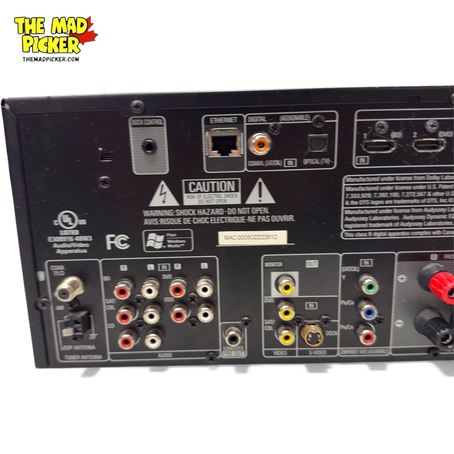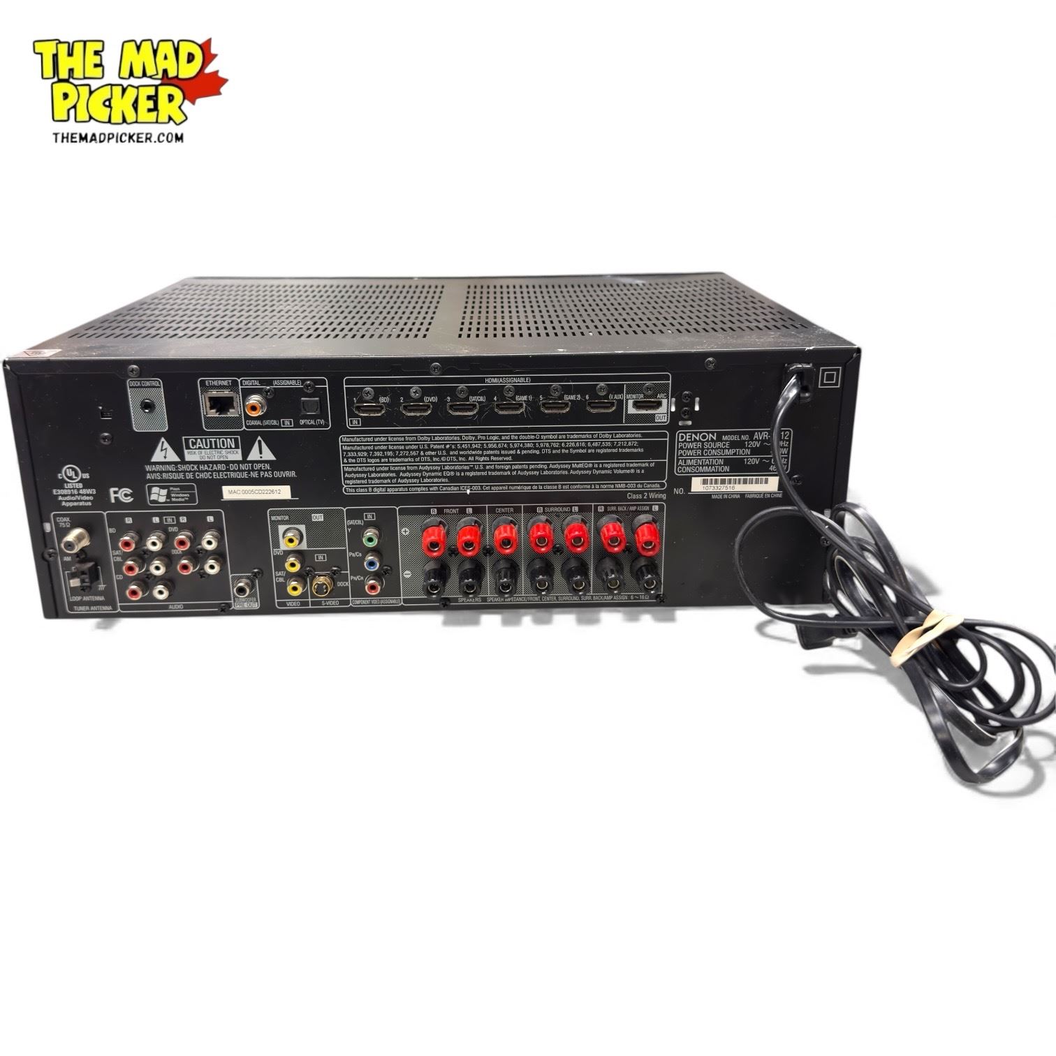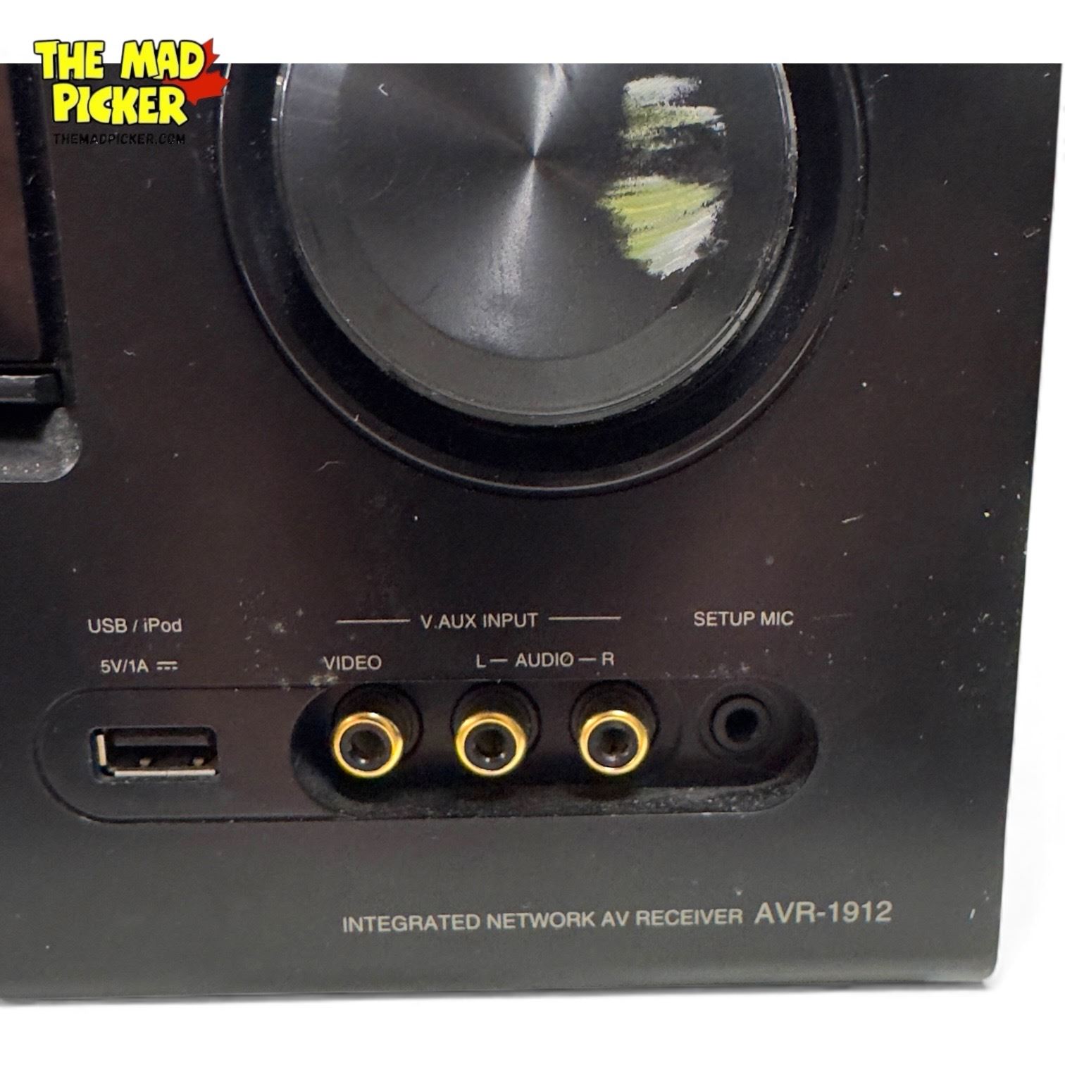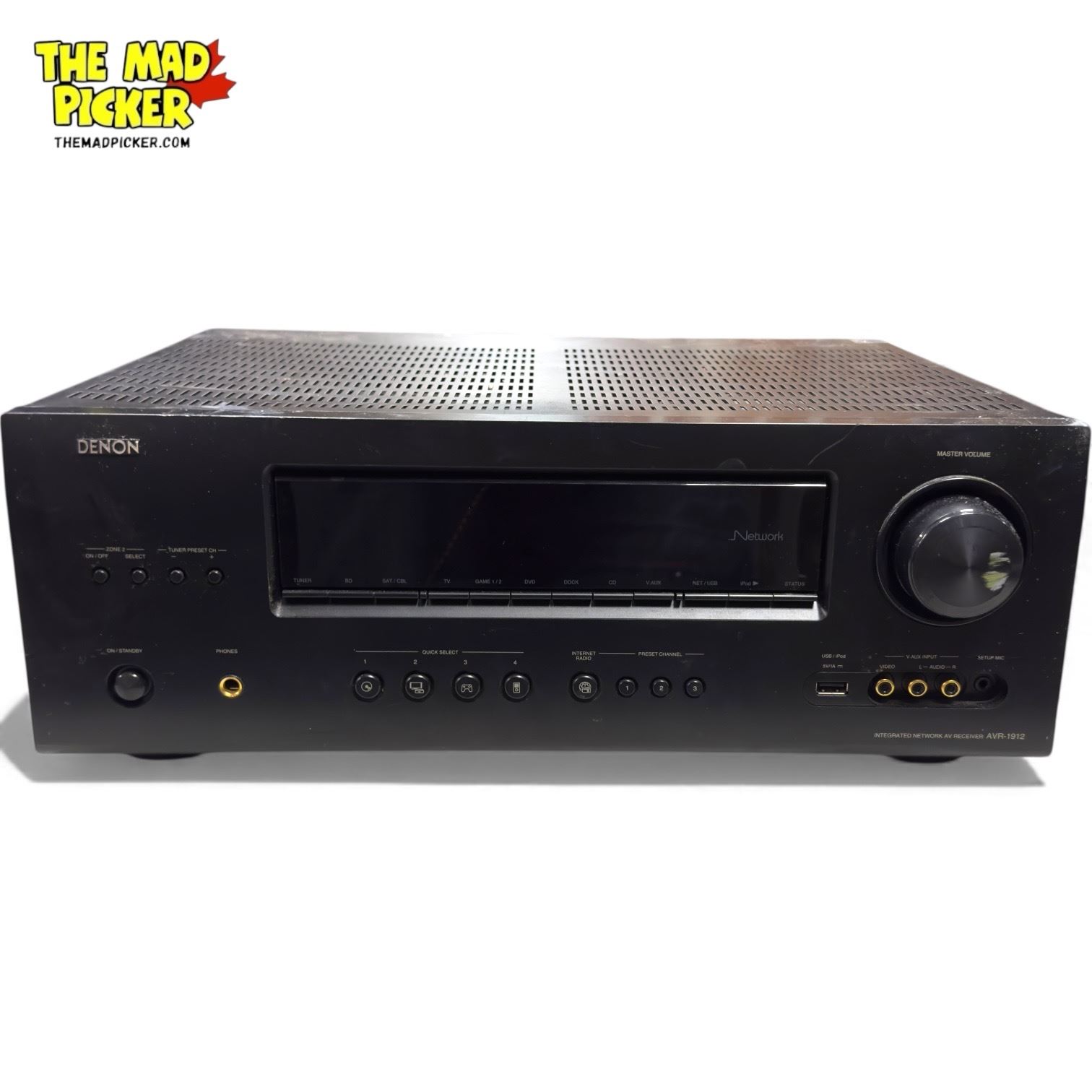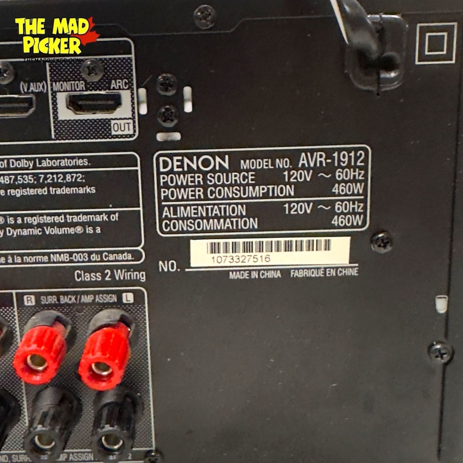 The Denon AVR-1912 is a 7.1-channel HD network AV receiver rated at 90W per channel into 8Ω (20Hz–20kHz, THD 0.08%), supporting Dolby TrueHD, DTS-HD Master Audio, Dolby Pro Logic IIz, Dolby Digital EX, and DTS-ES with full 7.1 channel decoding and height channel support. Amplifier section: discrete amplifier design for equal power across channels, speaker impedance 6–16Ω. Audio performance: frequency response 10Hz–100kHz (±1dB), THD 0.08%, signal-to-noise ratio 100dB (line), 192kHz/24-bit DACs for all channels. Inputs/Outputs: HDMI 6 in / 1 out with 3D pass-through, 2 optical and 2 coaxial digital inputs, 7.1 channel analog input, stereo RCA inputs, video switching via HDMI, Component, Composite, and S-Video, pre-outs for all channels, Zone 2 audio output. Networking: Ethernet port for streaming