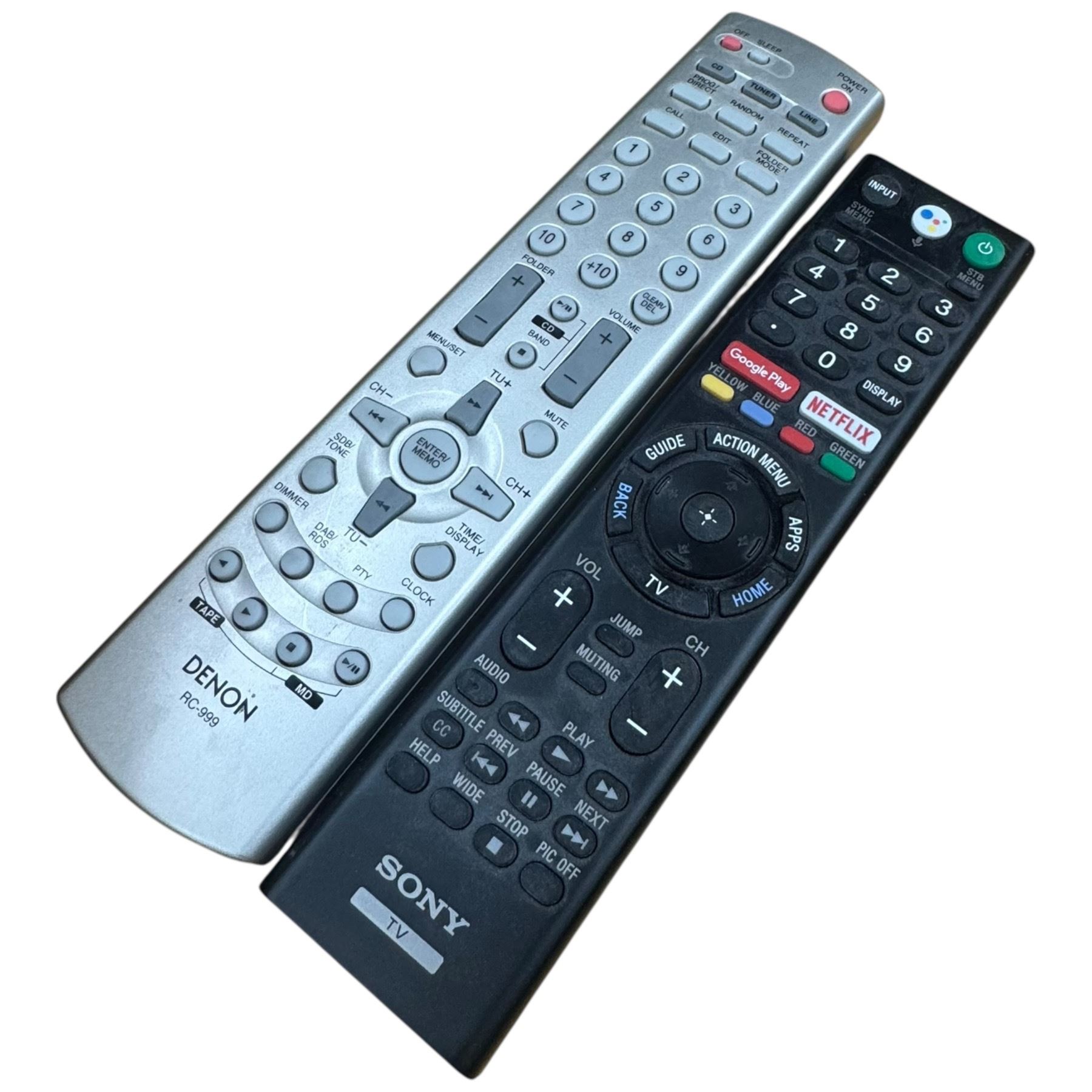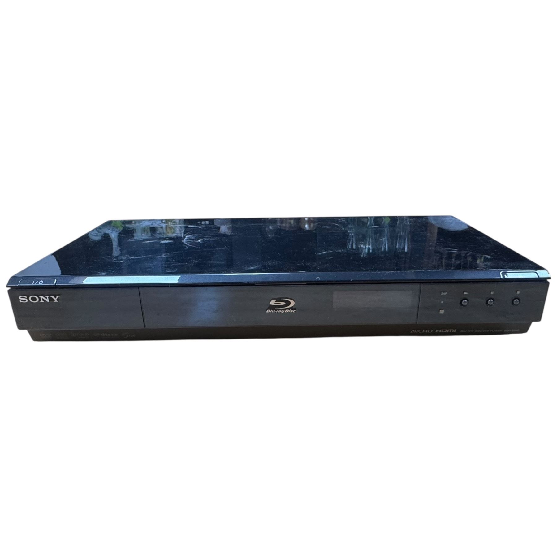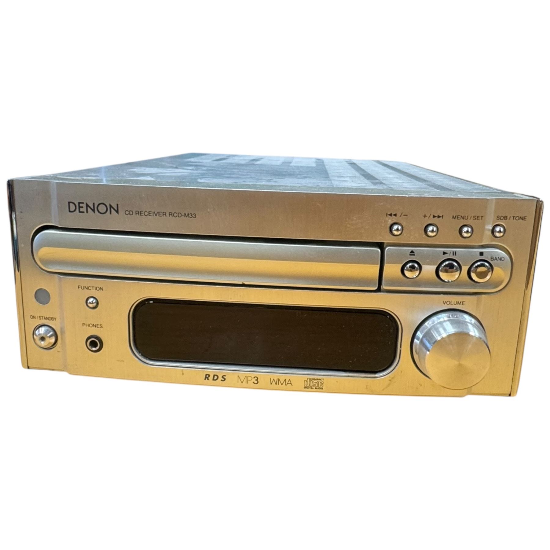 Denon RCD-M33 compact audio system paired with SC-M53 bookshelf speakers. Includes Sony BDP-S550 Blu-ray player featuring 1080p HD output and BD-Live capability. Multi-component setup for audio and video playback. Item is as pictured. Remote controls included.