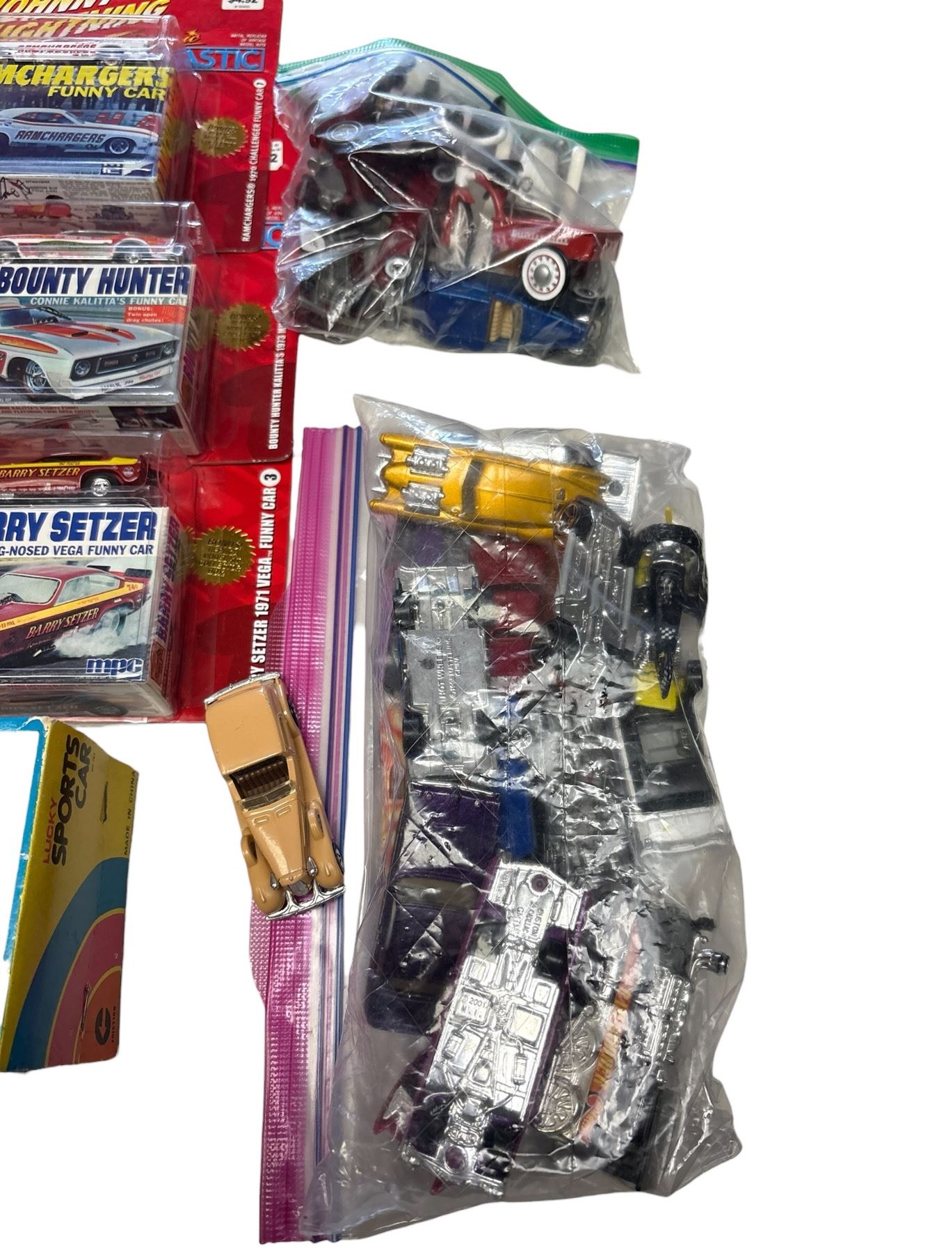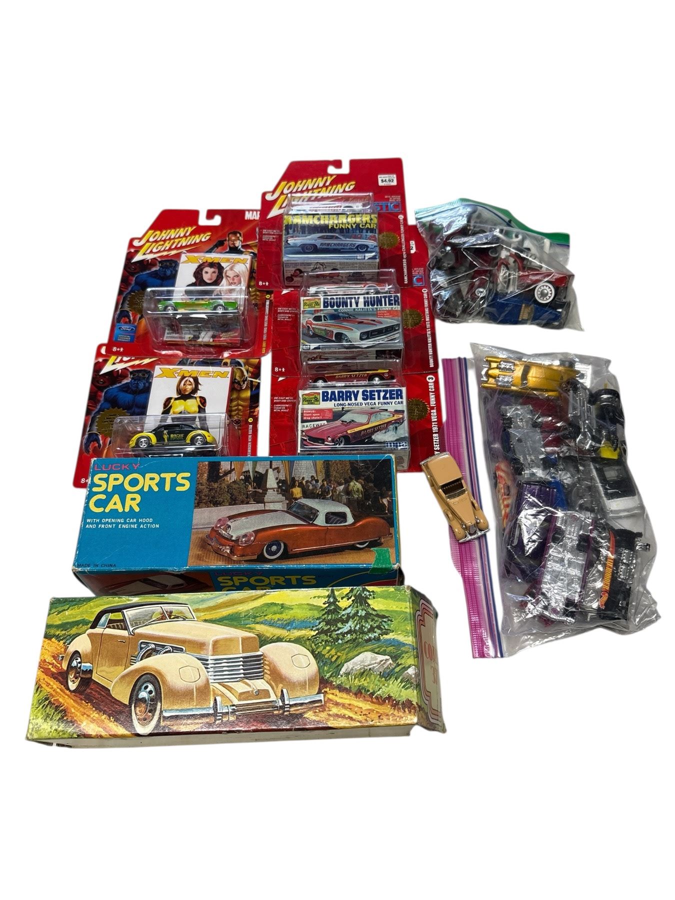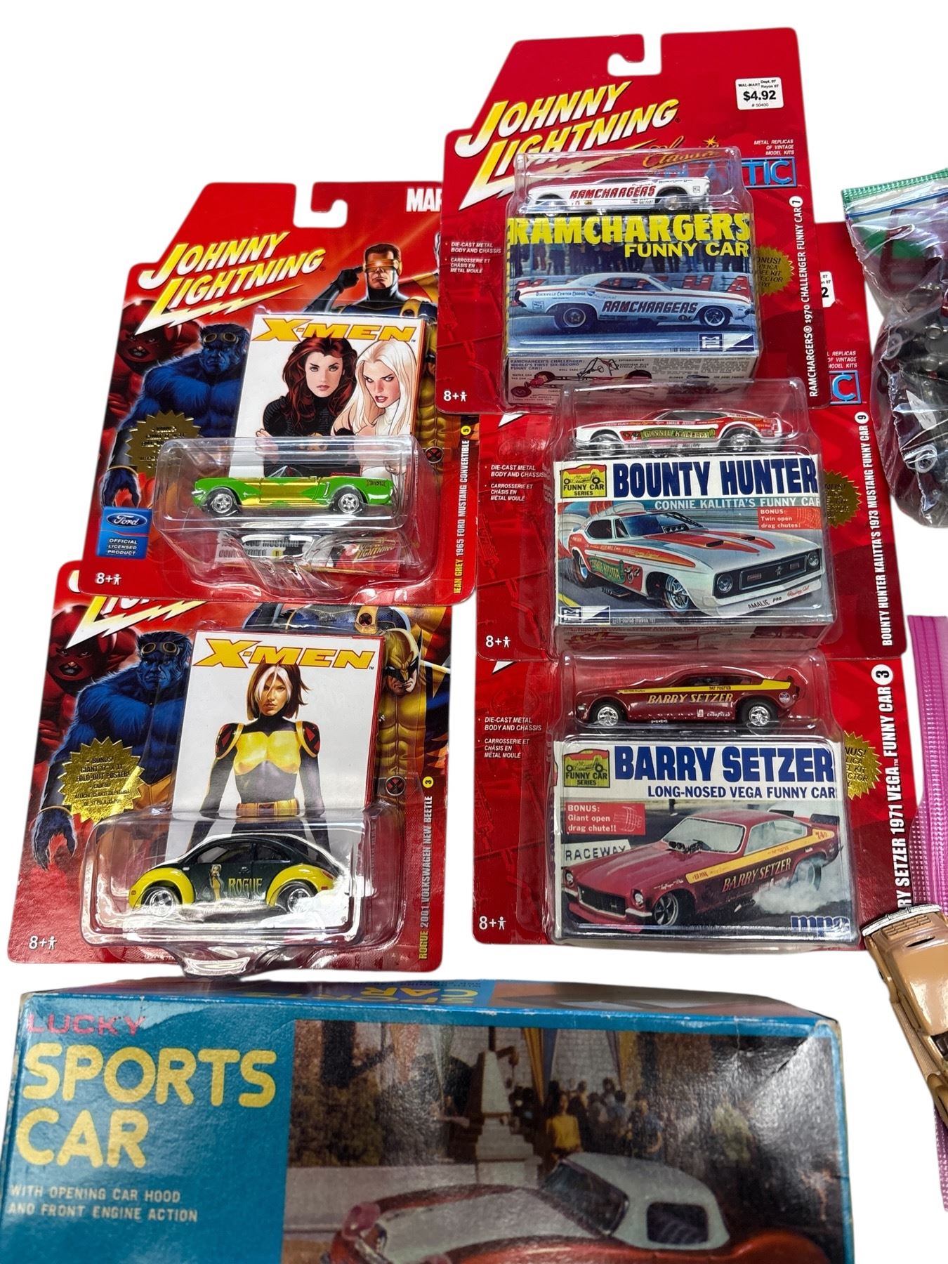 Collection includes various diecast cars, vintage tin lithographed cars, and Johnny Lightning Marvel-themed toys. Featuring hand-painted metal and stamped tin vehicles from mid-20th century, along with character-specific Marvel toys. Range of styles and production eras represented.