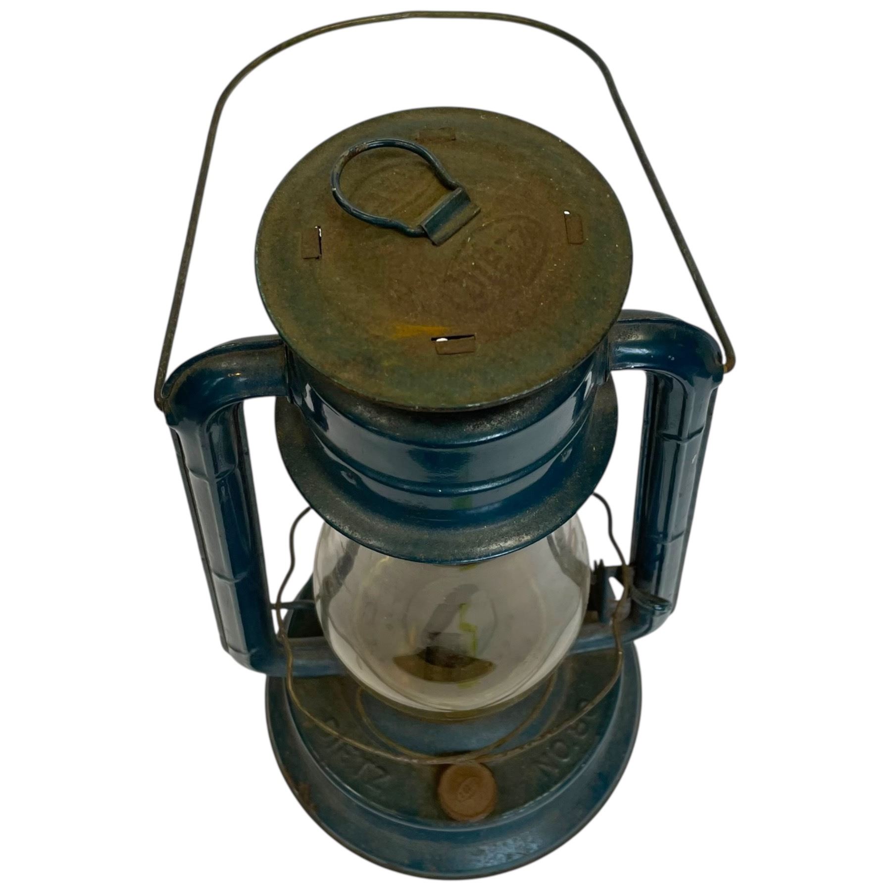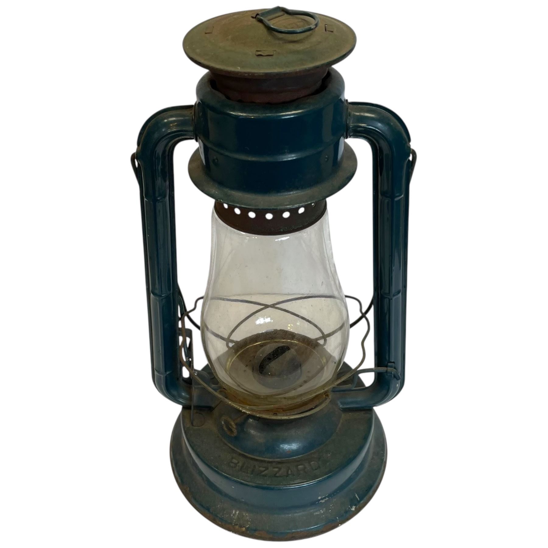 Dietz No 80 Blizzard kerosene lantern measuring 15-Inch tall with blue finish. Designed for outdoor use in harsh weather conditions. Features wide globe and sturdy frame for optimal durability. Originally introduced by Dietz in the mid-20th century. Item is as pictured.