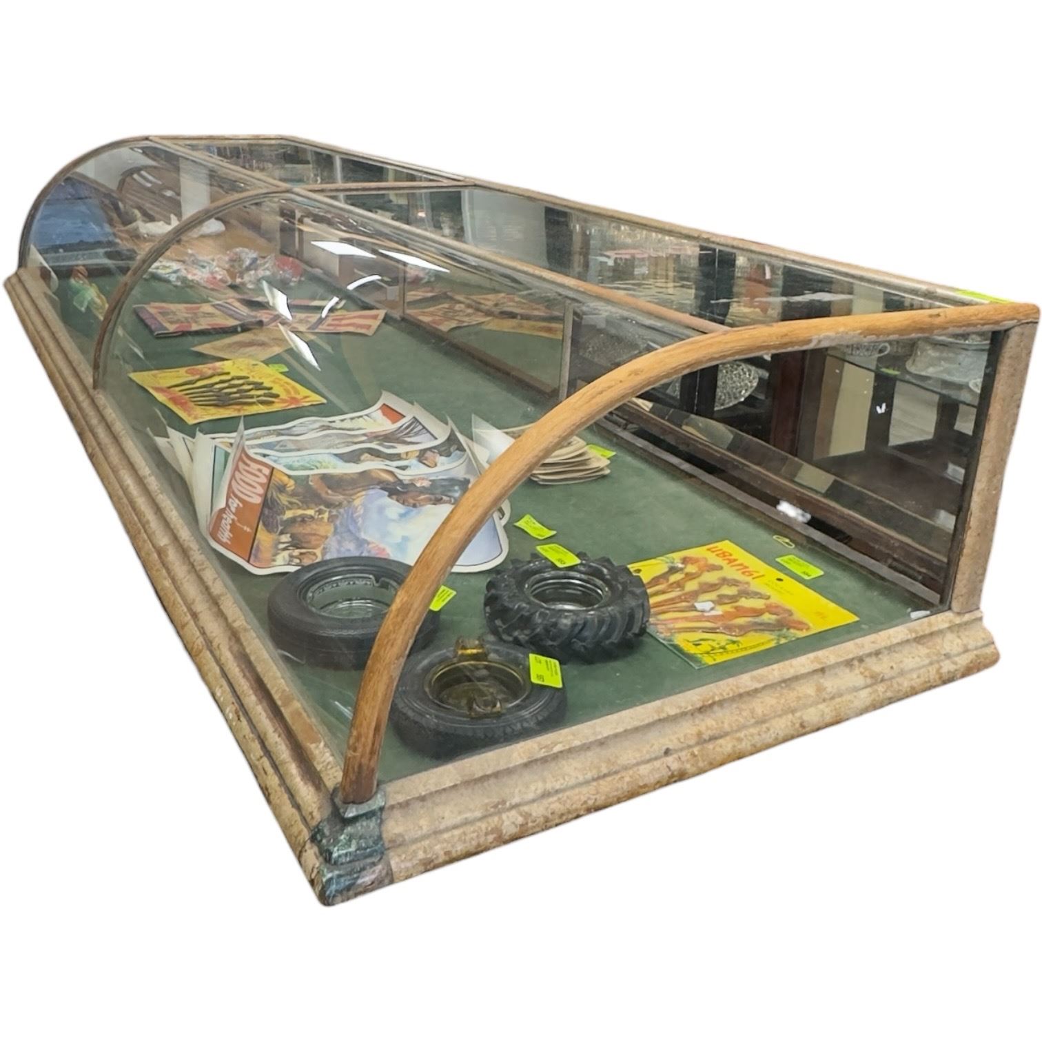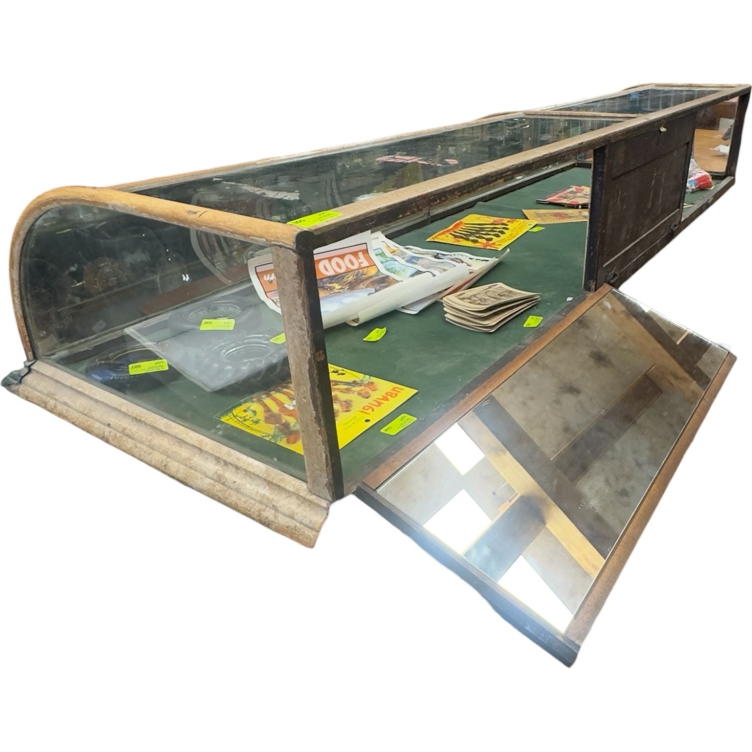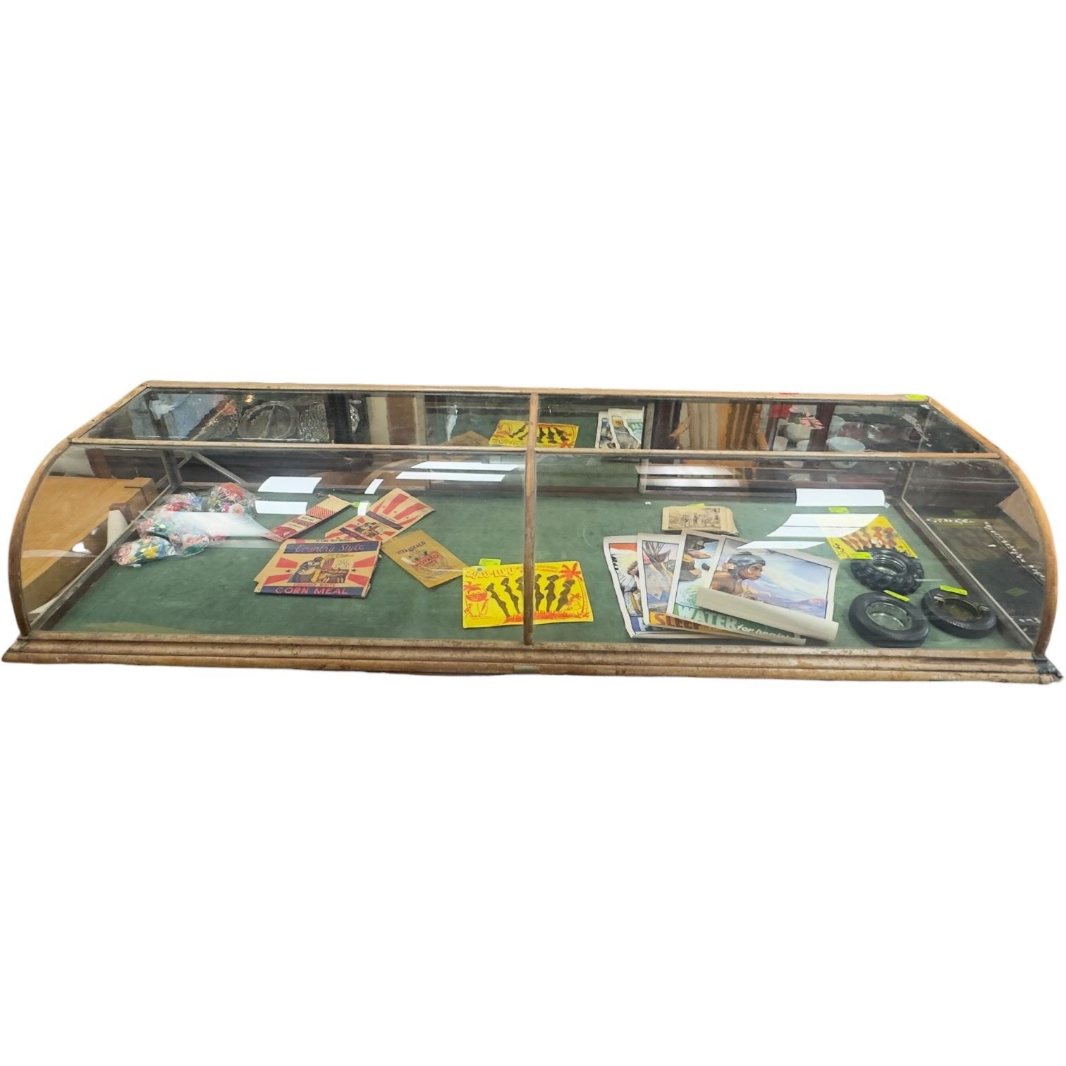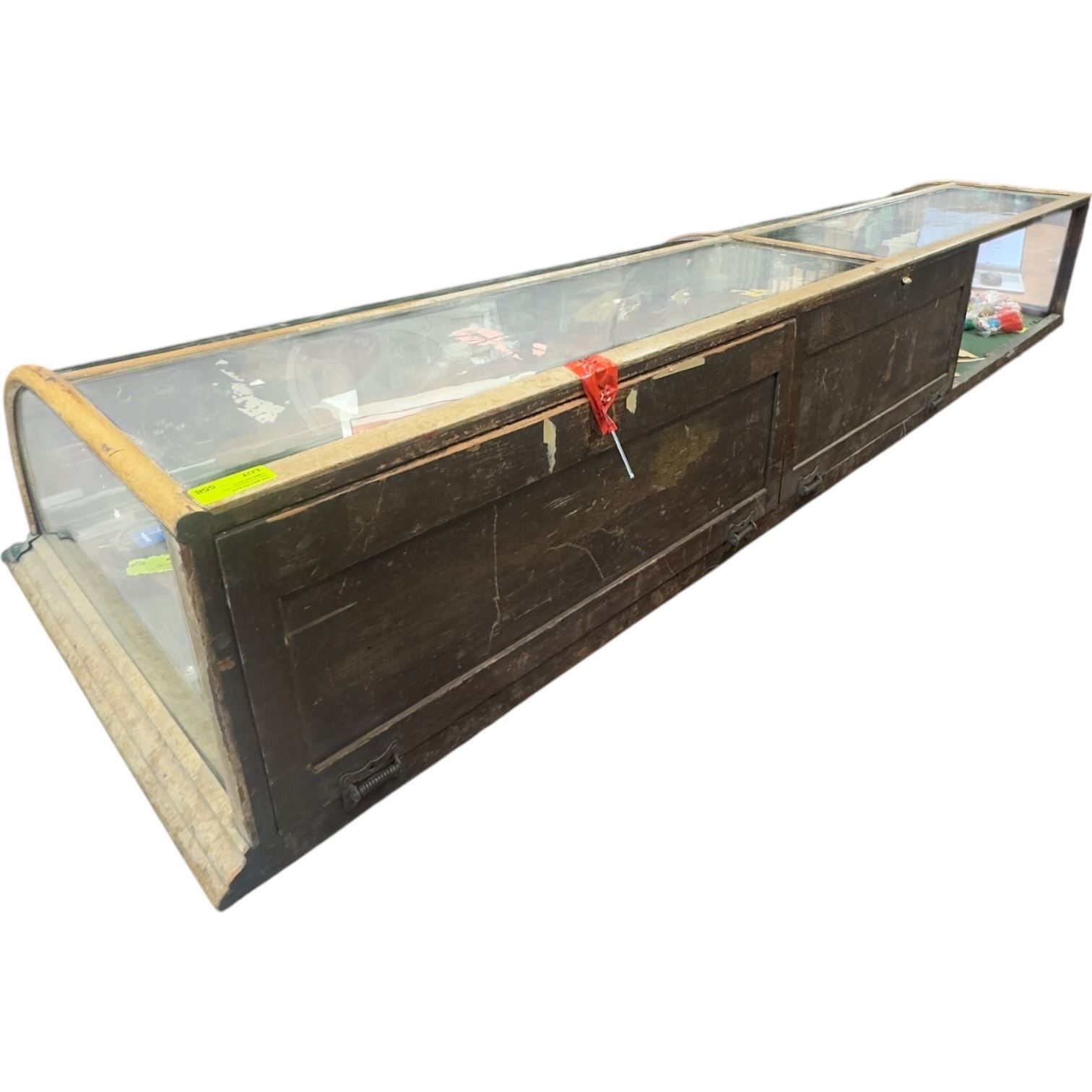 Dixon & Bernstein Co. oak countertop showcase with curved glass panels. Measures 85x27x14-Inch. Features a curved display front suitable for retail presentation. Some repairs are needed. Constructed with wood framing and glass panels. Item is as pictured.