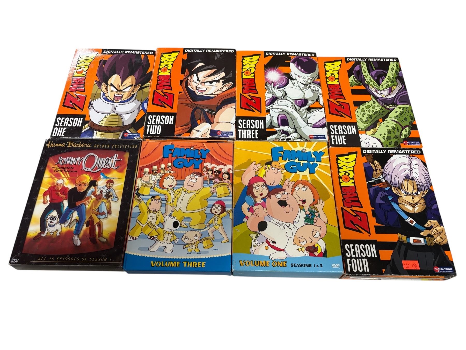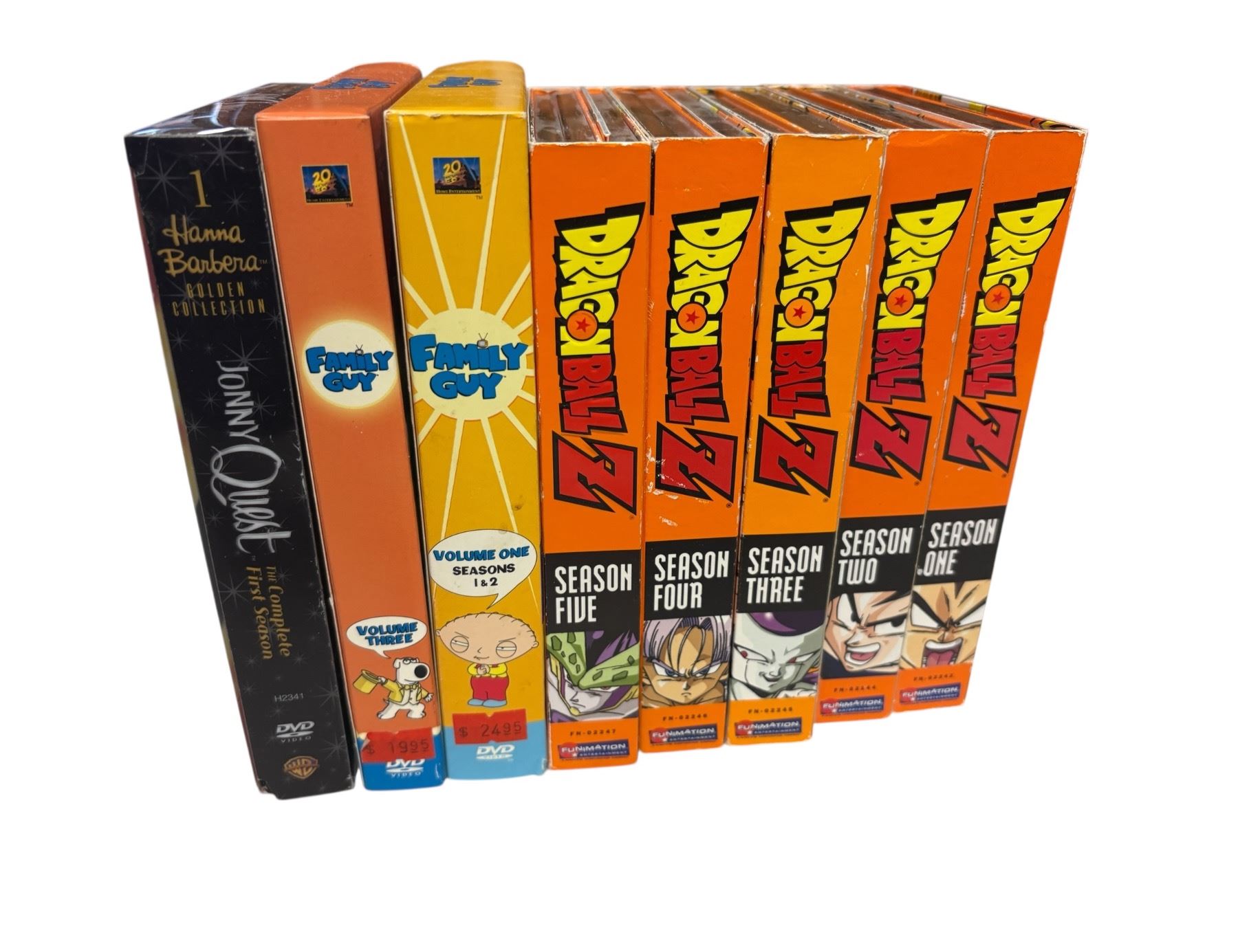 Dragon Ball Z DVD collection featuring various episodes. Includes Family Guy multiple seasons DVD sets and Jonny Quest series DVDs. Complete DVD sets for these iconic series.