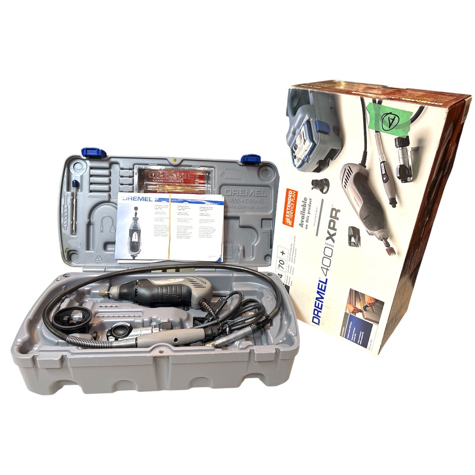 Dremel 400 XPR rotary tool with kit, featuring variable speed control and compatibility with a wide range of attachments. Operates on 120V power. Designed for precision cutting, sanding, polishing, and drilling across various materials. Item is as pictured.