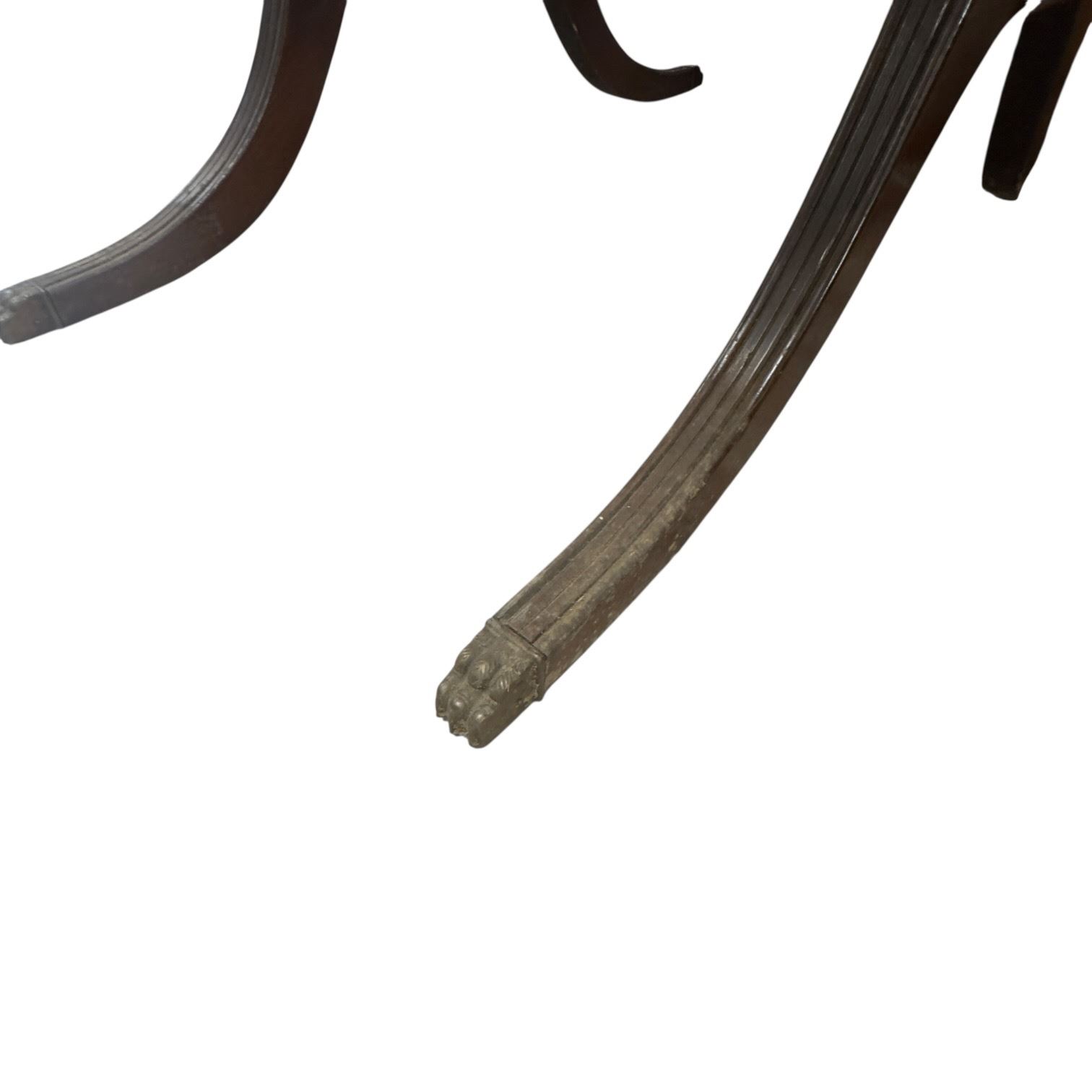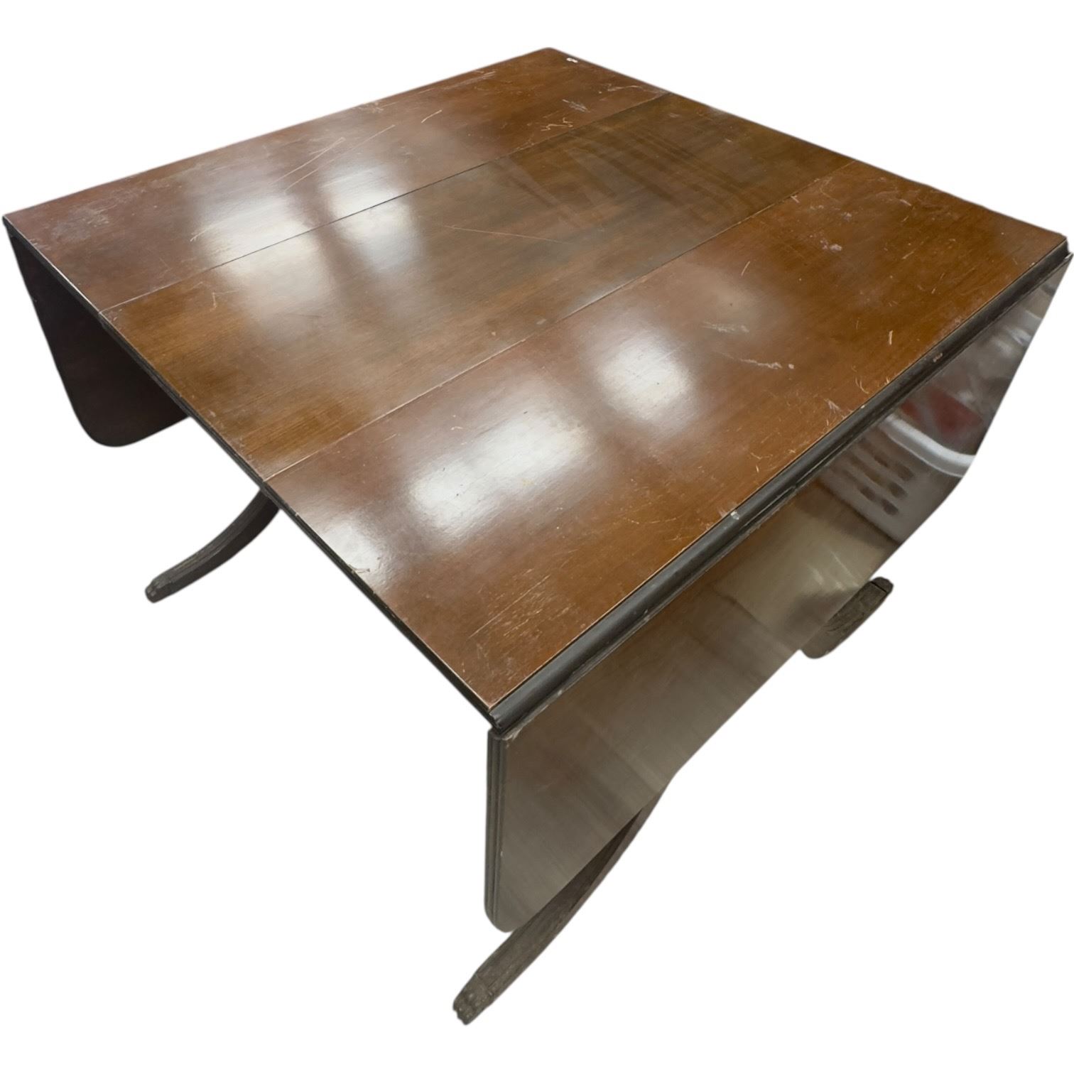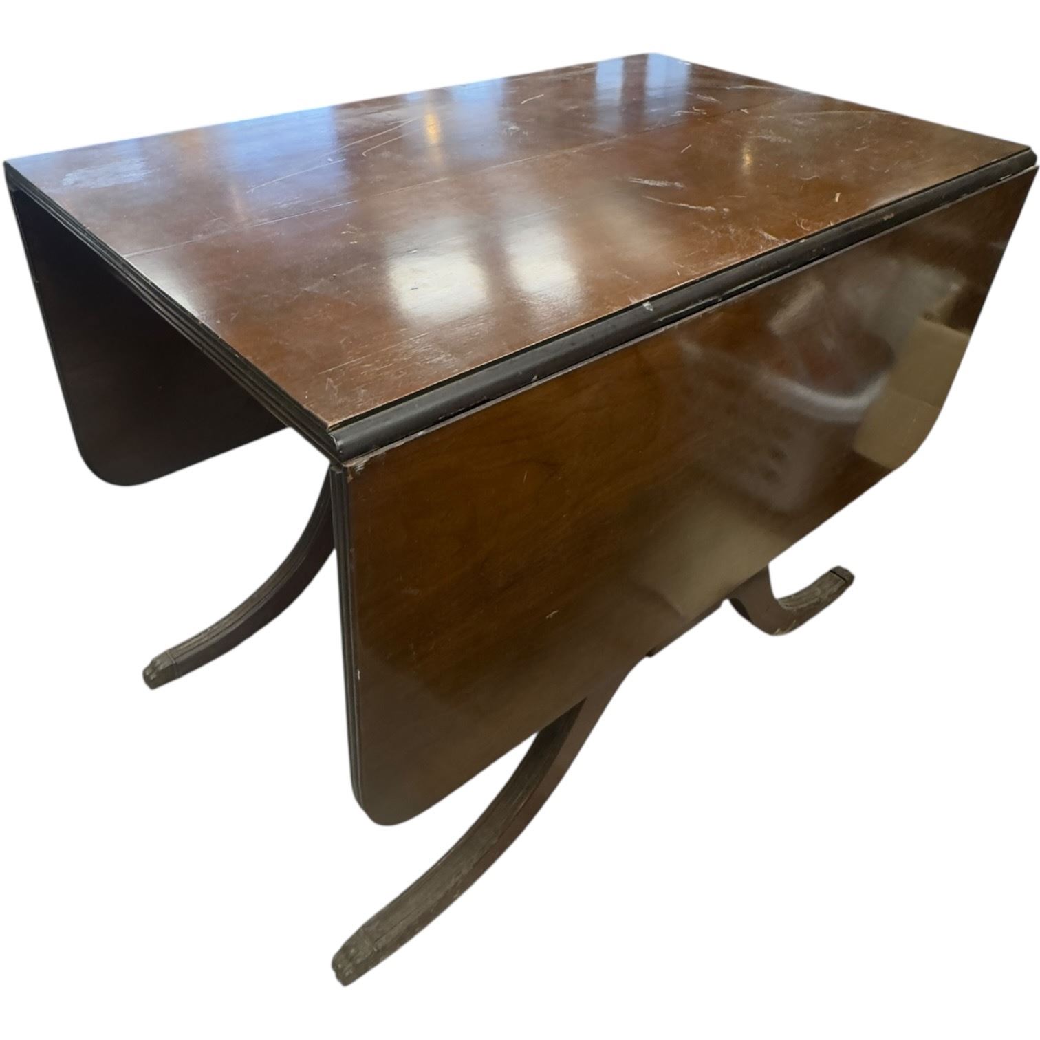 Duncan Fyfe style drop leaf table measuring 25.5x39x30-Inches when closed and expands to 58-Inches with leaves extended. Features traditional design elements associated with Duncan Fyfe furniture. Item shows some scratches as pictured. Constructed from wood. Item is as pictured.