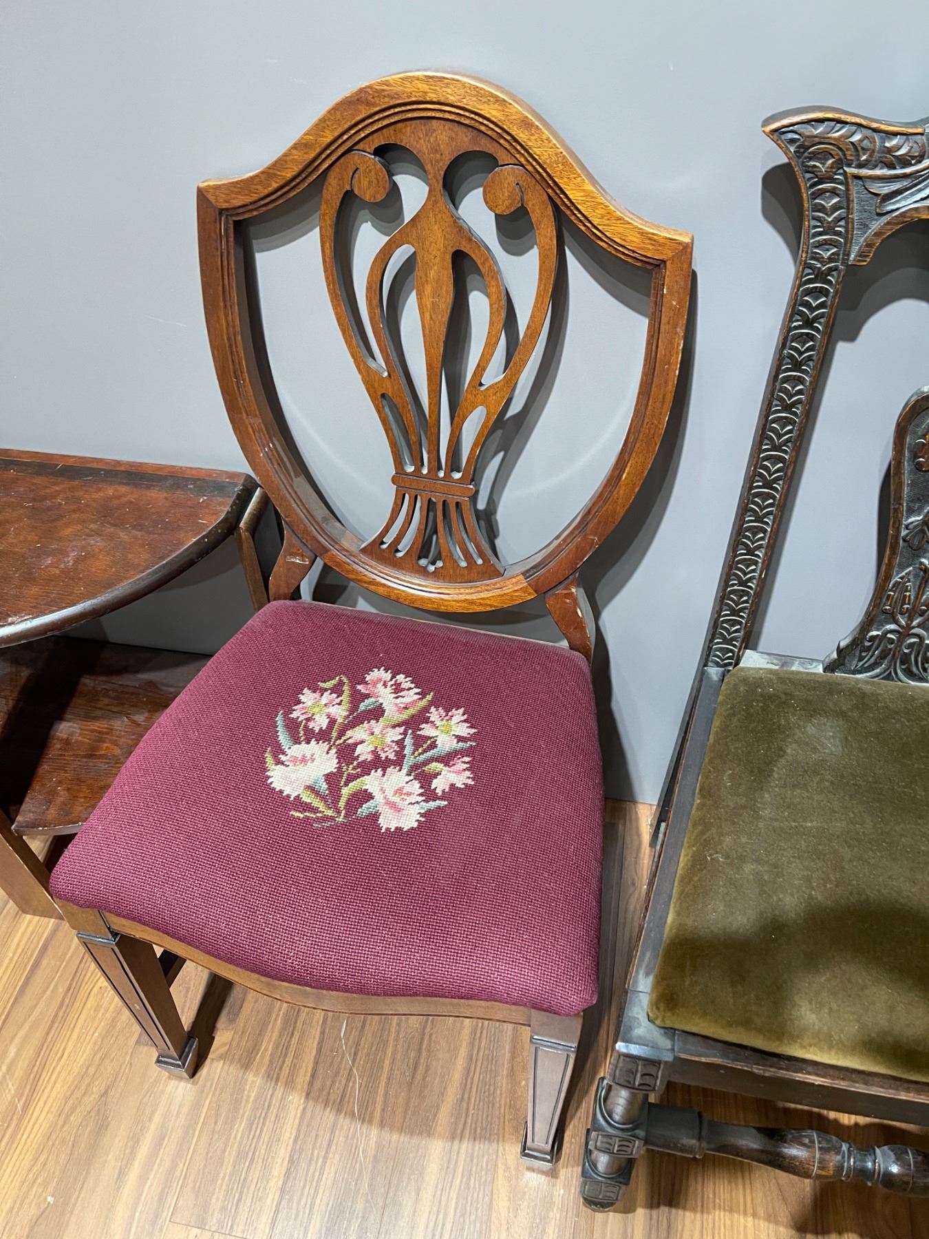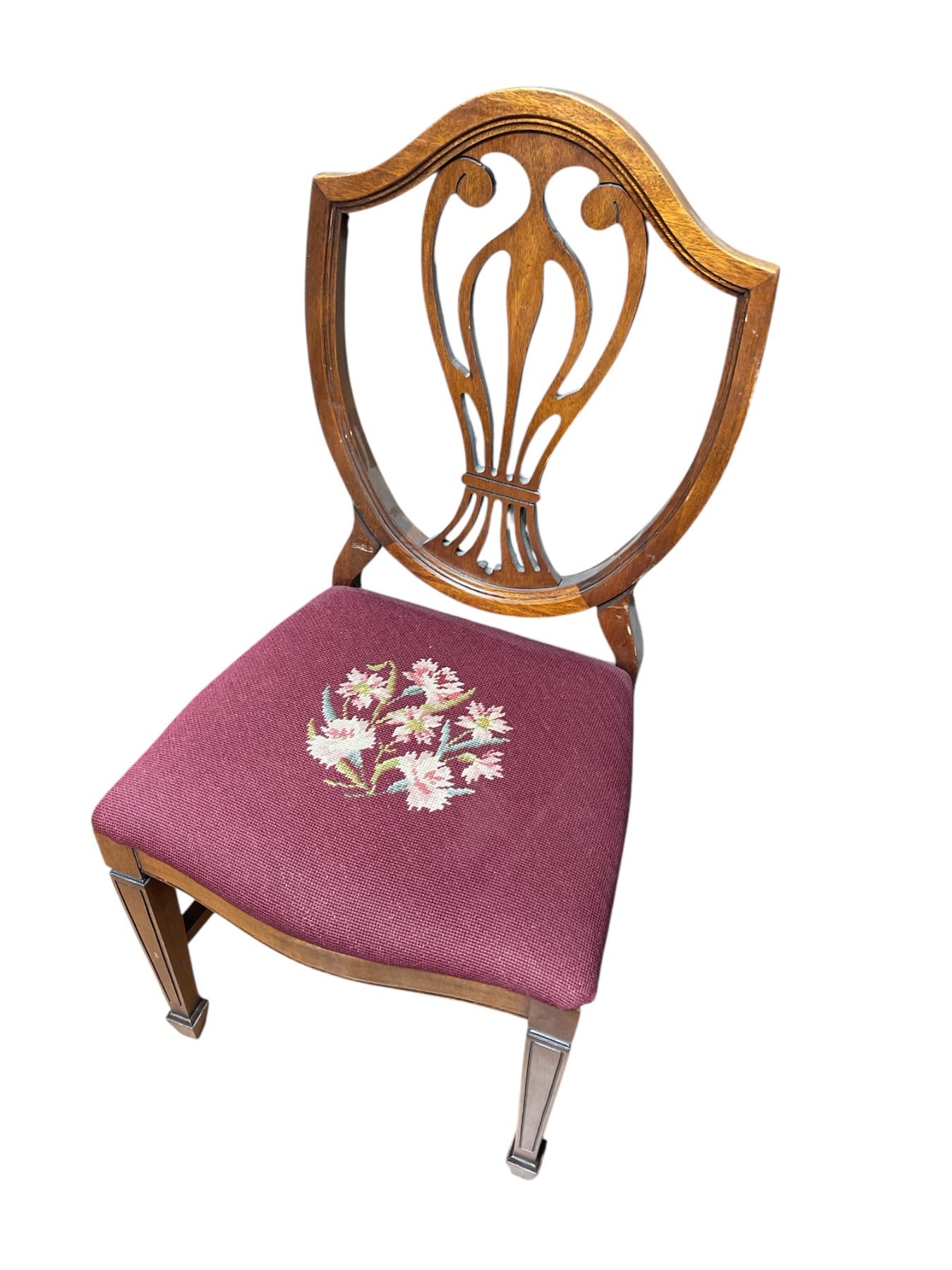 Duncan Phyfe style dining chair featuring an embroidered seat cushion. The chair has a height of 38.5-Inch. Classic design with a curved backrest and traditional craftsmanship. Item is as pictured.