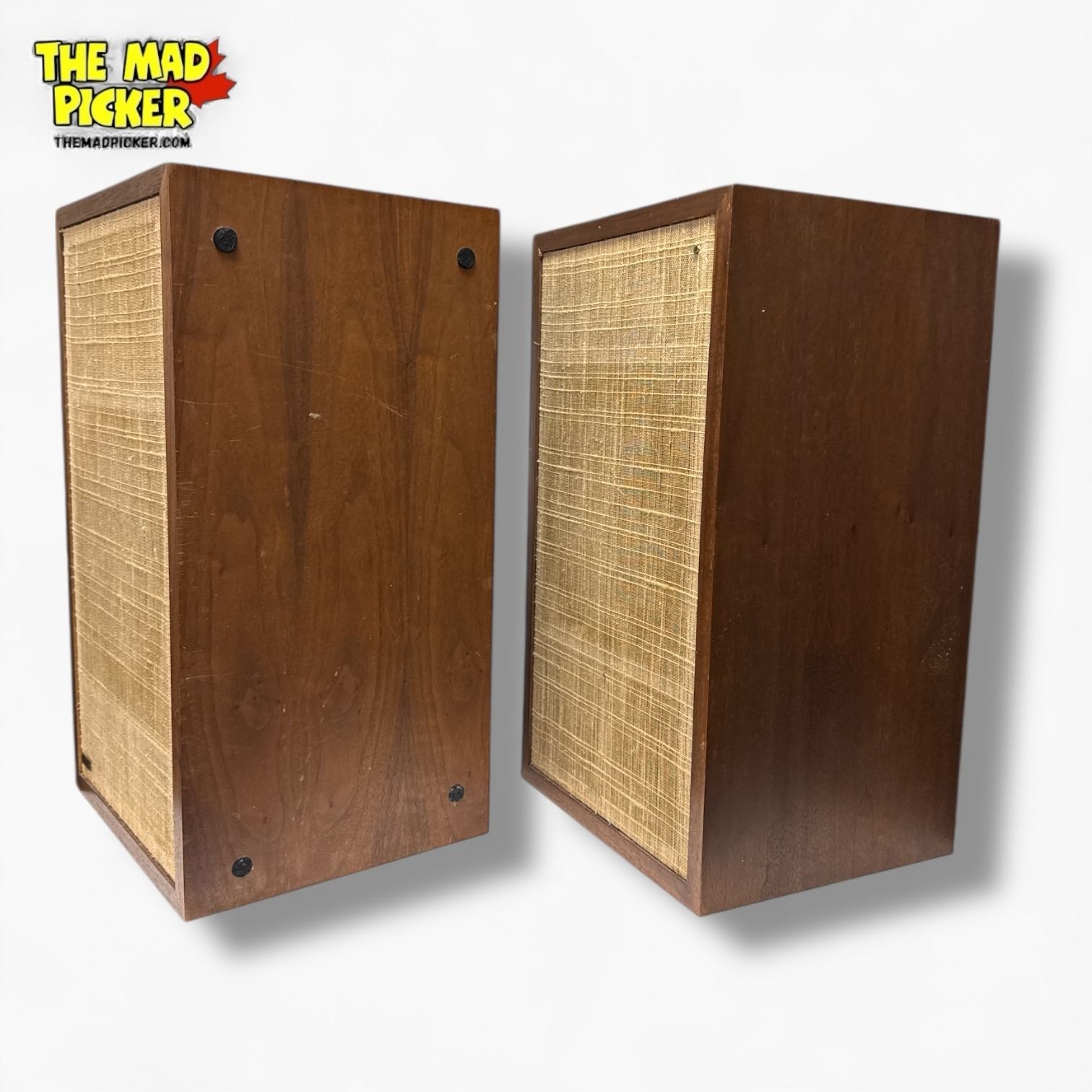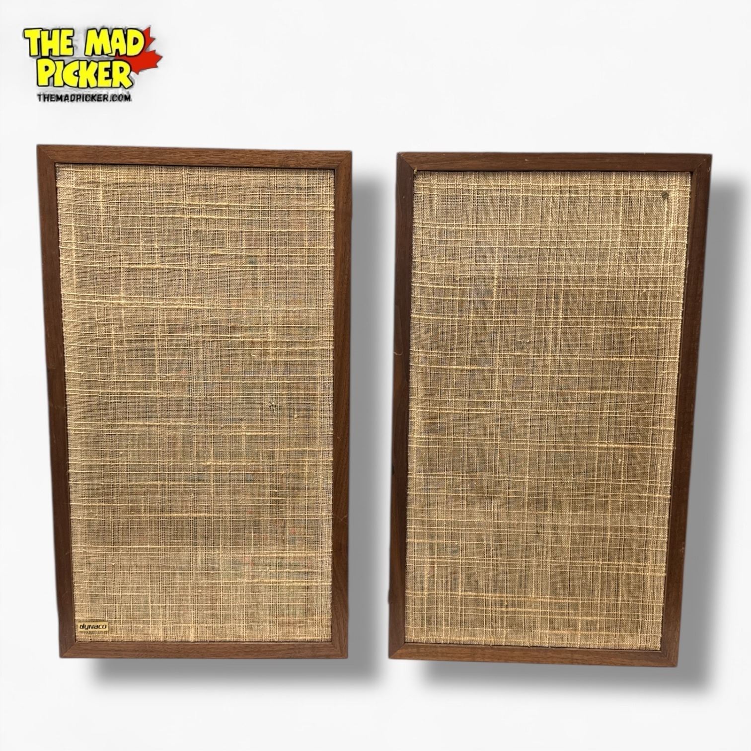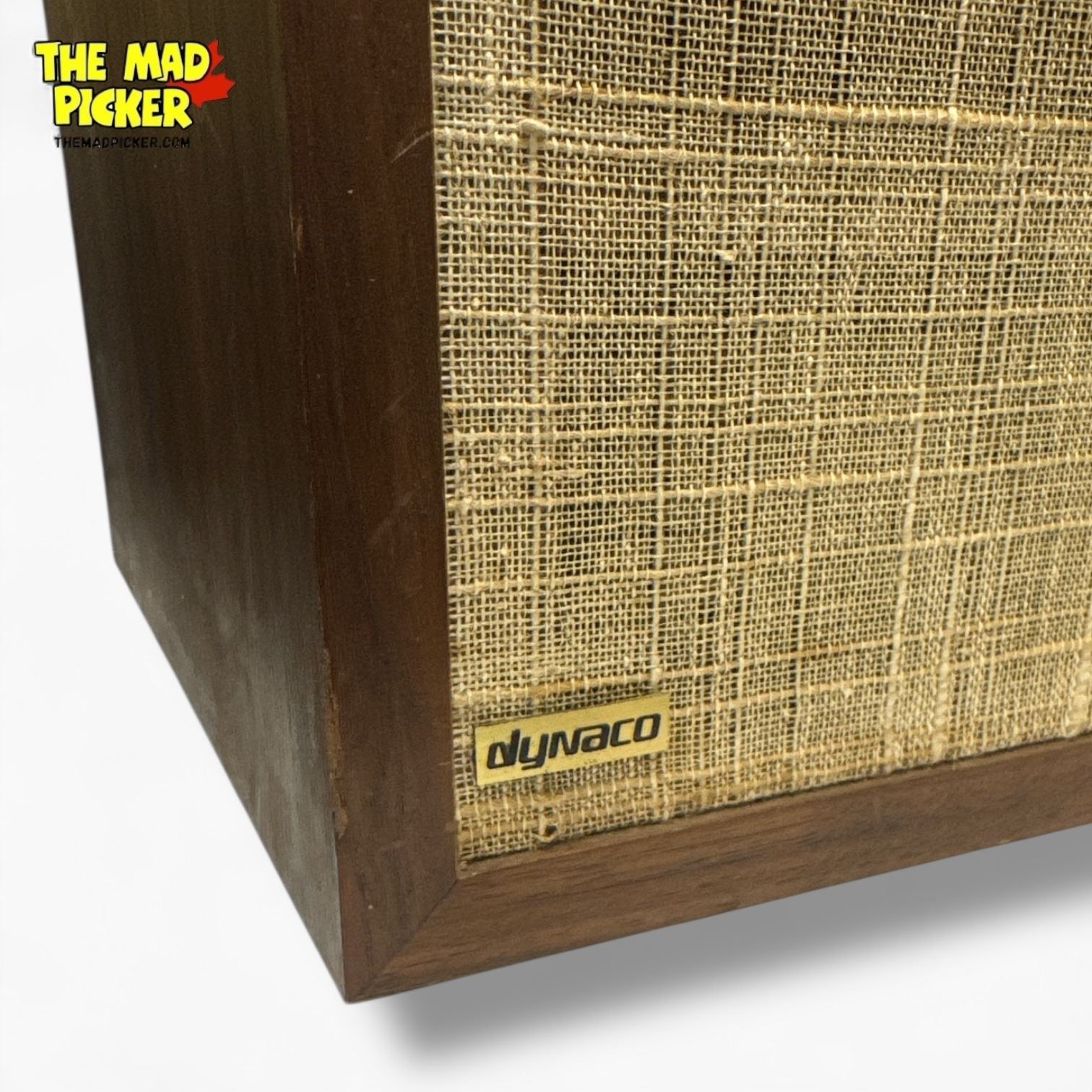 Dynaco A-25 speakers, produced in the early 1970s. Features 10-inch SEAS woofer with a 1.5-inch dome tweeter. Walnut veneer cabinet with front port design. 8-ohm impedance and 20-25,000 Hz frequency response. Compact bookshelf design measures approximately 11.5 x 20 x 10 inches.