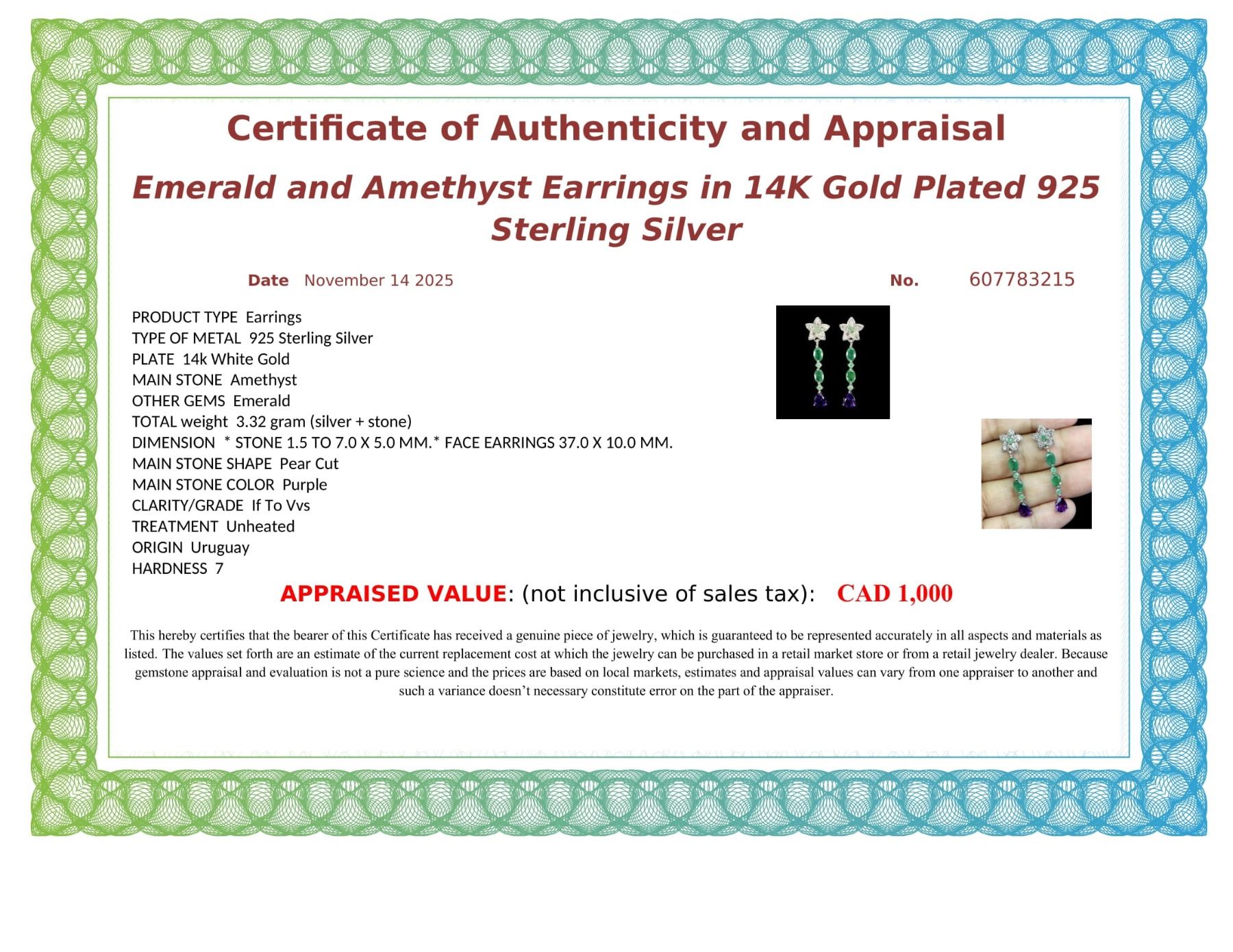 EMERALD AND AMETHYST EARRINGS IN 14K WHITE PLATED GOLD OVER 925 STERLING SILVER – APPRAISED REPLACEMENT VALUE $ 1,000