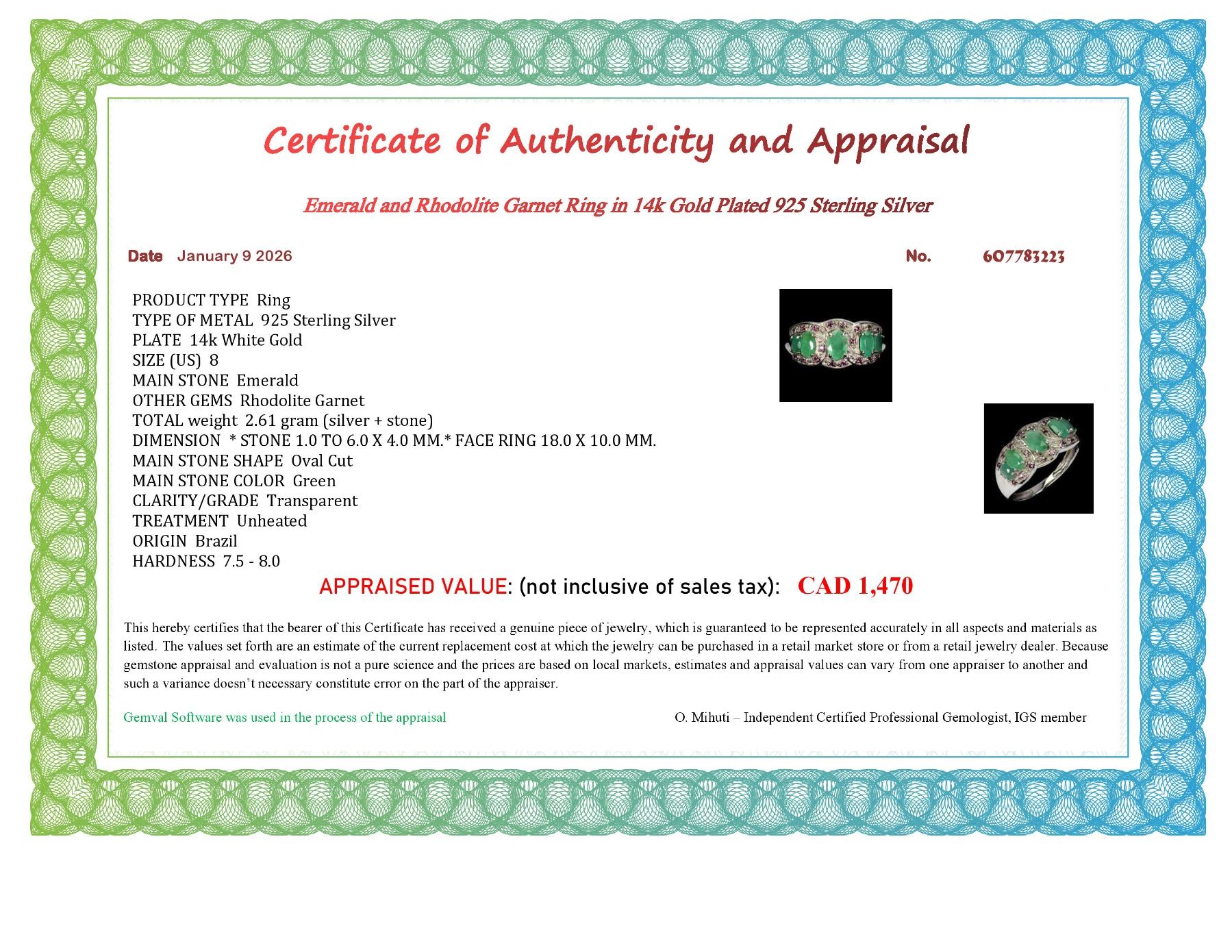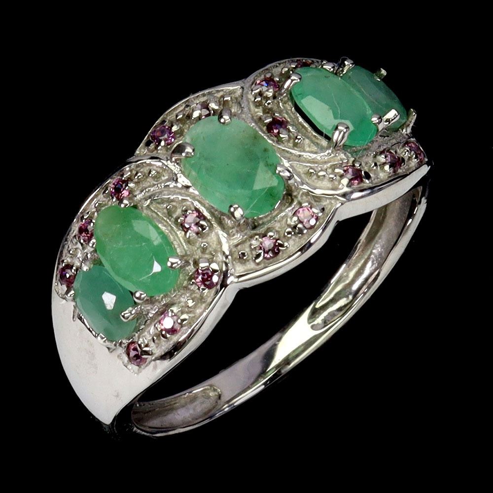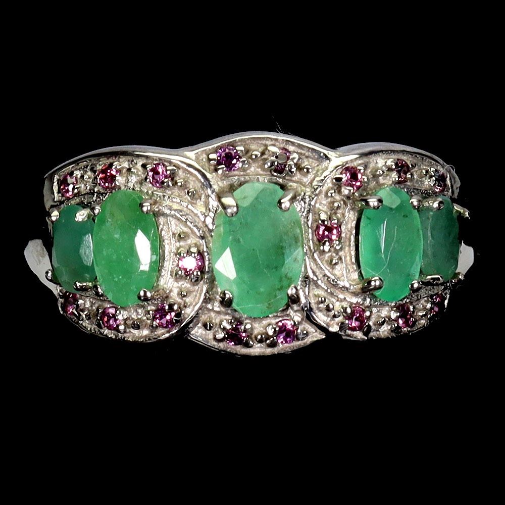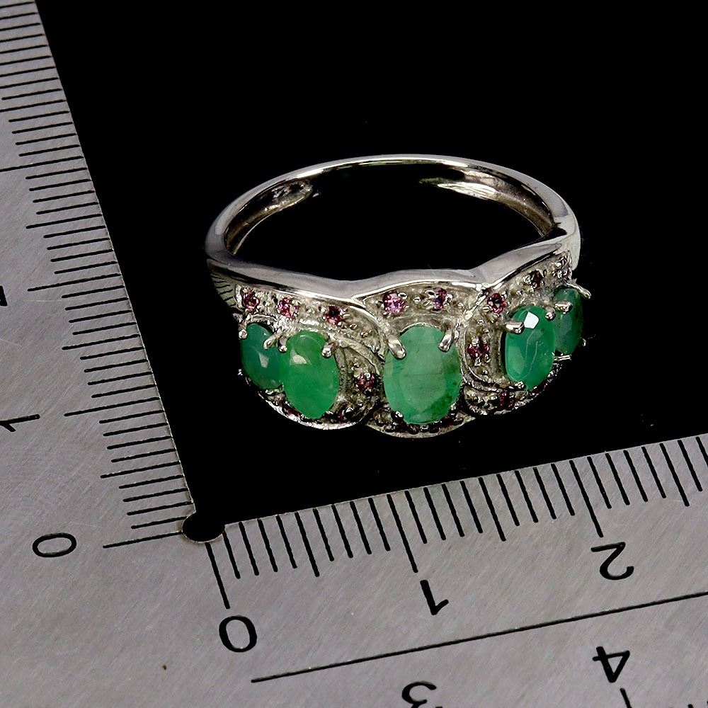 EMERALD AND RHODOLITE GARNET RING IN 14K WHITE PLATED GOLD OVER 925 STERLING SILVER - SIZE 8 - APPRAISED REPLACEMENT VALUE CAD 1,470