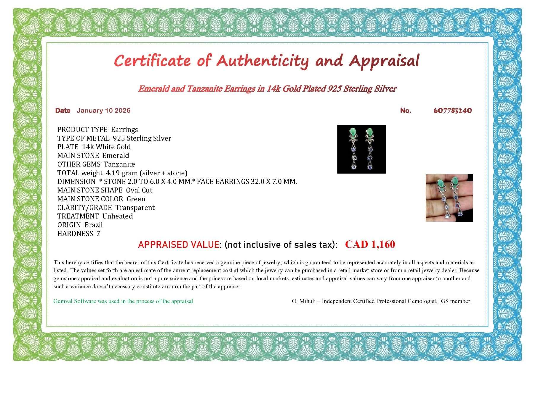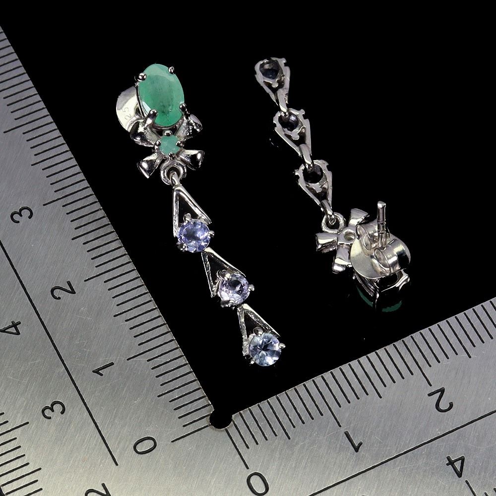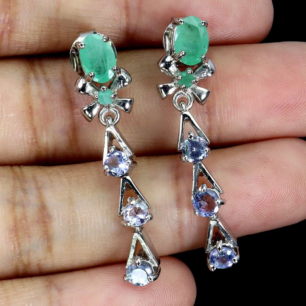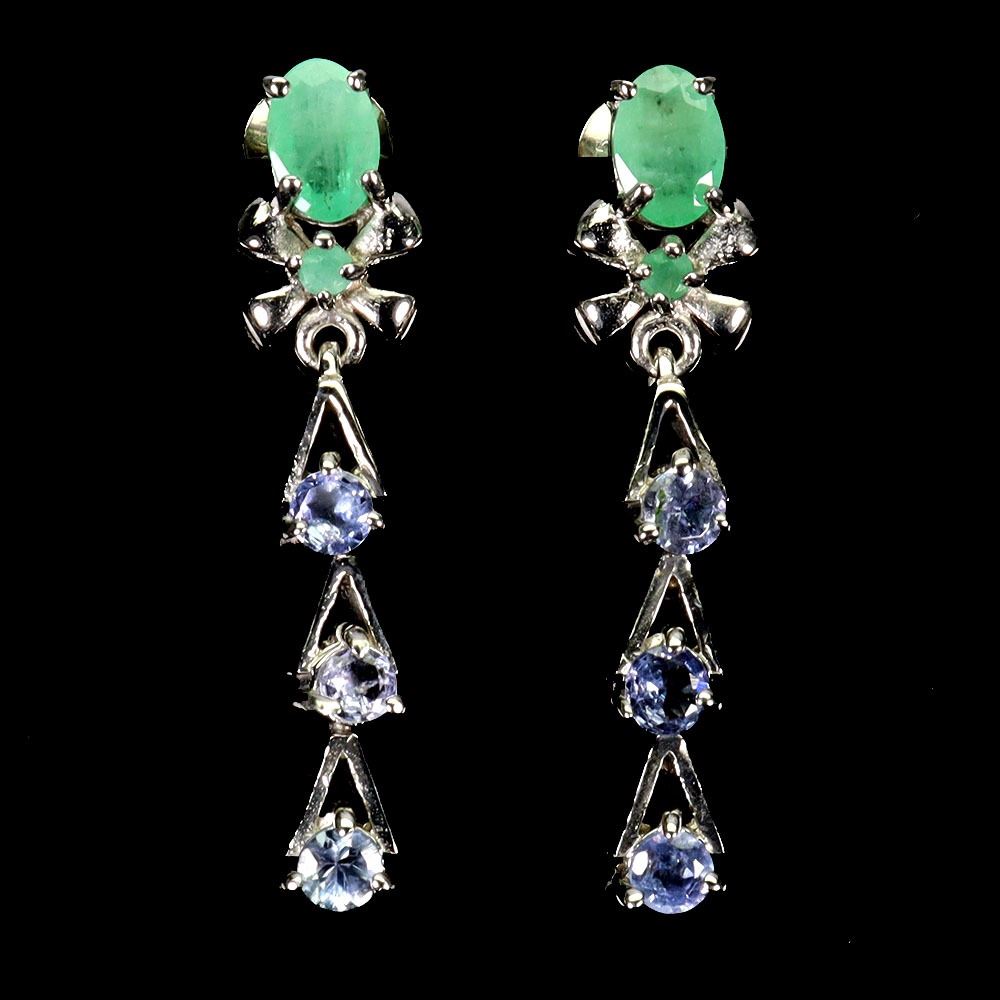 EMERALD AND TANZANITE EARRINGS IN 14K WHITE PLATED GOLD OVER 925 STERLING SILVER - APPRAISED REPLACEMENT VALUE CAD 1,160
