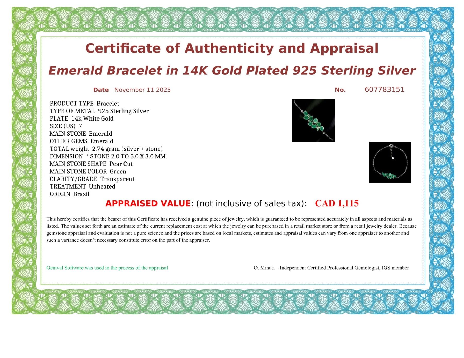 EMERALD BRACELET IN 14K WHITE PLATED GOLD OVER 925 STERLING SILVER - 7 INCHES LONG - APPRAISED REPLACEMENT VALUE $ 1,115