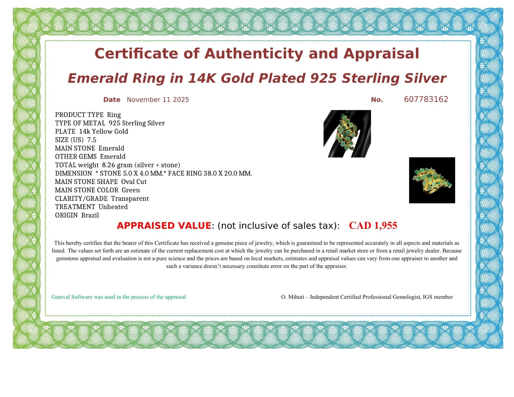 EMERALD RING IN 14K YELLOW PLATED GOLD OVER 925 STERLING SILVER - SIZE 7.5 - APPRAISED REPLACEMENT VALUE $ 1,955