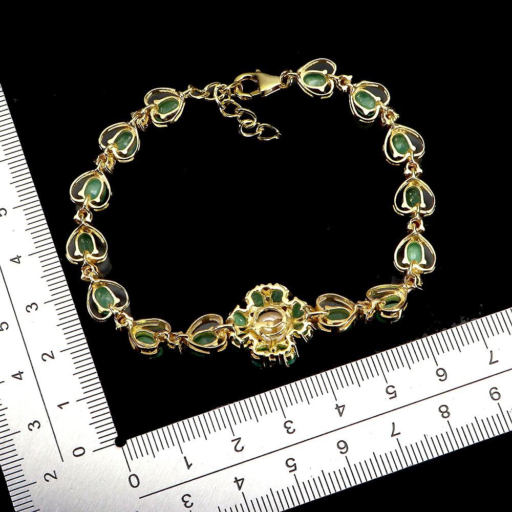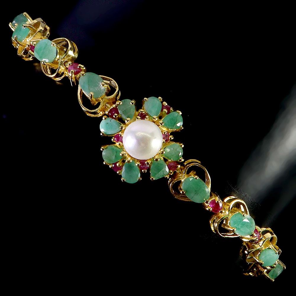 EMERALD, RUBIES AND PEARL BRACELET IN 14K YELLOW PLATED GOLD OVER 925 STERLING SILVER - 8 INCHES LONG - APPRAISED REPLACEMENT VALUE CAD 4,145