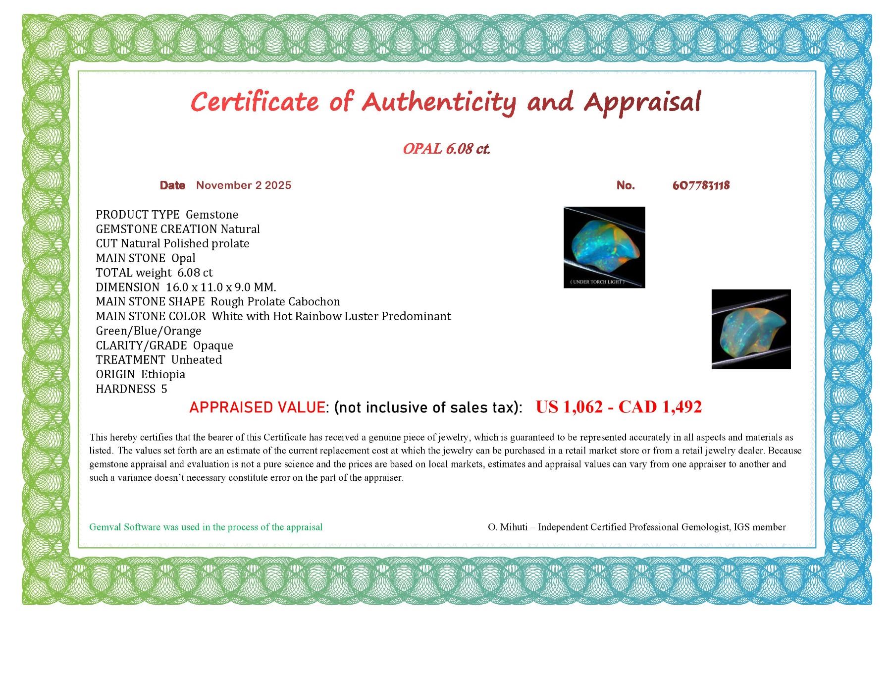 EXCELLENT AAA FLORAL FLASH PLAY OF COLOR CRYSTAL FIRE OPAL 9.03 CT. NATURAL - Appraised value CAD 1,492