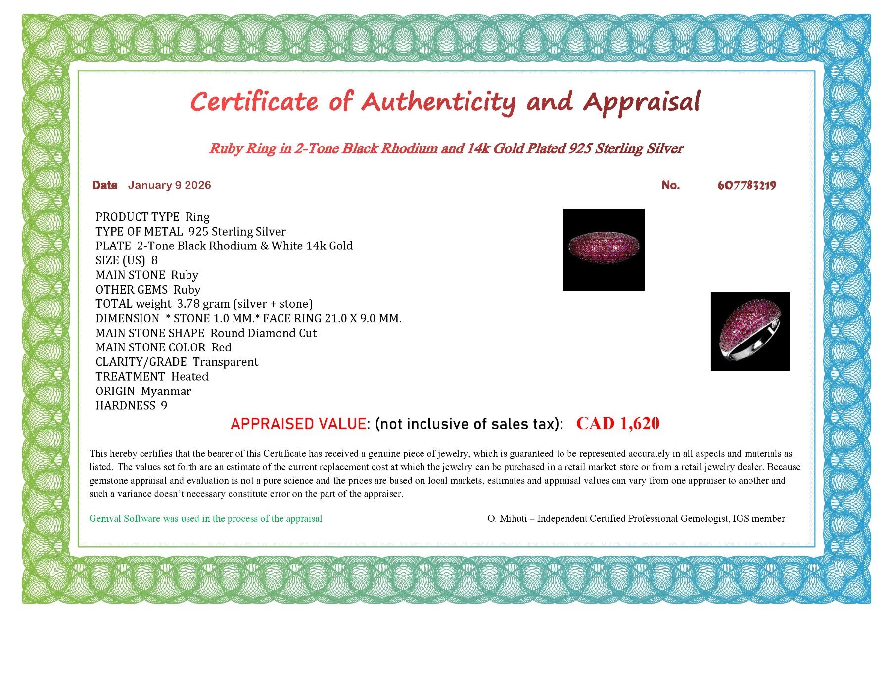 EXPENSIVE MYANMAR RUBY RING IN 2-TONE BLACK RHODIUM AND 14K WHITE PLATED GOLD OVER 925 STERLING SILVER - SIZE 8 - APPRAISED REPLACEMENT VALUE CAD 1,620 RUBIES FROM MYANMAR ARE THE MOST VALUABLE RUBIES IN THE WORLD