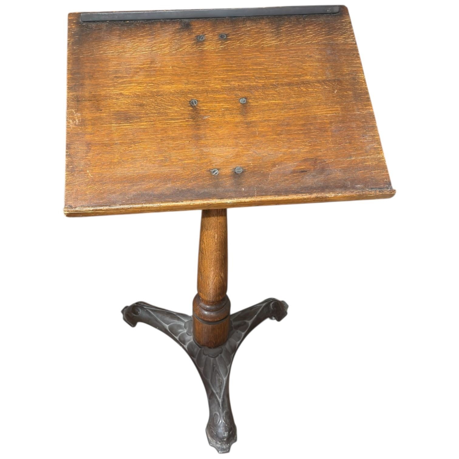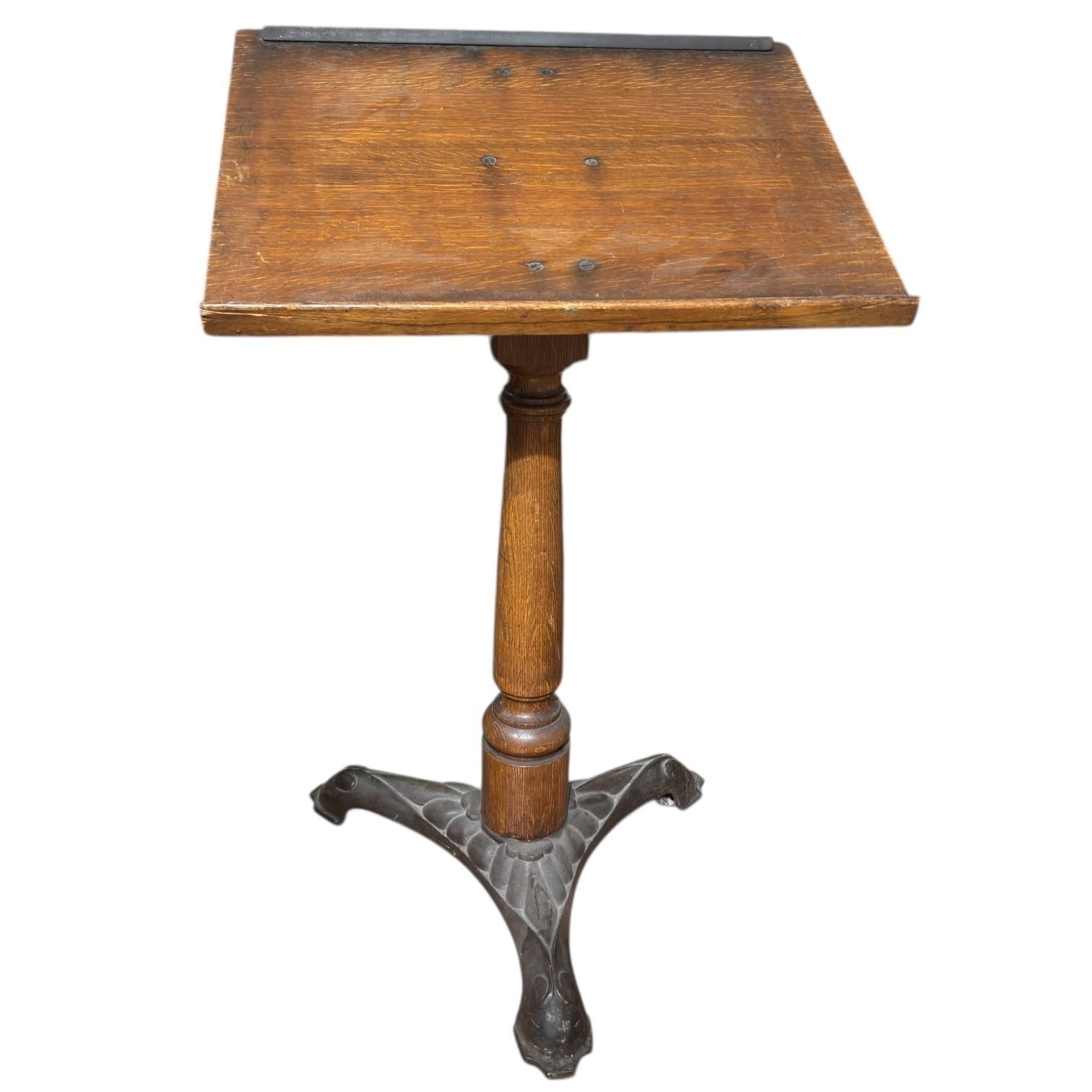 Early 20th century oak lectern featuring a cast iron base and great patina. The lectern measures 24-Inch in length, 17-Inch in width, and 40-Inch in height. The combination of oak wood and cast iron provides a sturdy construction. Item is as pictured.