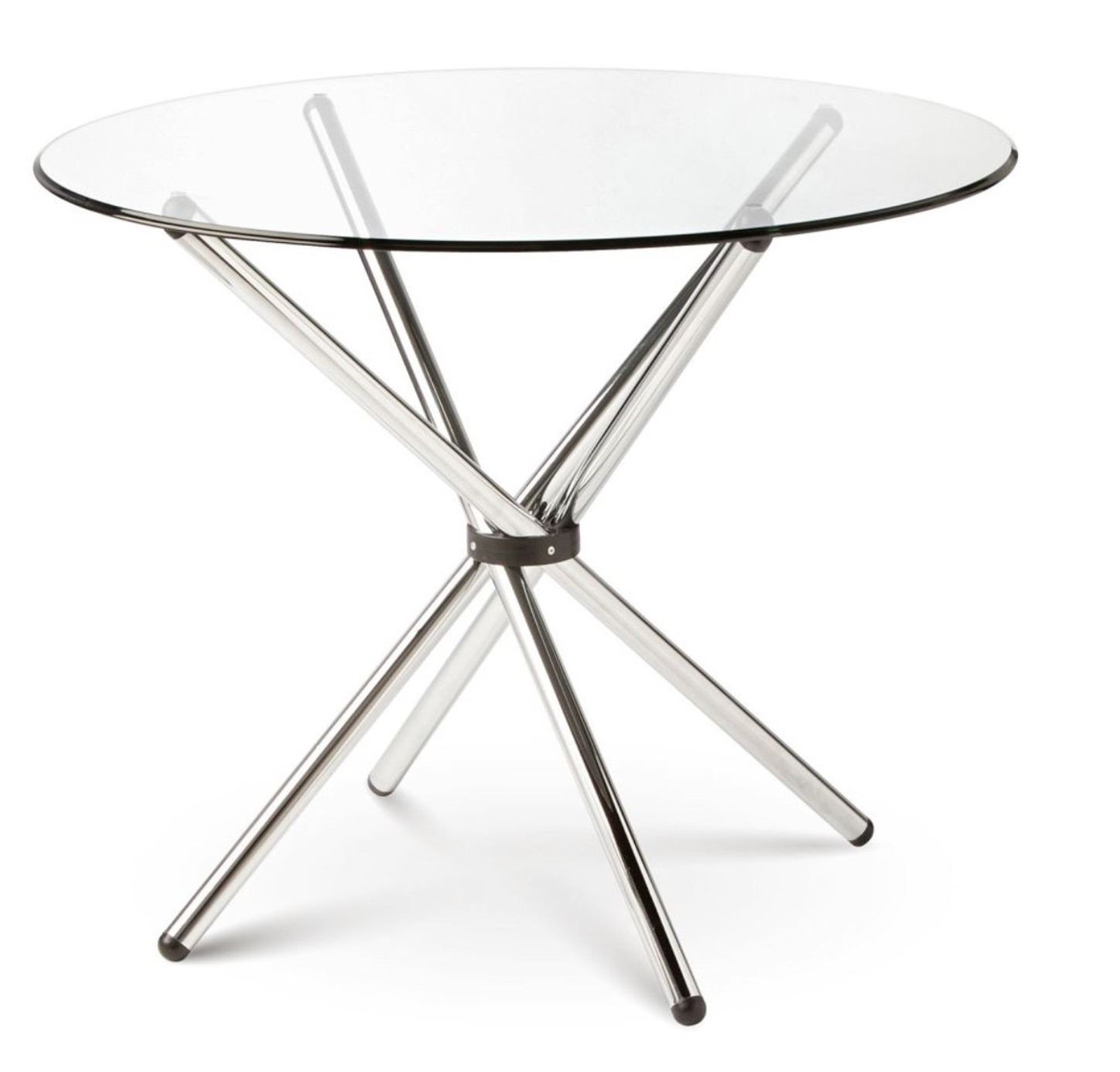 Only 35.5" in diameter, the round tempered glass top floats on top of polished chrome legs, making this smaller-scale dining table perfect for condo living or spaces with size constraints.