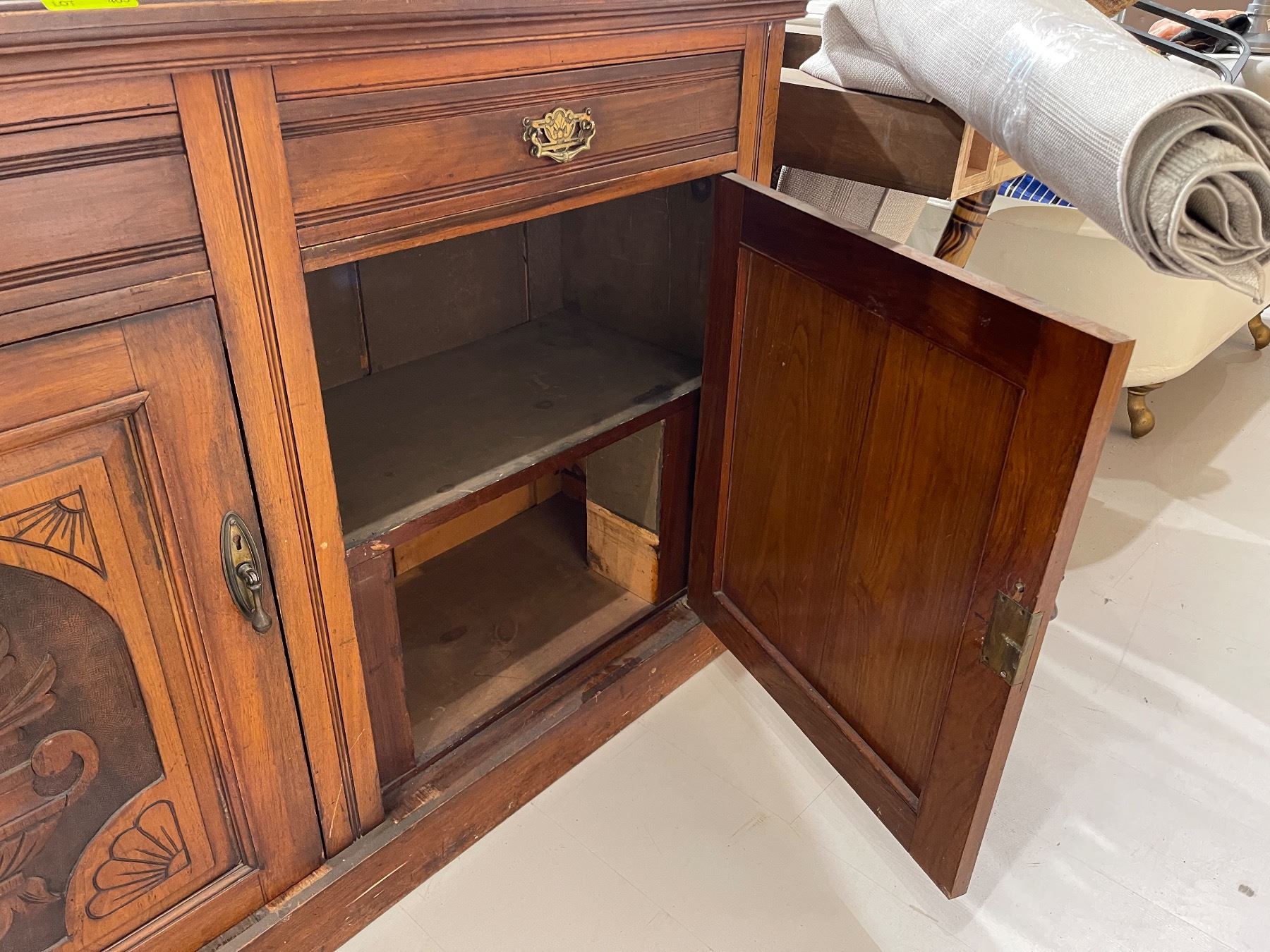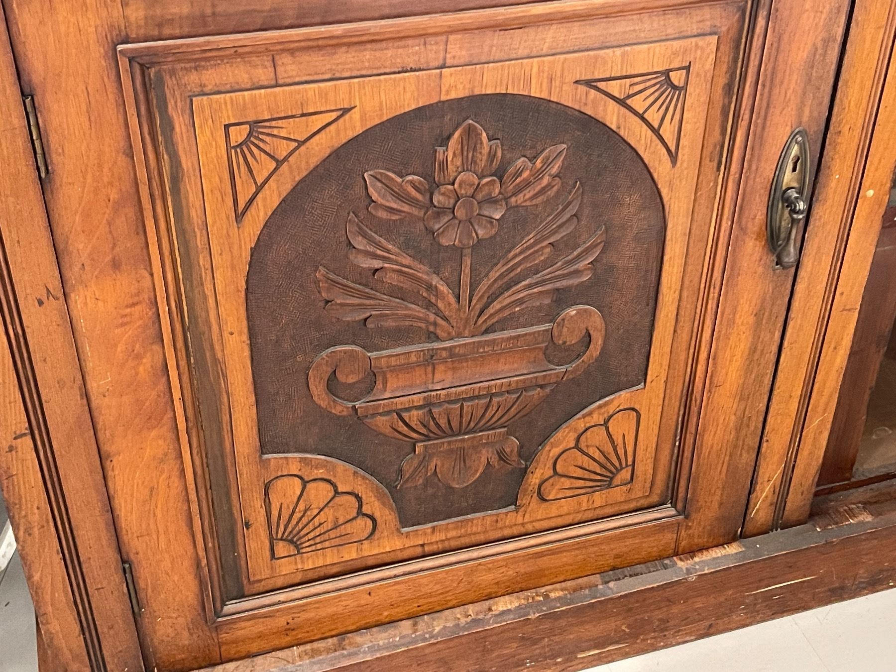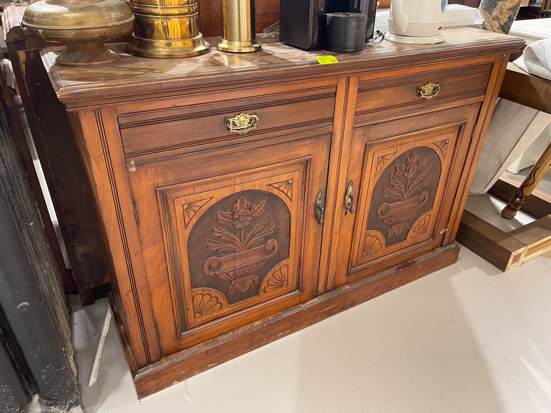 Edwardian Style Compact Sideboard with Carved Floral Door Panels (16" x 53" x 39" tall at the back)