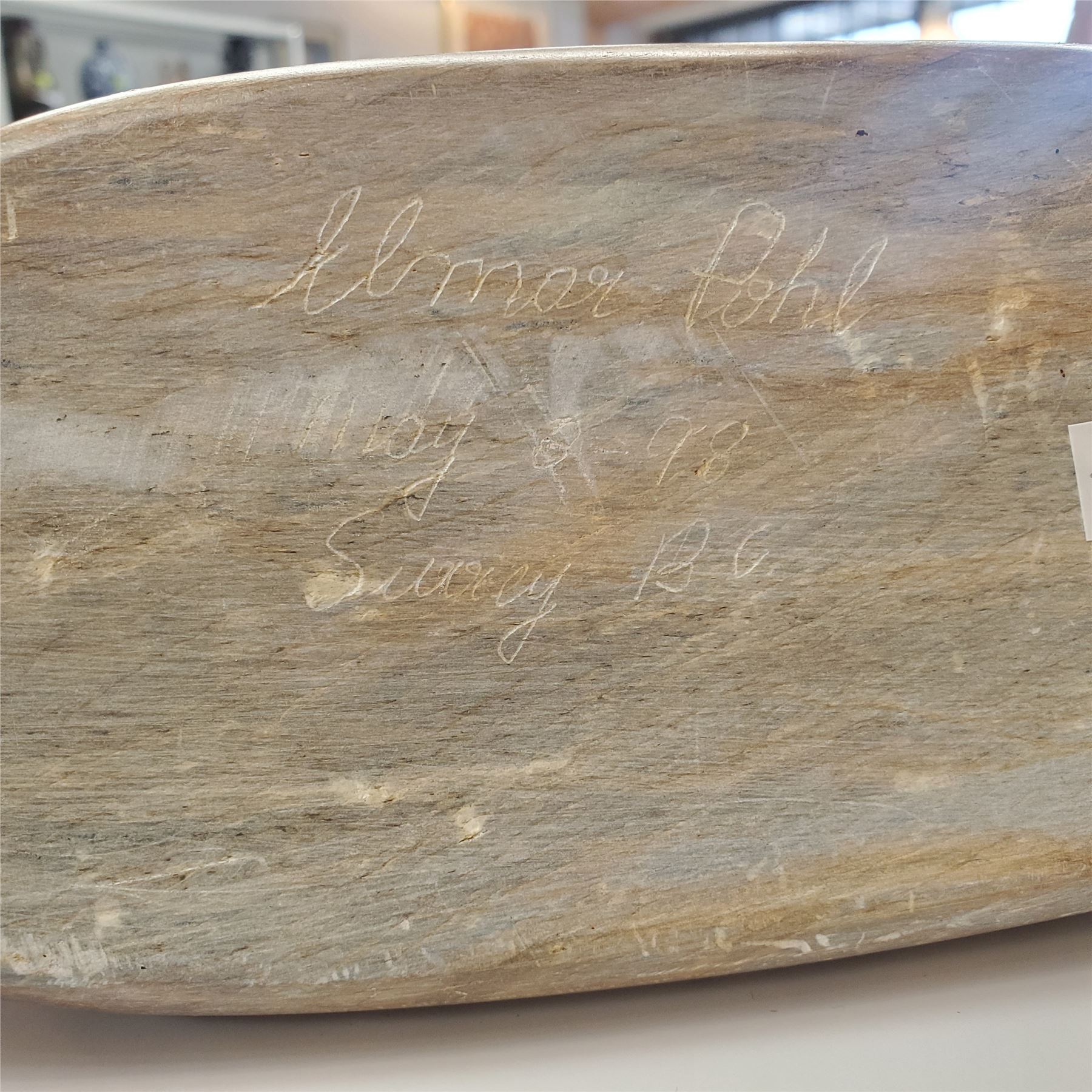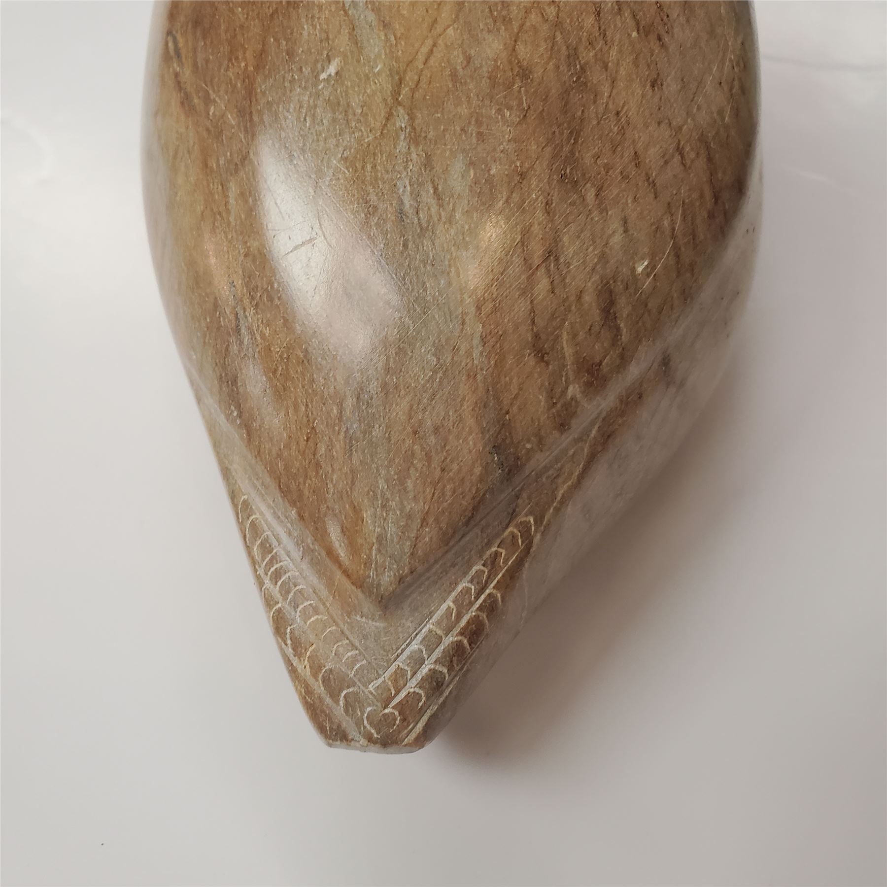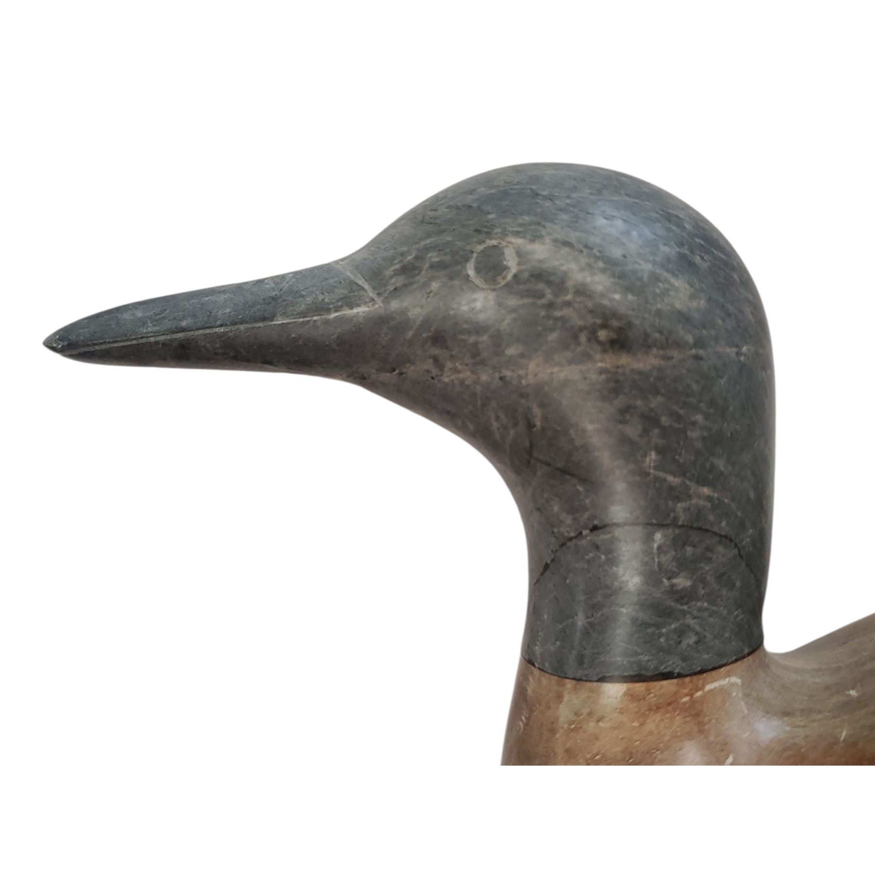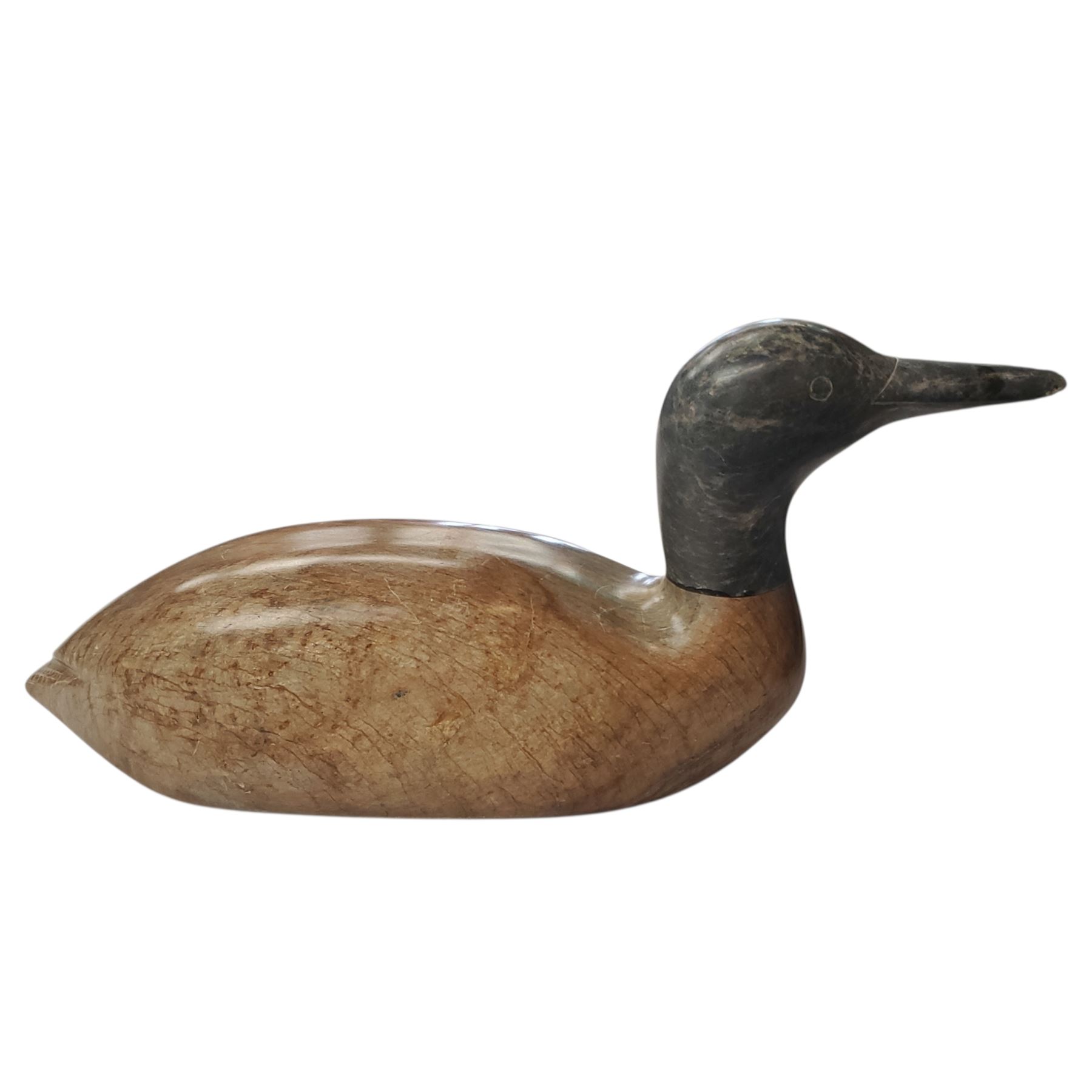 Soapstone duck sculpture carved by Canadian artist Elmer Pohl in 1998. Measures 16 inches in length. Features natural soapstone texture and coloration, showcasing detailed craftsmanship. Signed by the artist on the base. Known for his wildlife carvings, Pohl worked primarily with soapstone.