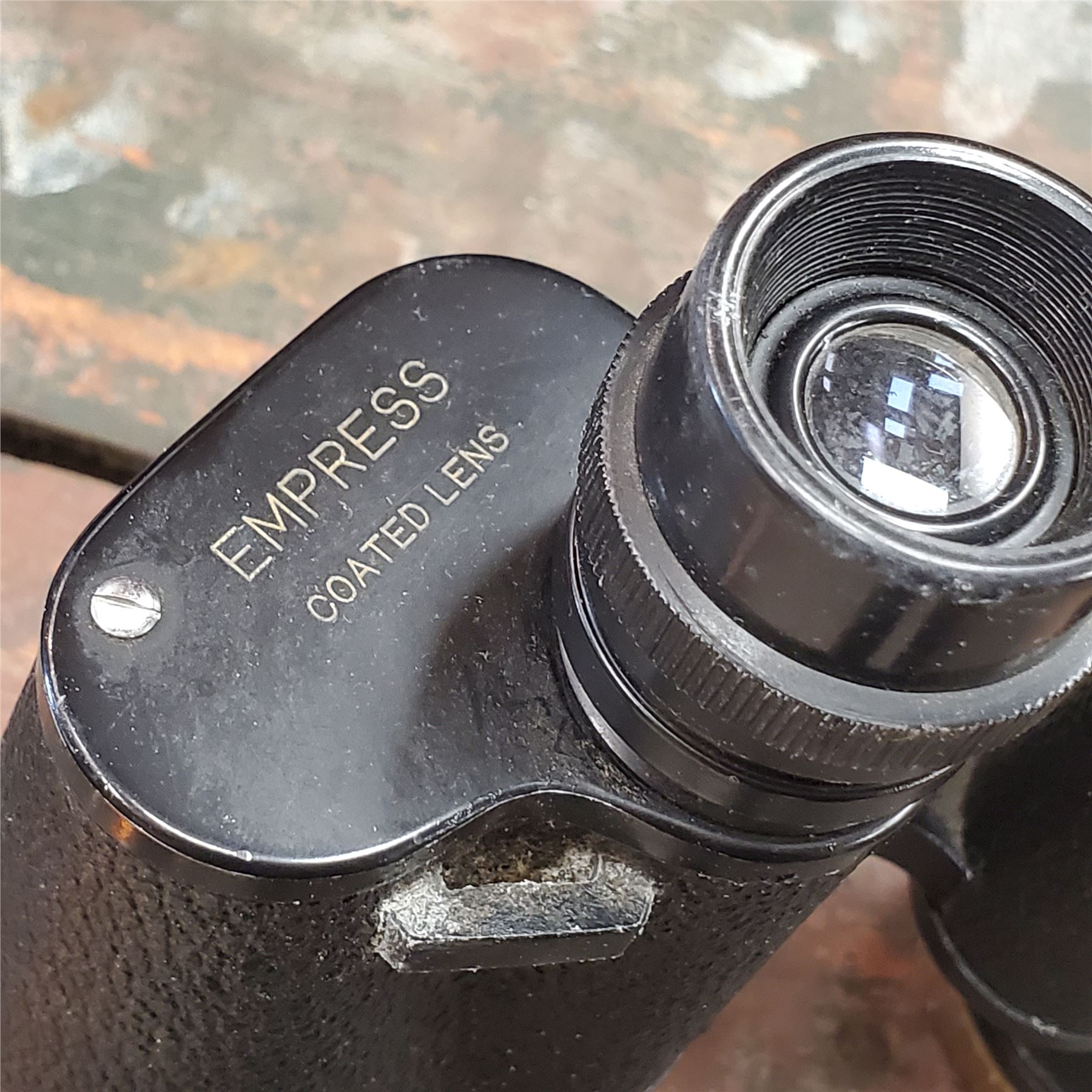 Pair of vintage Empress 7x50 binoculars with original leather carrying case. Features 7x magnification and 50mm objective lenses, suitable for detailed viewing. Manufactured mid-20th century. Includes adjustable focus and a durable, protective brown leather case with shoulder strap.