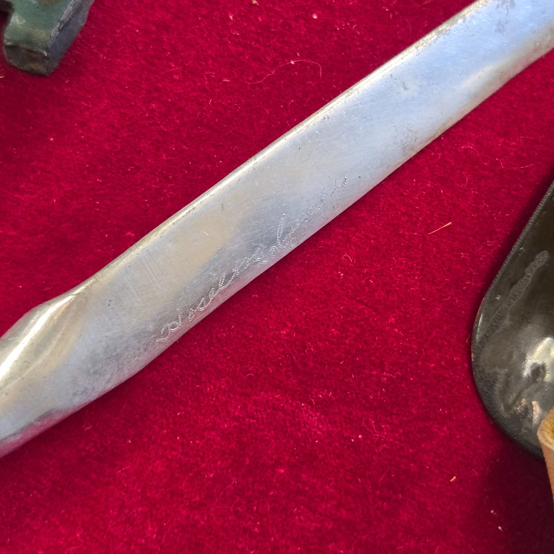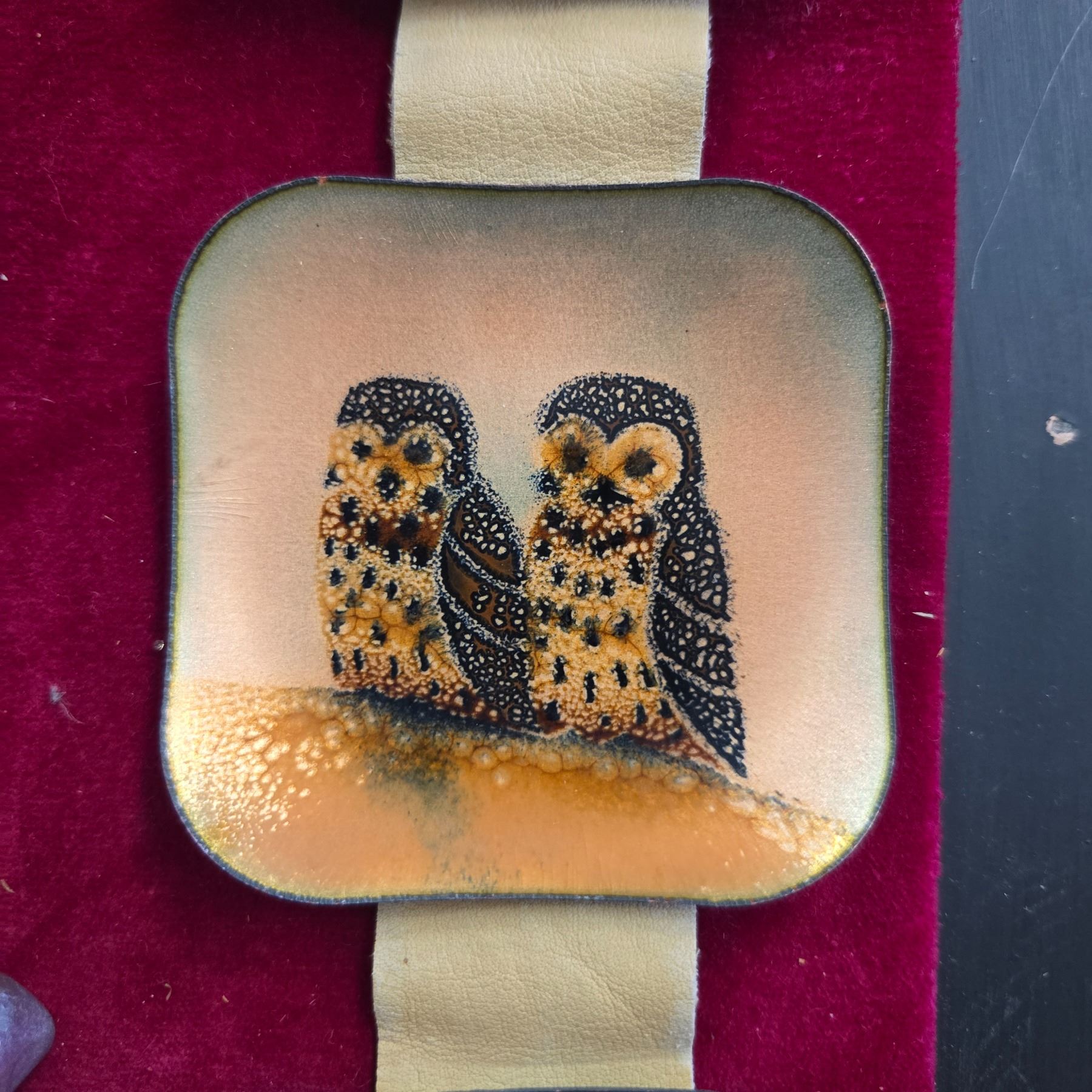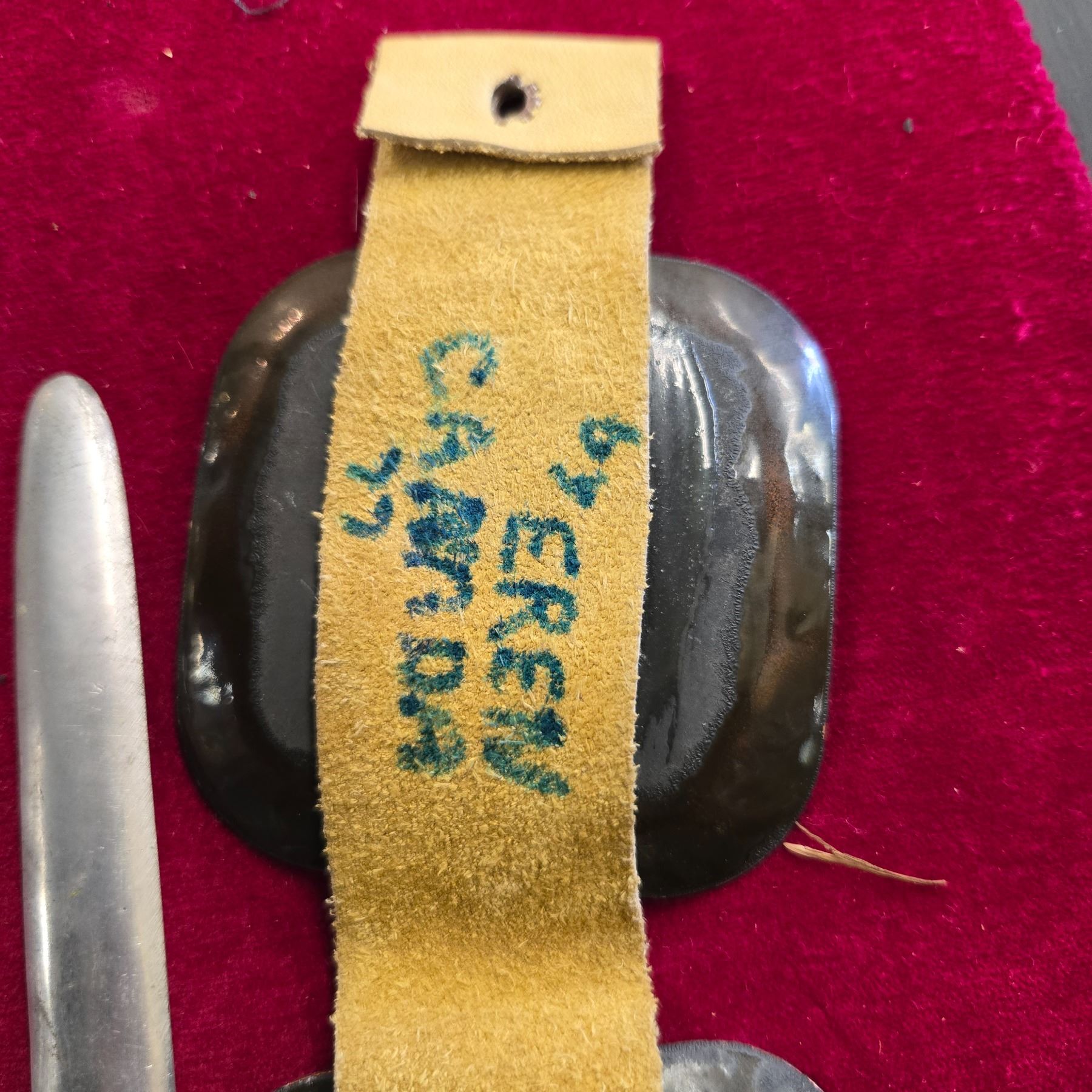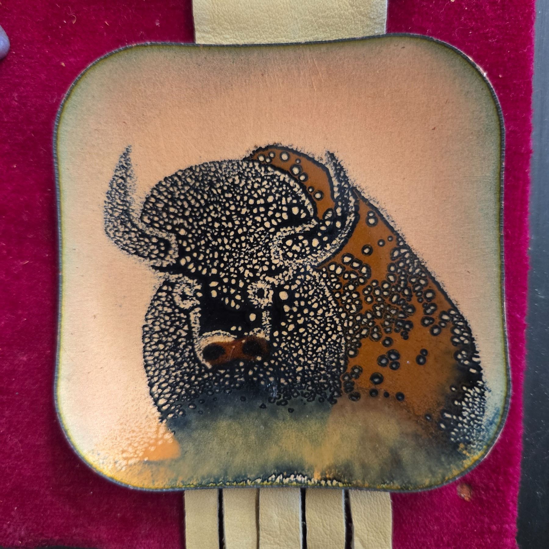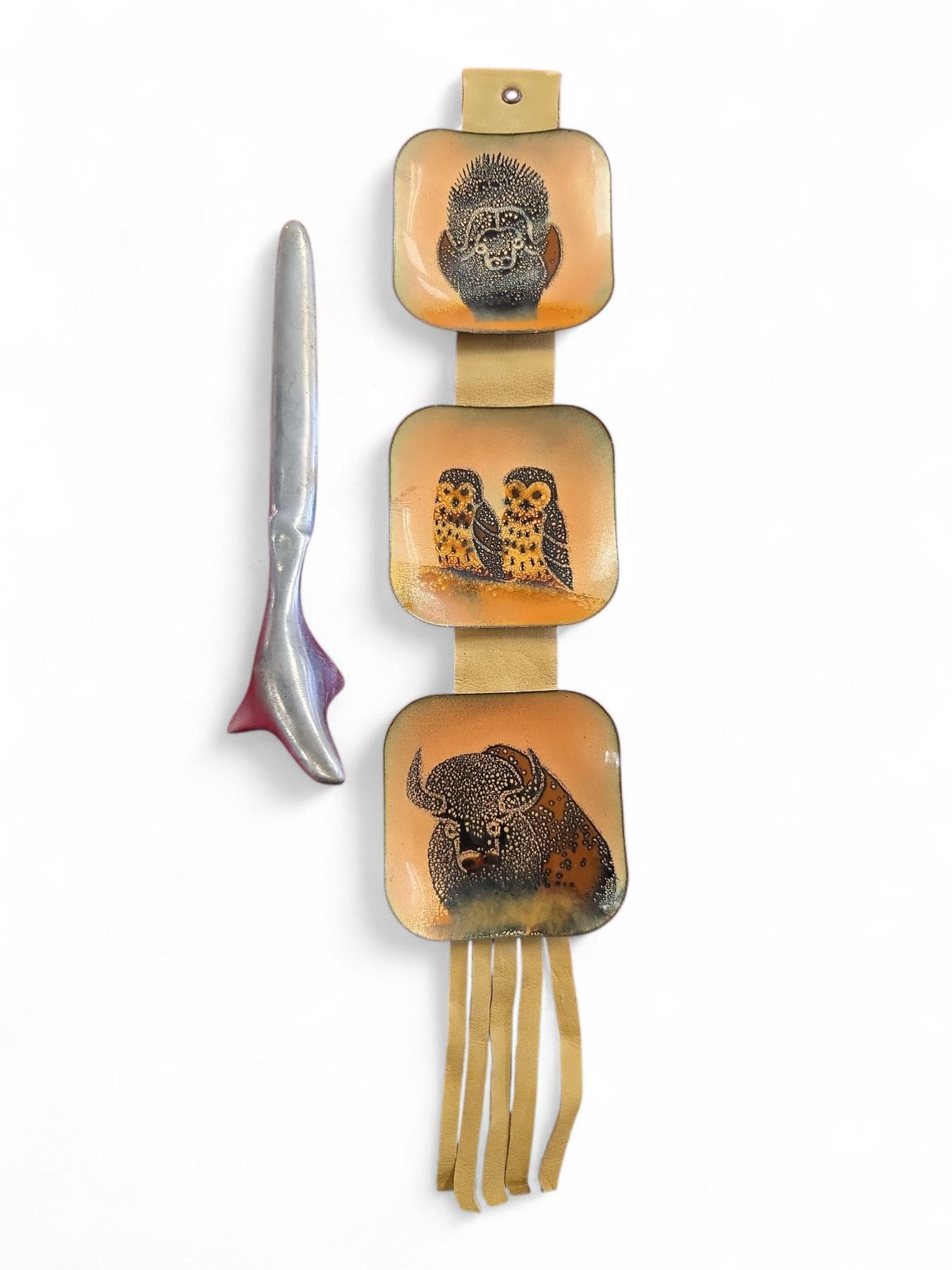 Lot includes an enamel on copper wall hanging featuring images of owls and bison, along with a pewter seal letter opener with First Nations designs. Both items showcase craftsmanship and Indigenous artistic influences. Item is as pictured.