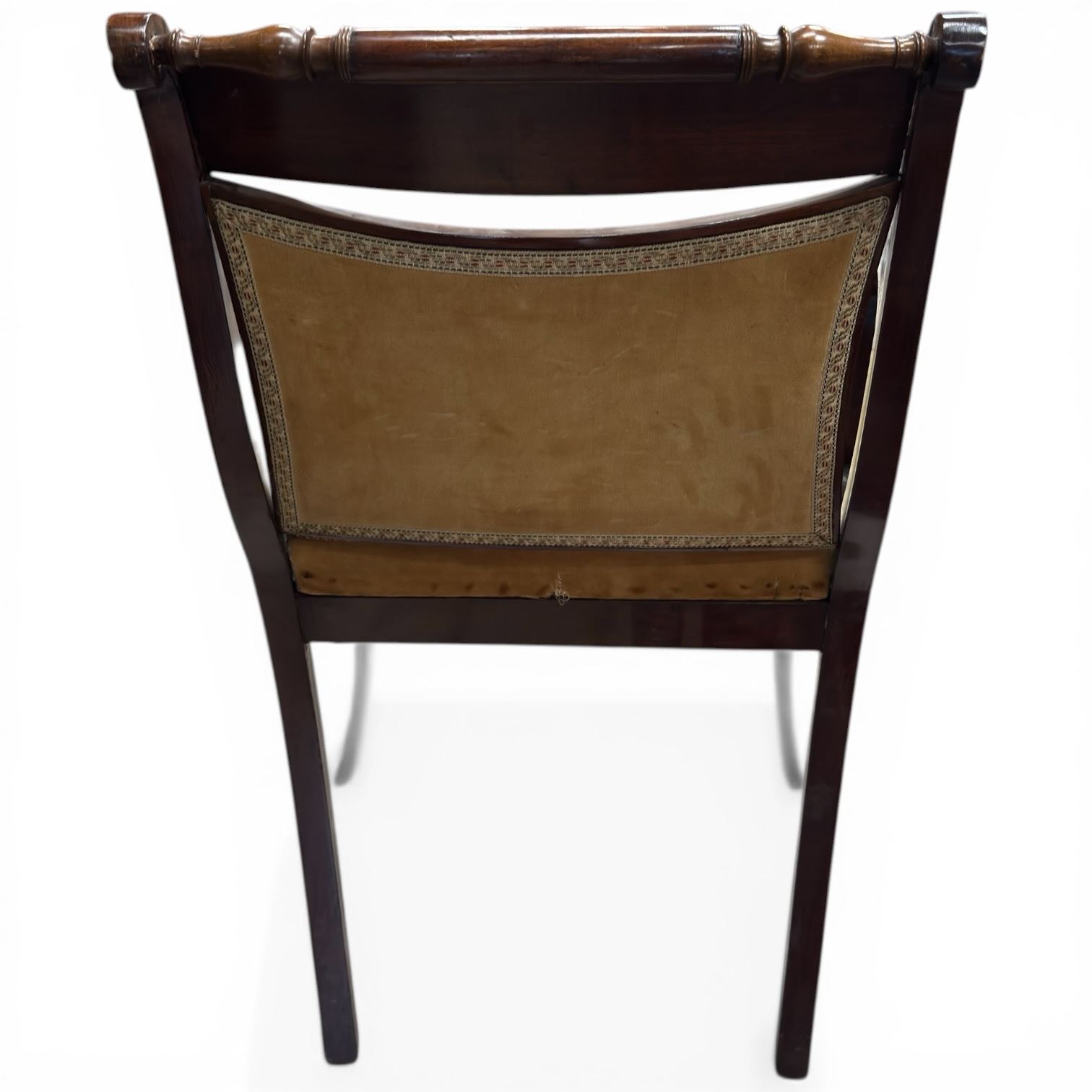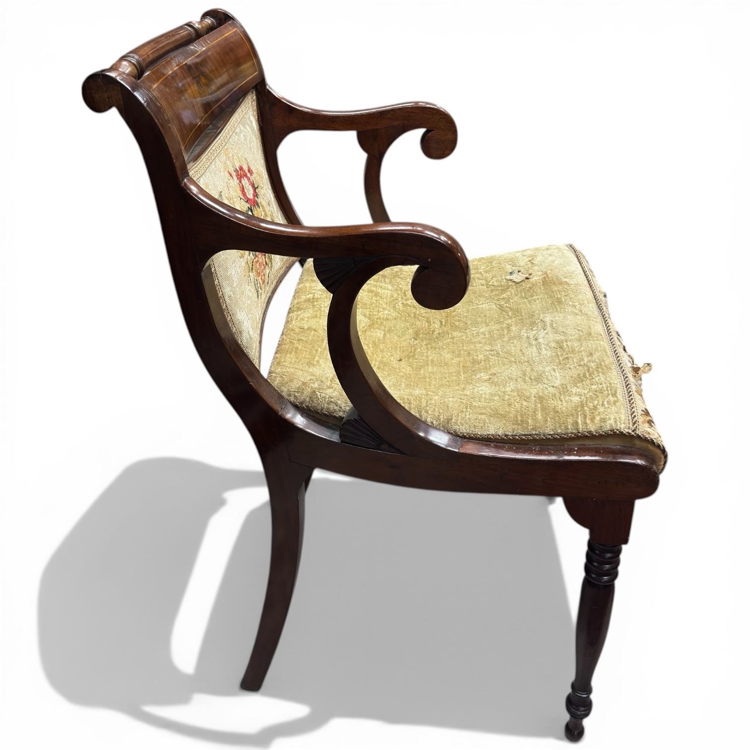English Regency Scroll Arm Mahogany Carver Chair with Tapestry Upholstery