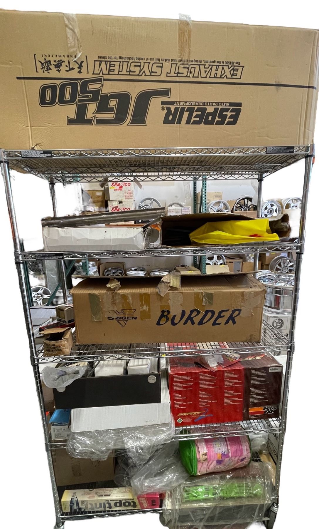 Entire shelf full of assorted misc - includes wheel caps / high flow air filter / windscreen wiper covers set