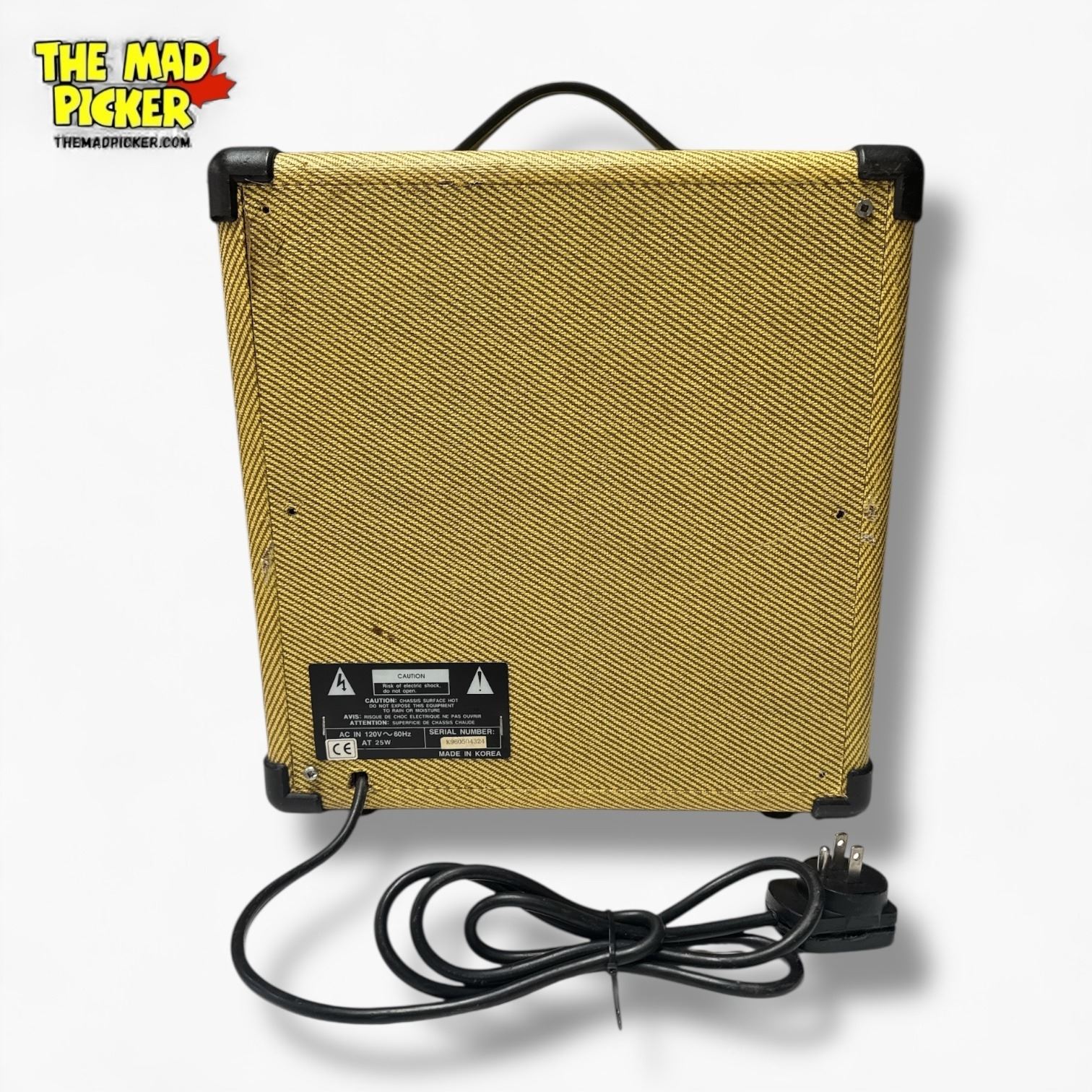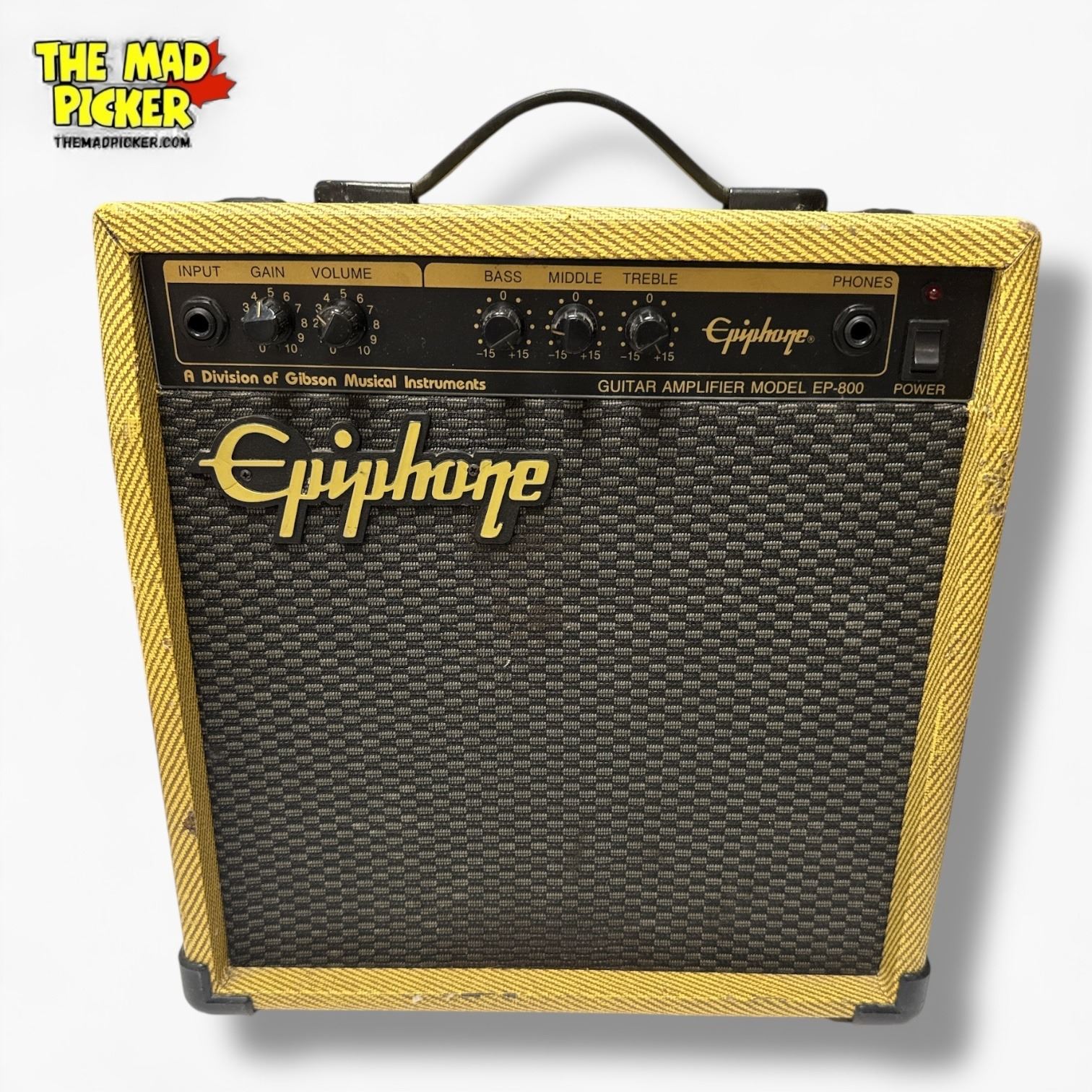Epiphone EP-800 guitar amplifier, solid-state model from the 1980s. Features 10-watt output, single 8-inch speaker, and basic control knobs for volume, bass, and treble. Compact design suited for practice or small venues. Made in Japan during the brand's partnership with Norlin.