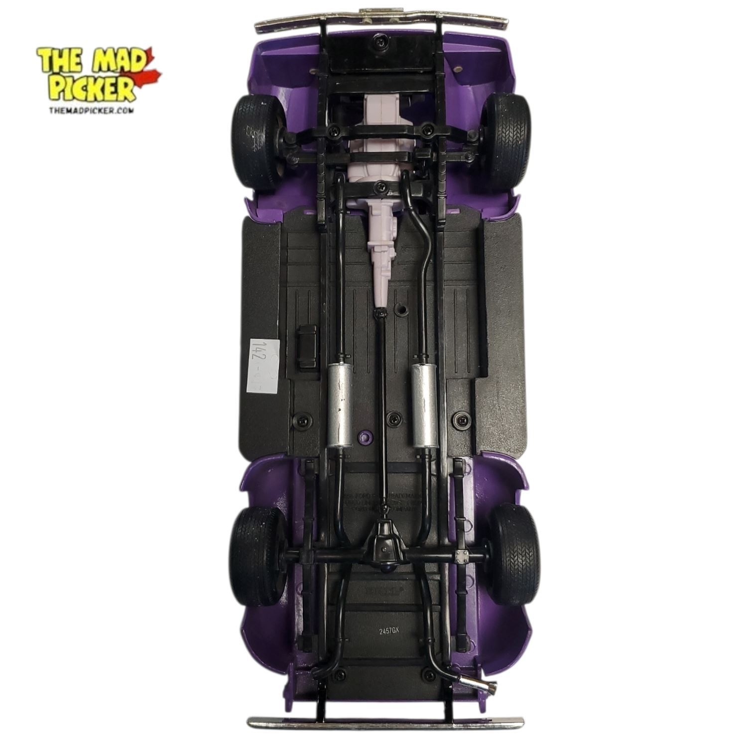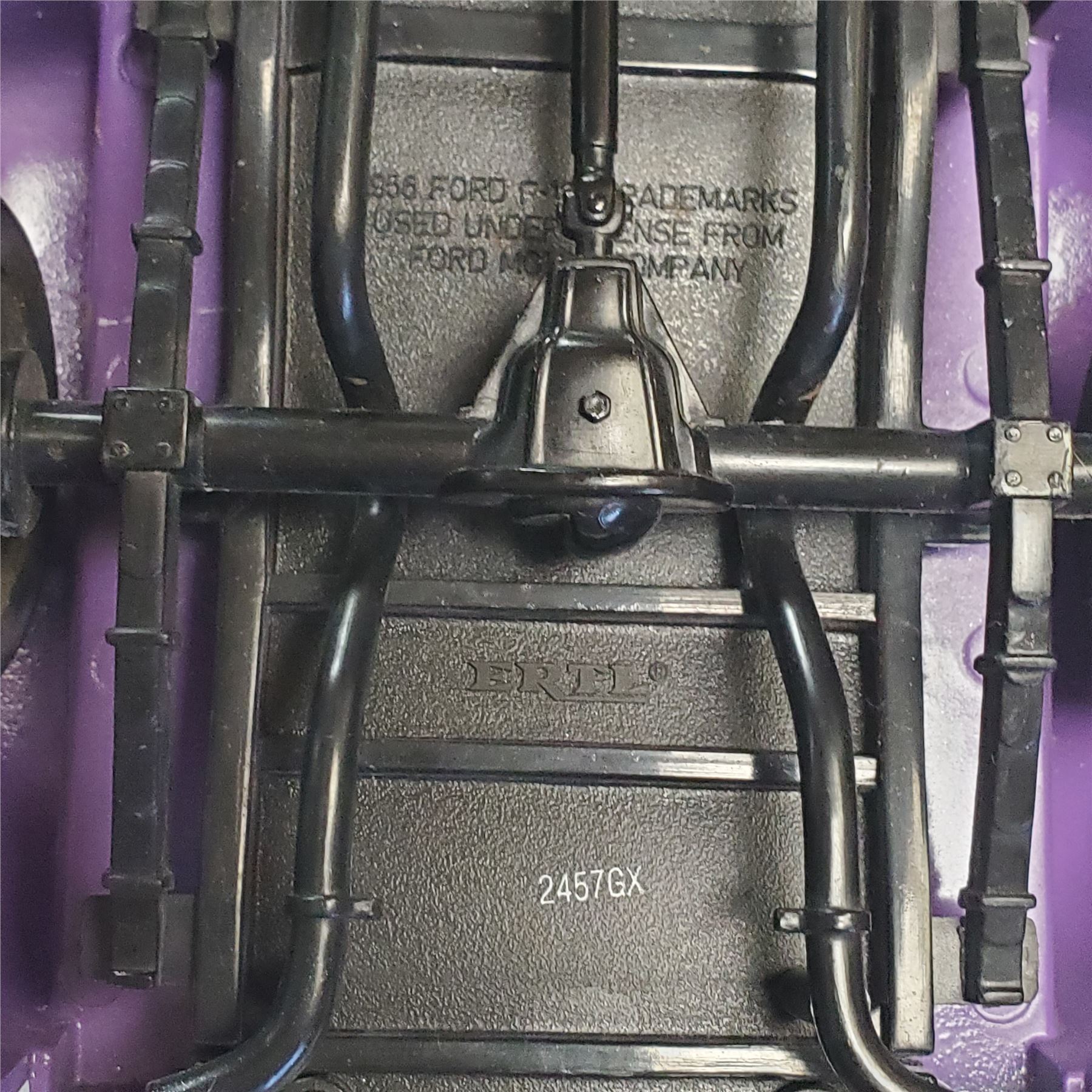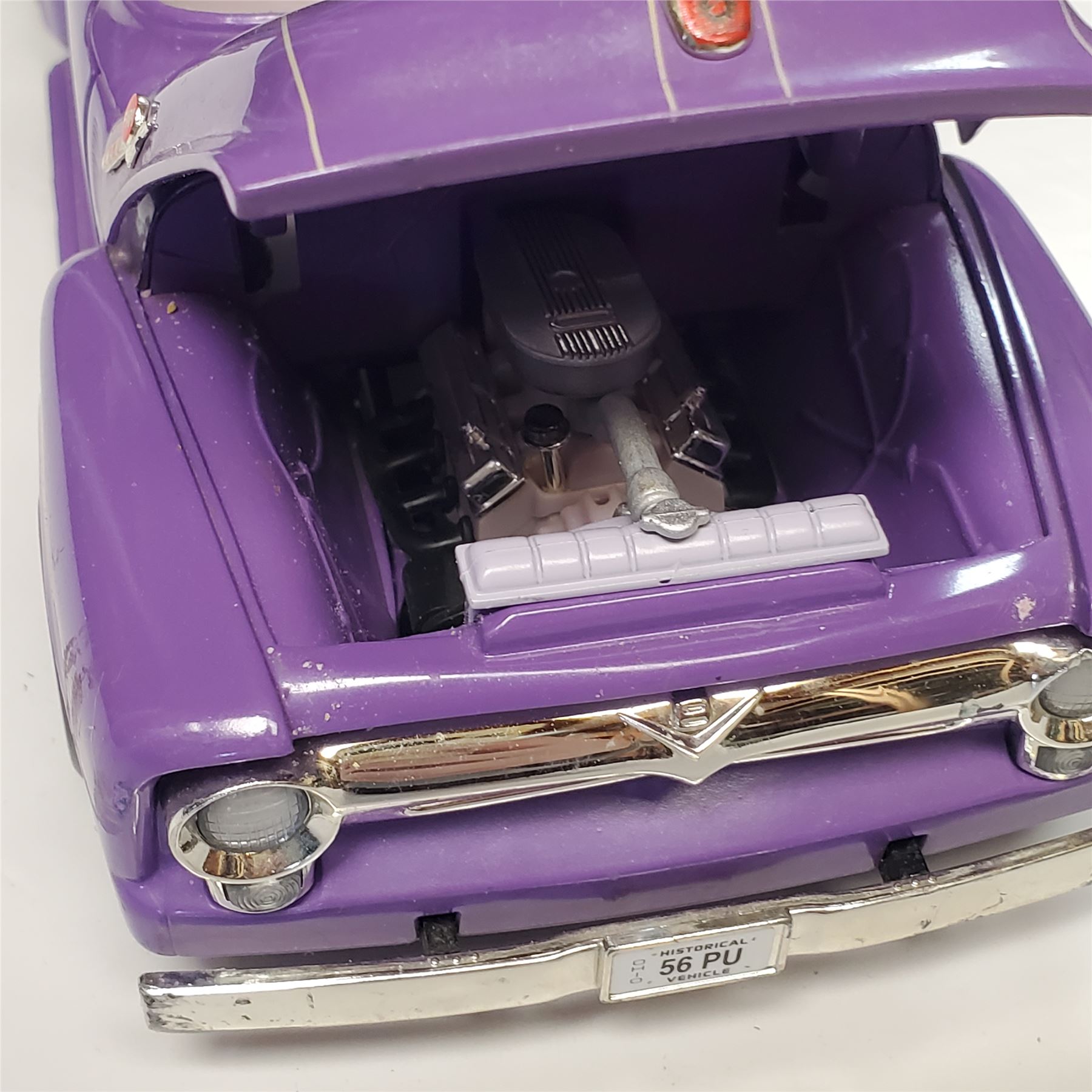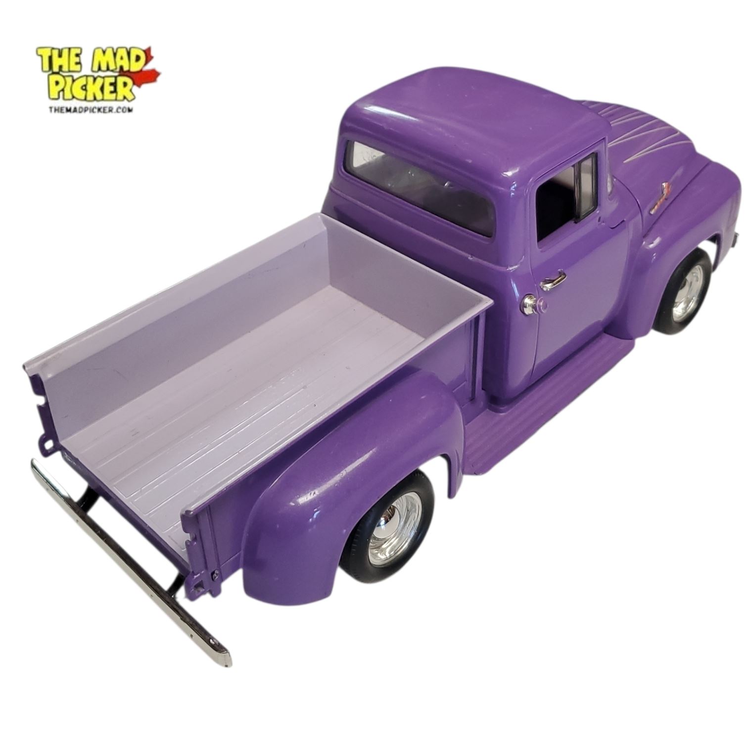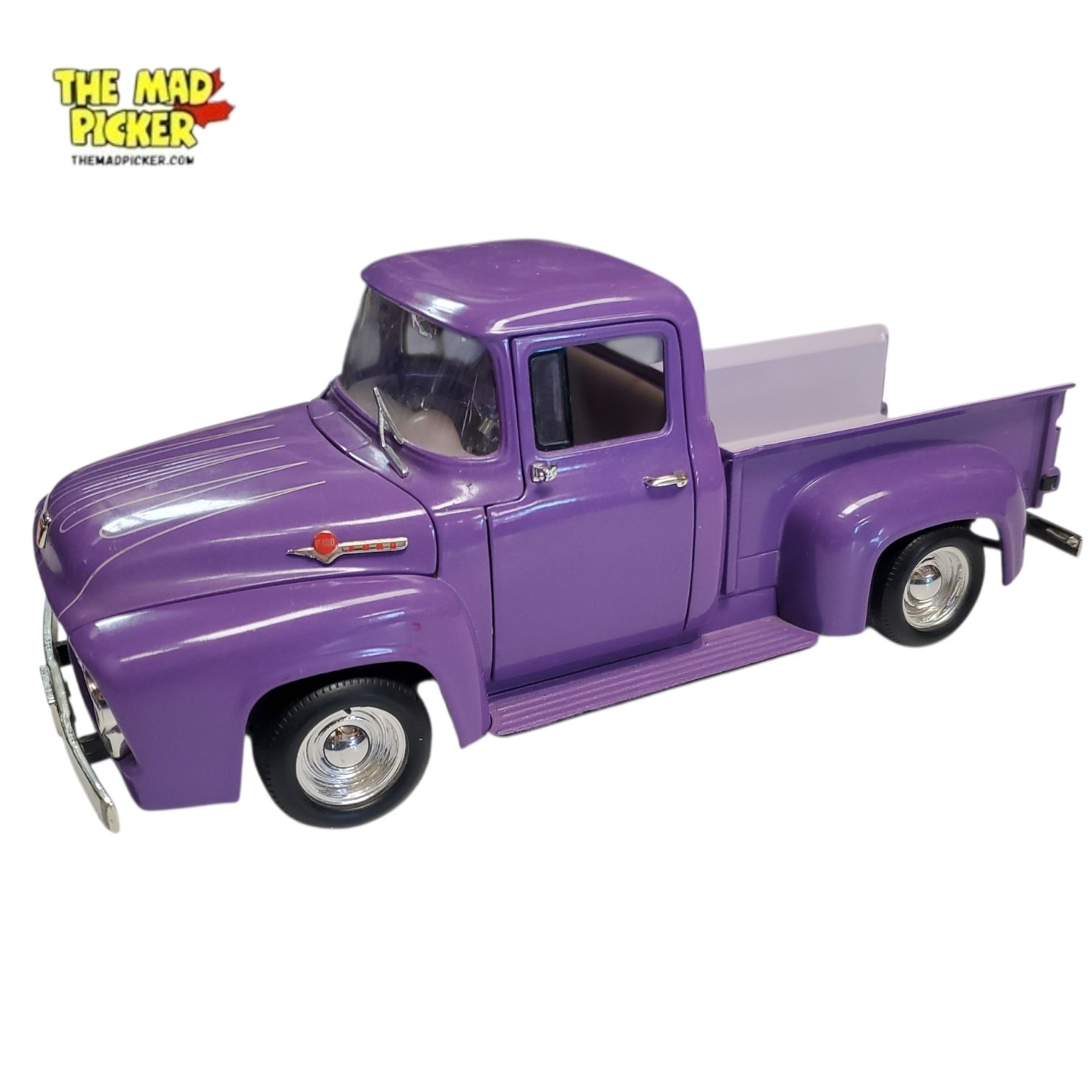 Ertl diecast model of a 1956 Ford F-100 Street Rod in 1:18 scale. Features detailed purple exterior, chrome accents, and custom street rod styling. Opening doors, hood, and functional steering. Precision-engineered detailing reflects the classic custom truck design.
