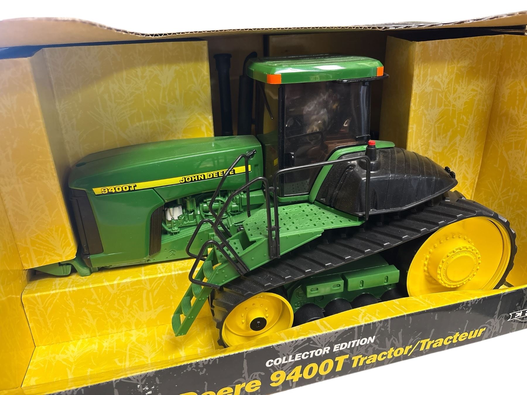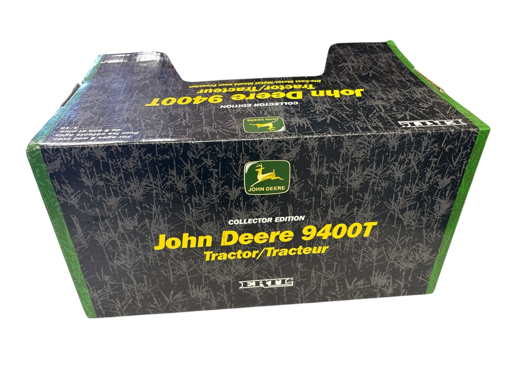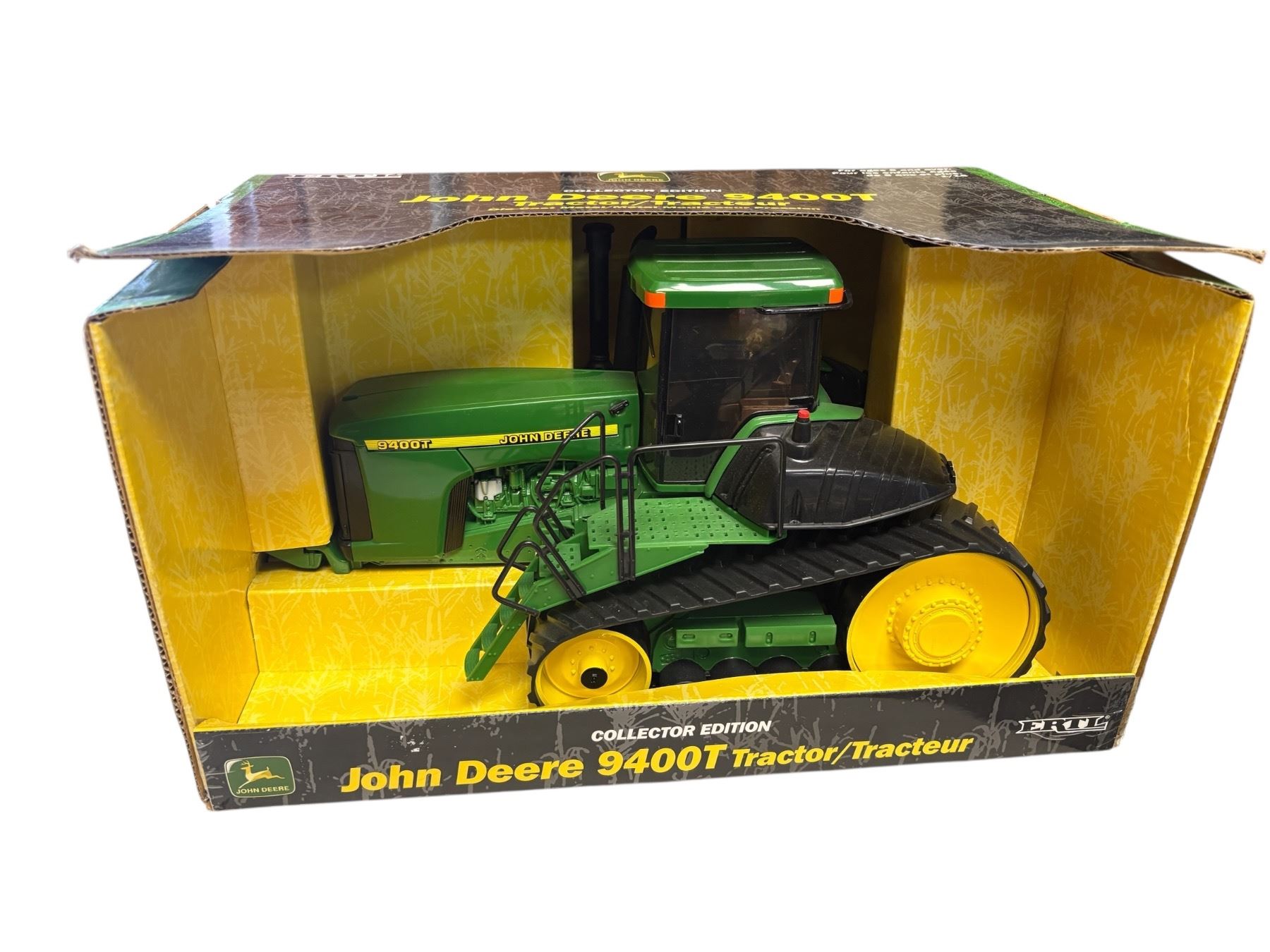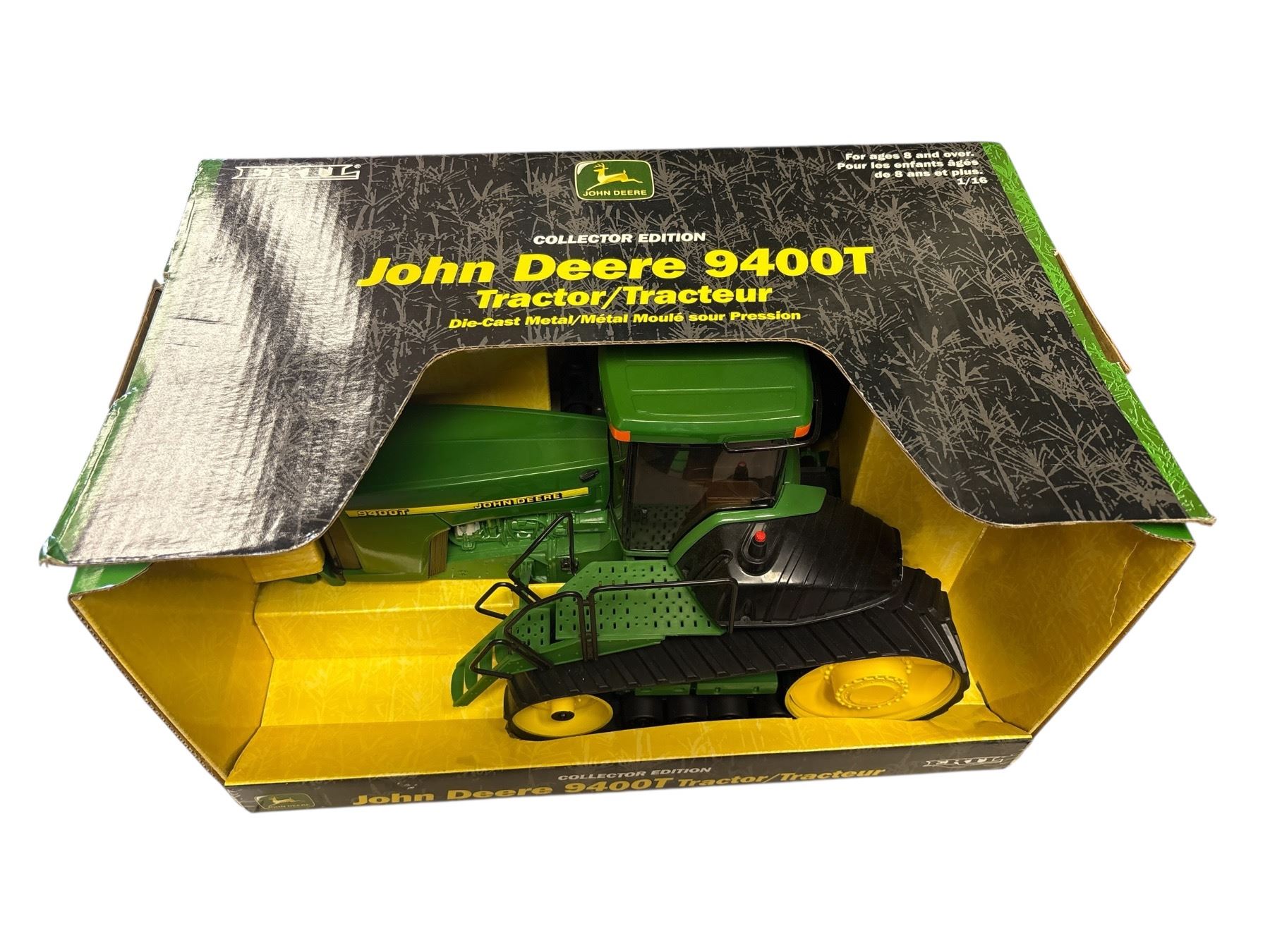 Ertl John Deere 9400T Tractor, Collector Edition, model number 15005. Features durable 1:16 scale diecast construction with authentic John Deere green and yellow paint. Detailed with rubber tracks, operator's cab, and realistic design elements. Produced as part of Ertl's Collector Edition series.
