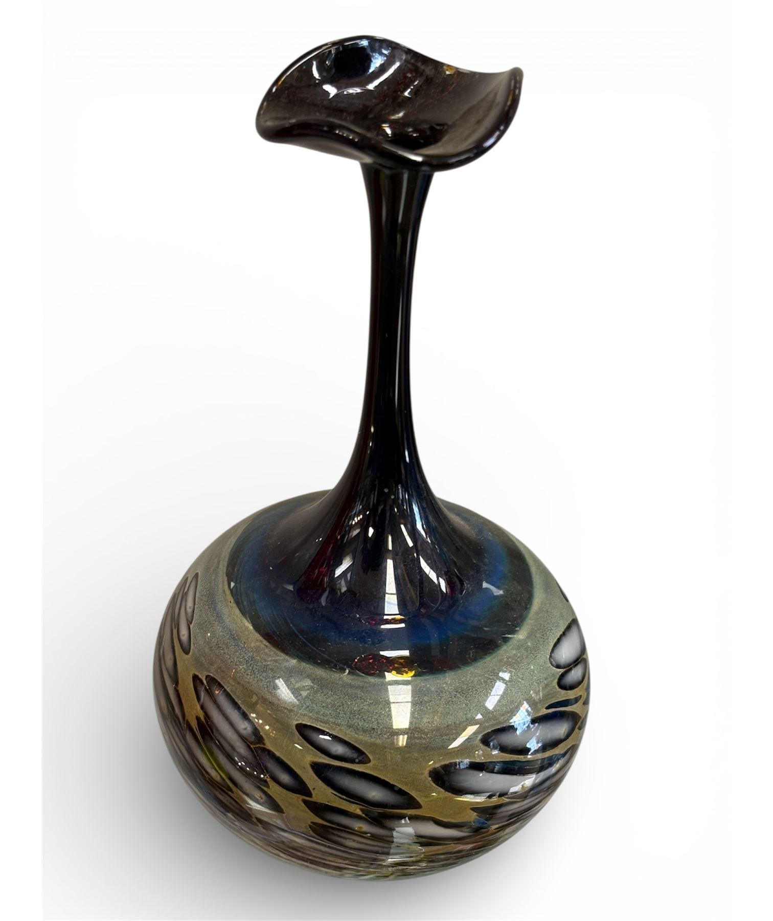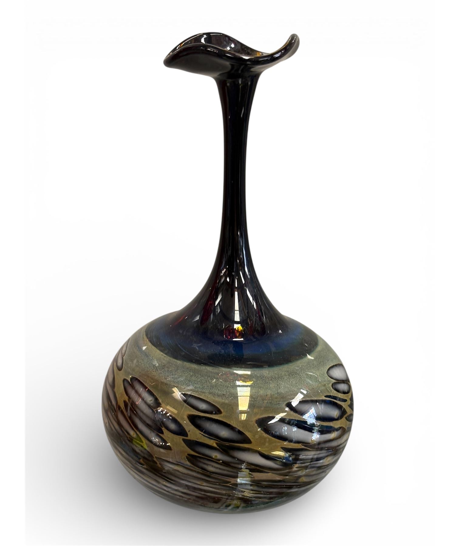 Studio art glass vase by German glass artist Erwin Eisch, renowned for his modern and expressive creations. Lightweight and delicate design, standing 8 inches tall. Signed 'Eisch' on the base, demonstrating authenticity. Eisch's works are significant in the art glass movement.