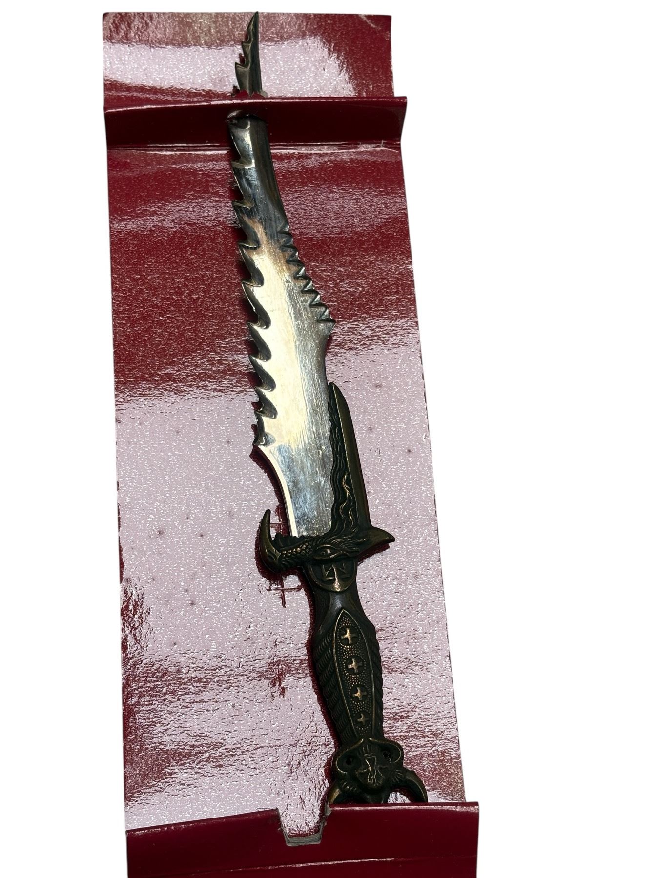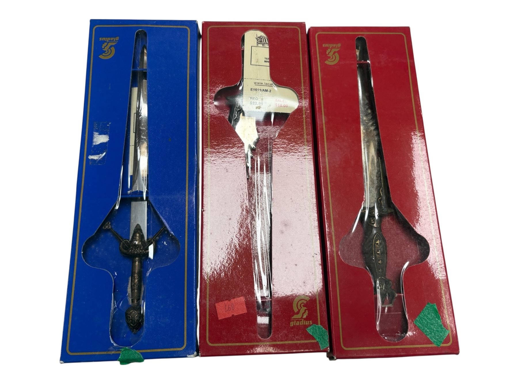 Set of 3 Art Gladius mini swords from Toledo, Spain. Crafted with detailed designs characteristic of traditional Spanish sword-making. Each sword measures approximately 10 inches in length. Ornamental pieces showcasing the craftsmanship of Toledo, a city renowned for its historical weaponry production.
