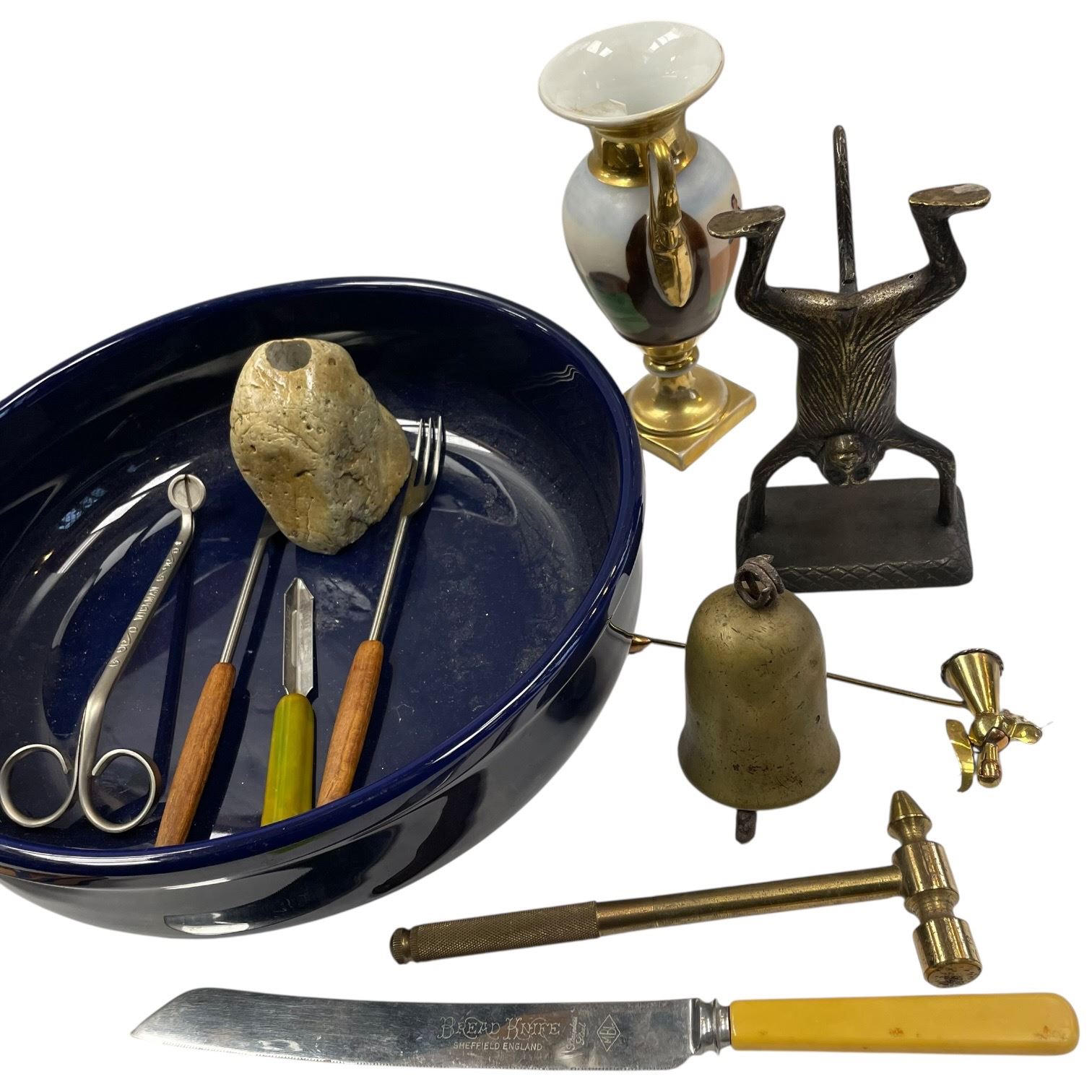 Estate auction collection featuring a dark blue ceramic decorative bowl containing smaller items, brass-toned metalware including a bell and figure sculpture, a metal hammer and file, a brass paperweight, a vintage dish, and other miscellaneous collectibles. Item is as pictured.