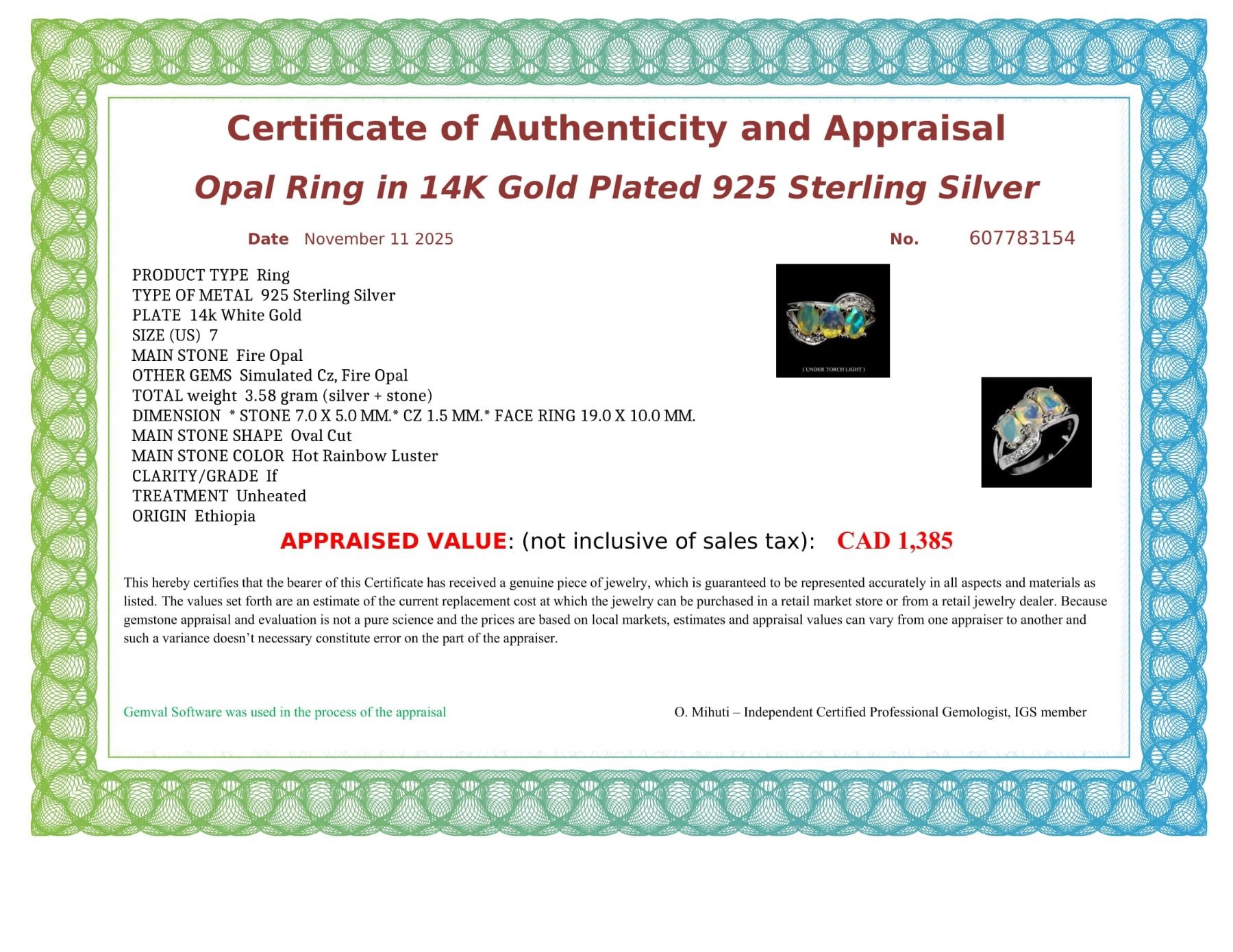 FIRE OPAL RING IN 14K WHITE PLATED GOLD OVER 925 STERLING SILVER -SIZE 7 - APPRAISED REPLACEMENT VALUE $ 1,385