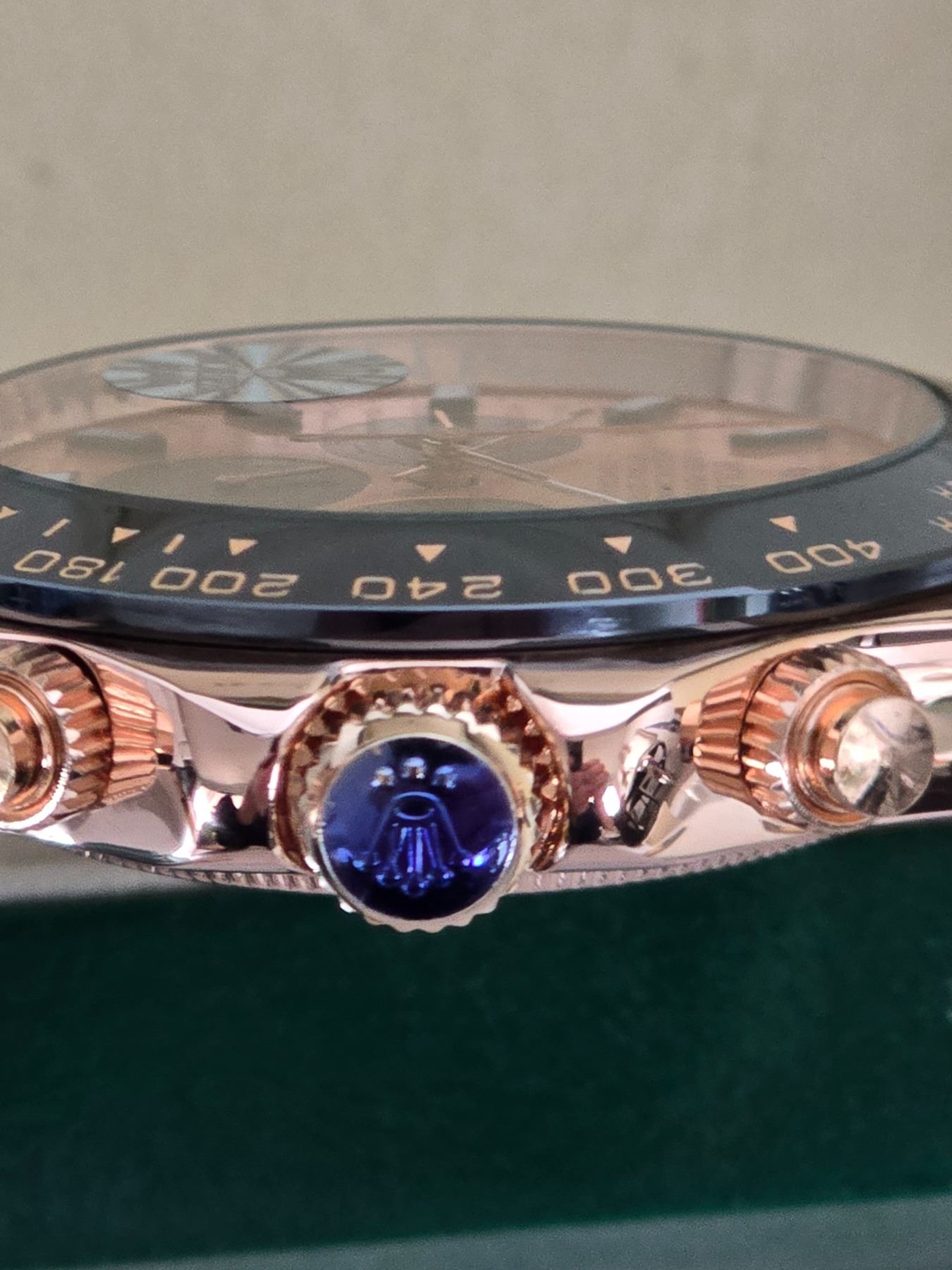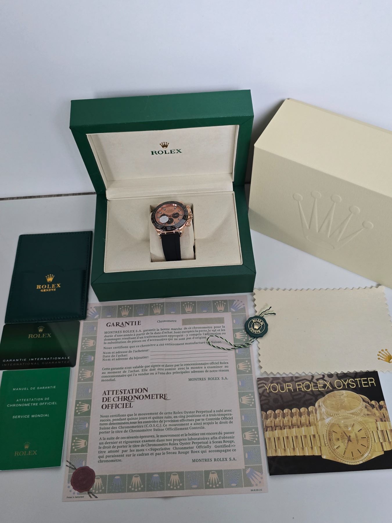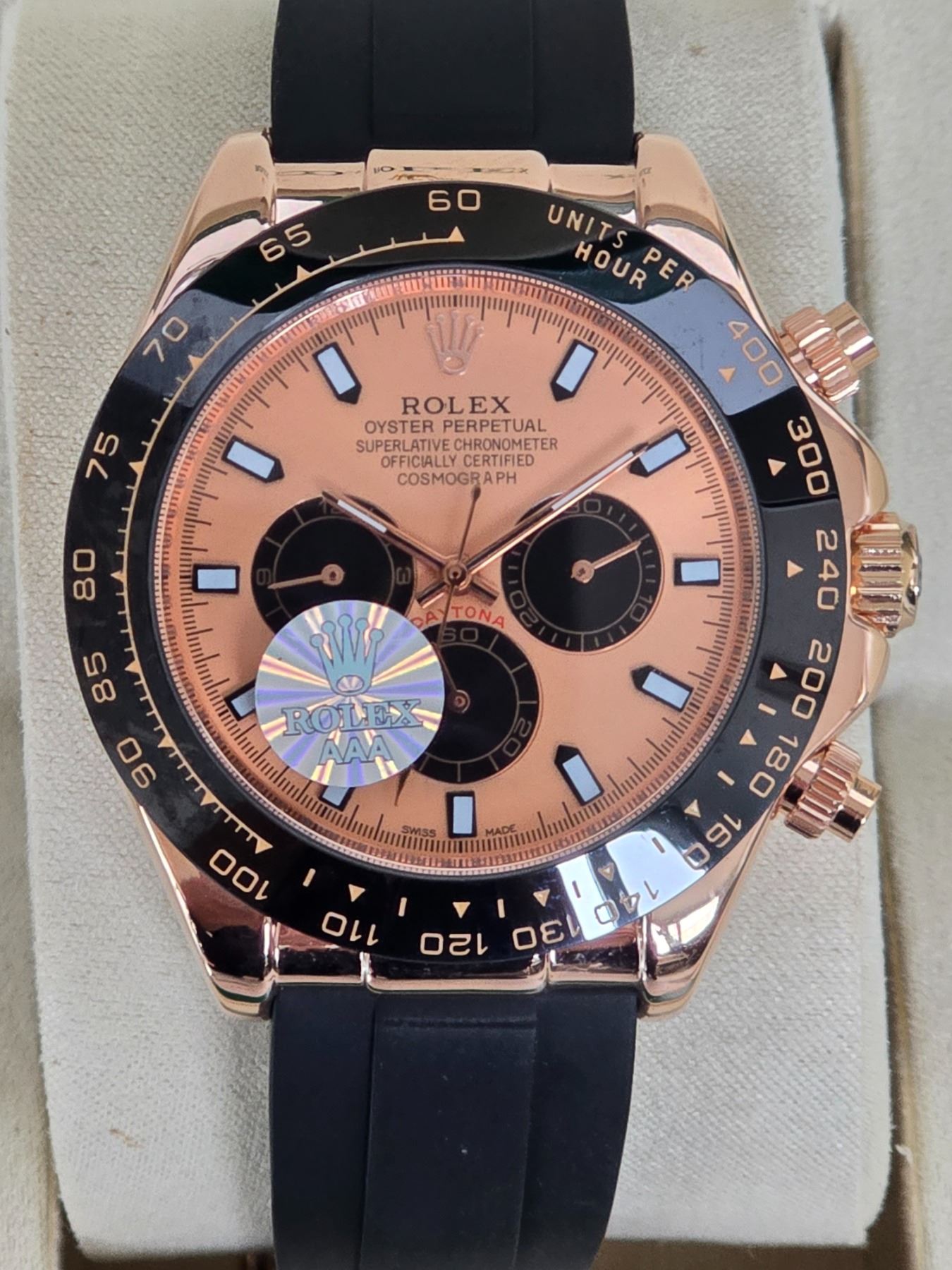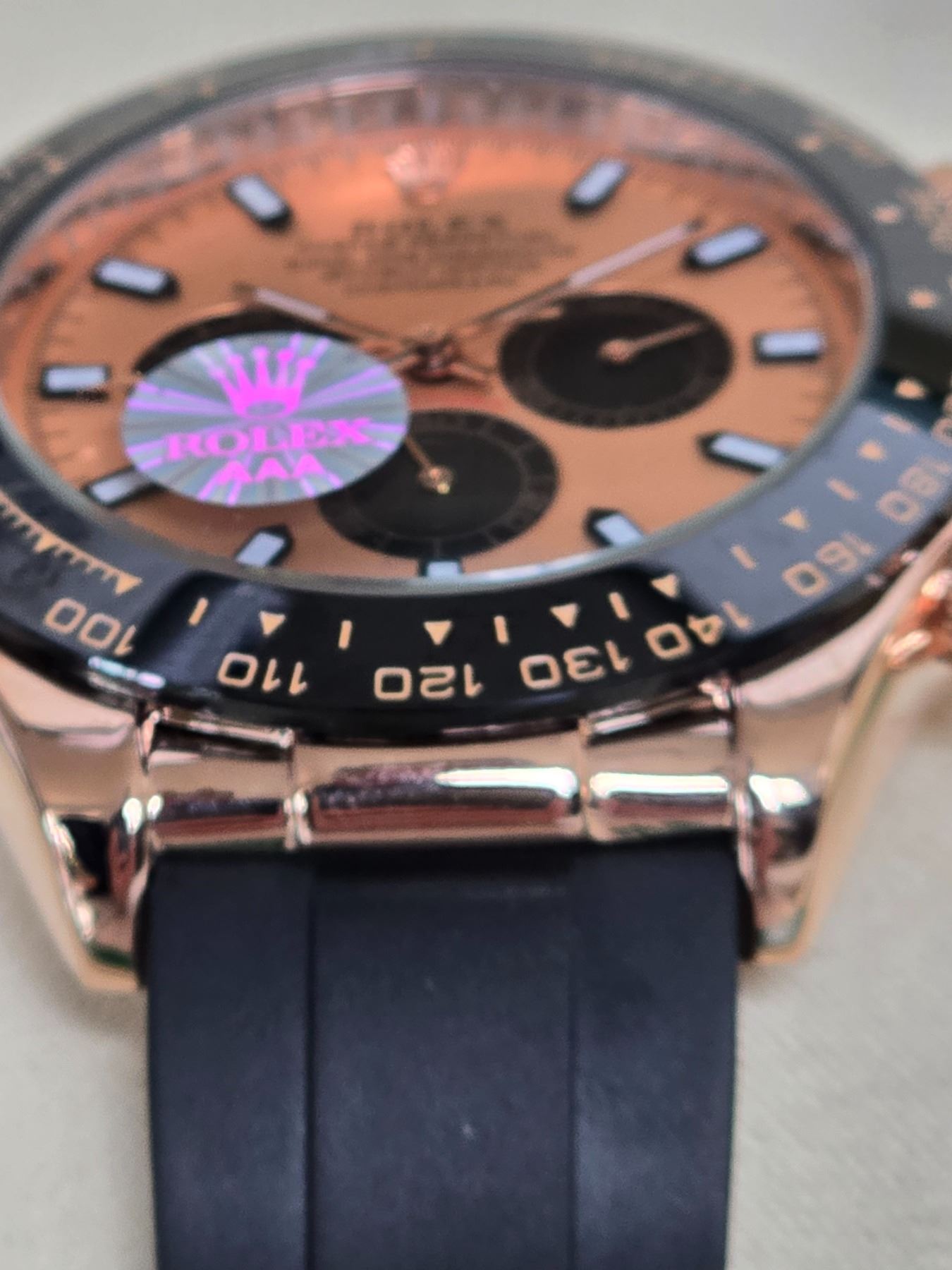 FULLY AUTOMATIC BRAND NEW ROLEX DAYTONA REF# 116523 40 MM HIGH END AAA REPLICA WATCH. EVEROSE GOLD DIAL, WITH BLACK SUB-DIALS, BLACK BEZEL. EVEROSE GOLD CASE AND CROWN. BLACK OYSTERFLEX BRACELET. FULL SET WITH BOX, PAPERS AND BAG.